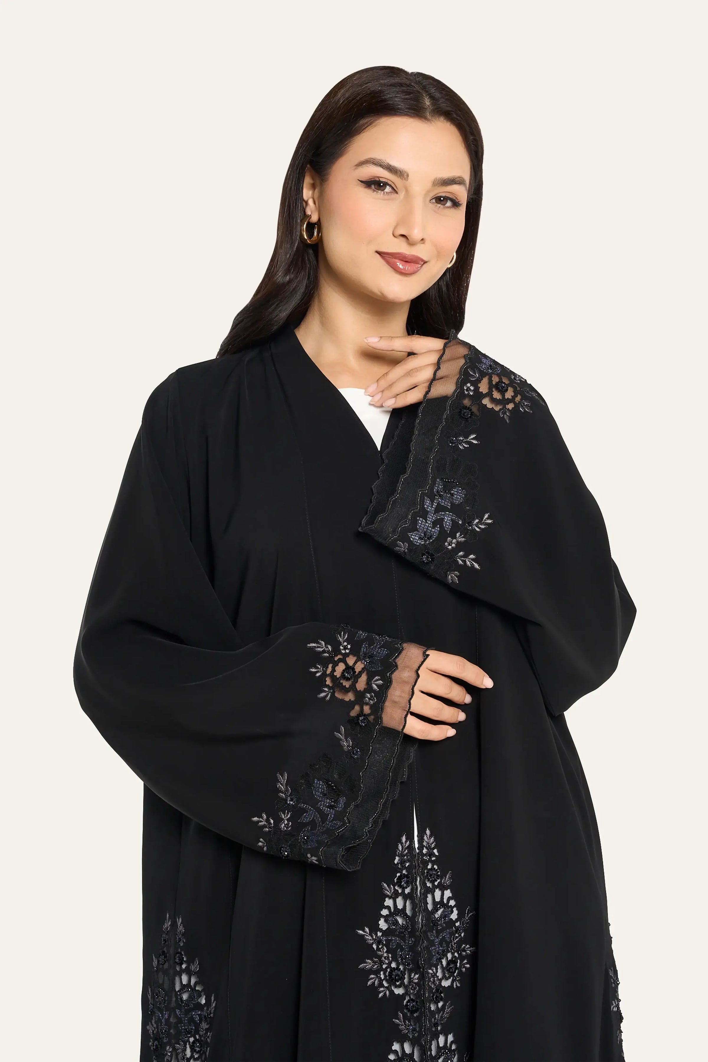 ارتقي بإطلالتك المحتشمة مع عباية ندى من تصميم لوزان، قطعة رائعة تجمع بين الأصالة والحداثة. مصنوعة من قماش ندى الفاخر، تتميز هذه العباية بتطريزات زهرية دقيقة من الدانتيل تضفي لمسة من الرقي على ملابسك اليومية. يمنحها لونها الأسود الغني تنوعًا وجاذبية خالدة، بينما تضفي تطريزات الدانتيل الرقيقة لمسة جمالية دون المساس بالحشمة. مثالية للمناسبات الخاصة أو لإطلالات يومية أنيقة، تنسدل هذه العباية بانسيابية رائعة وتوفر راحة فائقة طوال اليوم. عباية ندى من تصميم لوزان هي الخيار الأمثل لمن يقدرون الحرفية العالية والتصميم الراقي، فهي قطعة أساسية في خزانة ملابسك تُبرز أسلوبك الشخصي بأناقة ورقي.