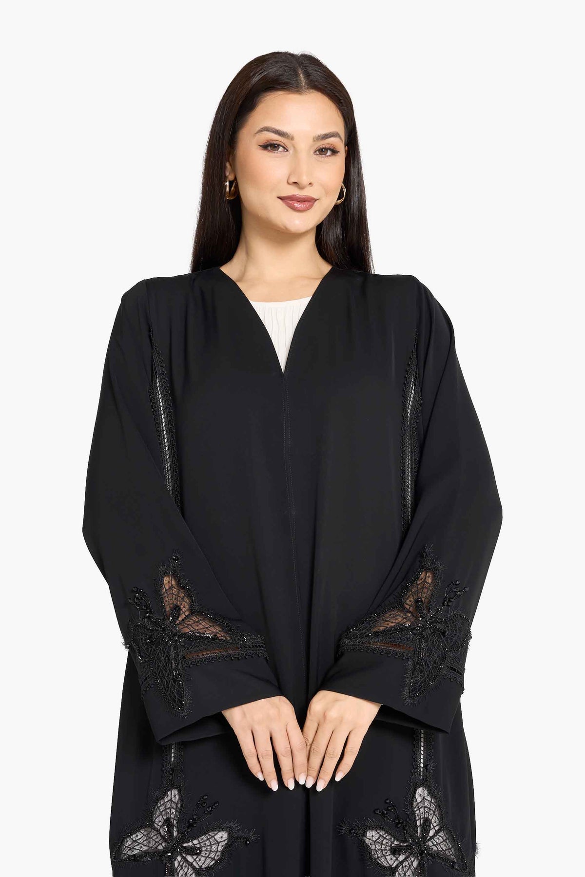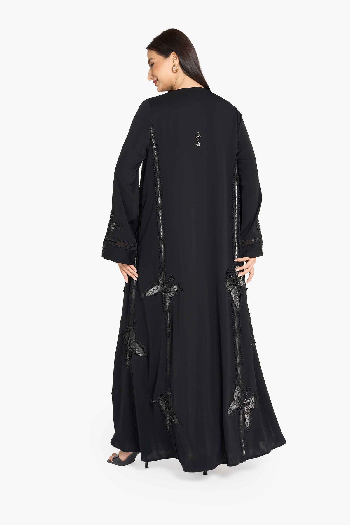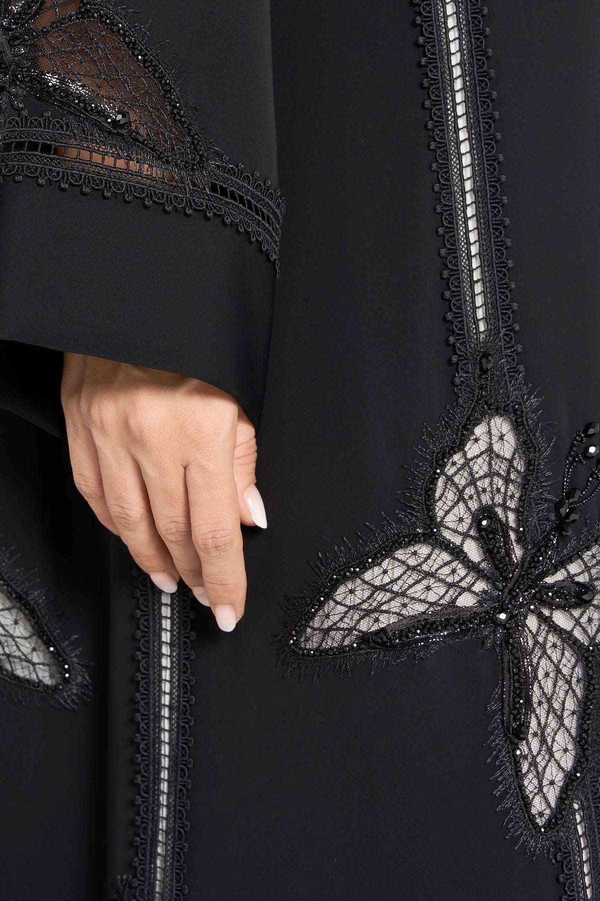 عباية لوزان، مصنوعة من قماش ندى فاخر مع لمسات من الدانتيل الرقيق، ومزينة بشكل رائع بالكريستال والخرز، تنضح بالأناقة الراقية والذوق الرفيع.