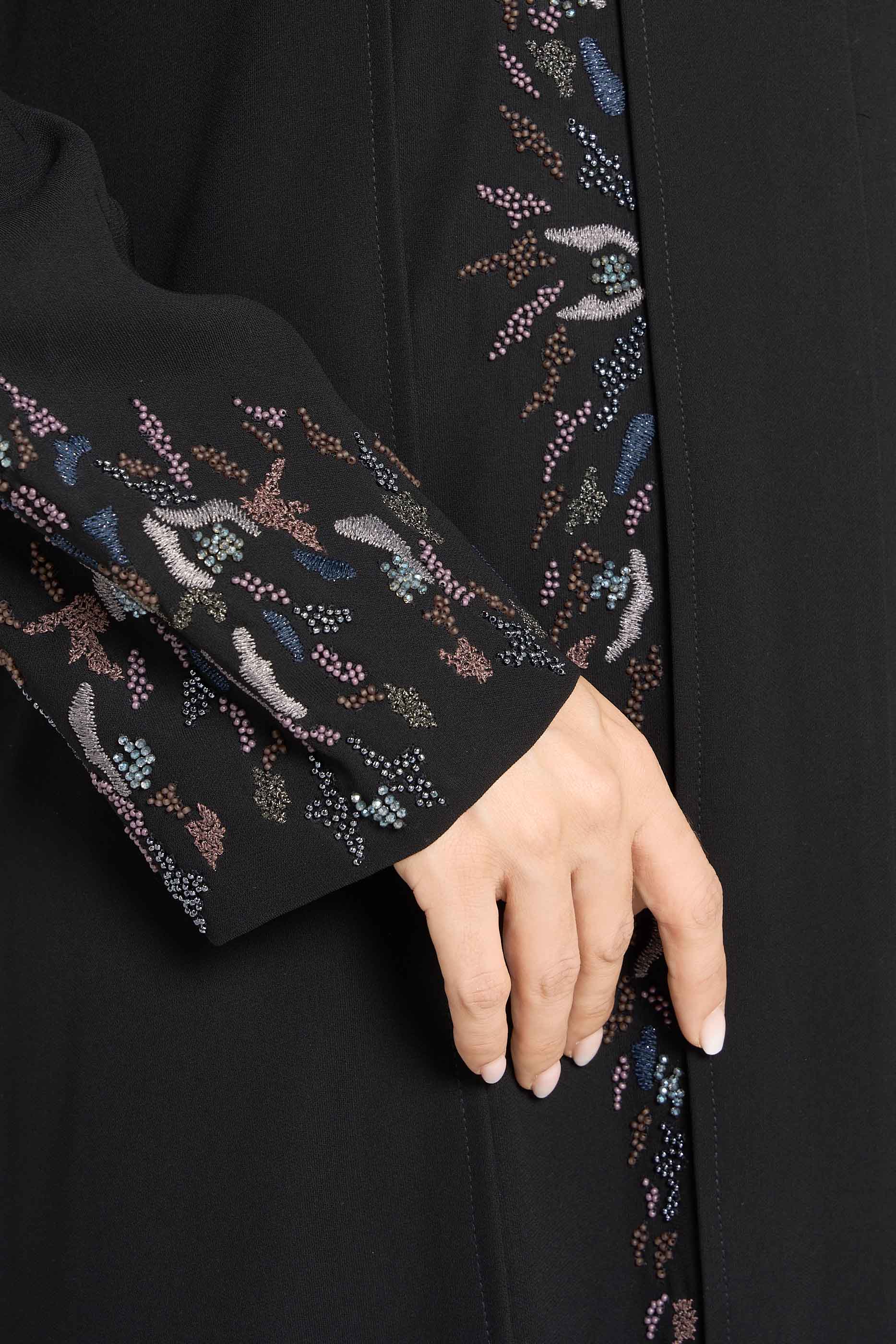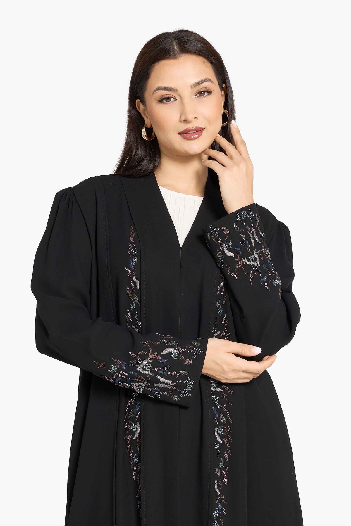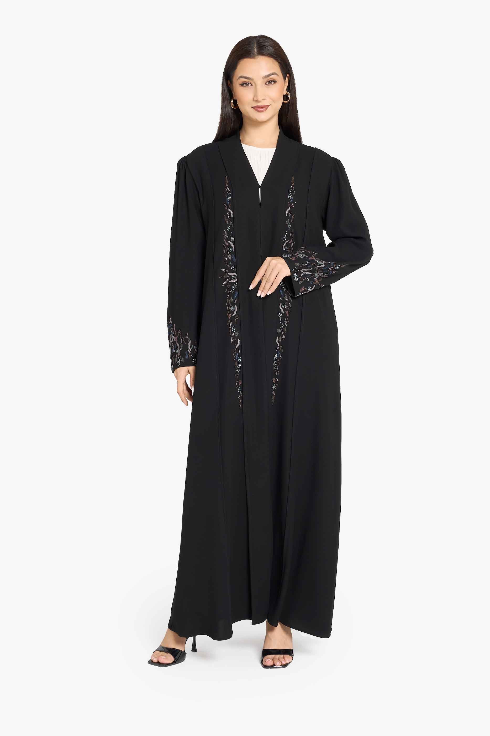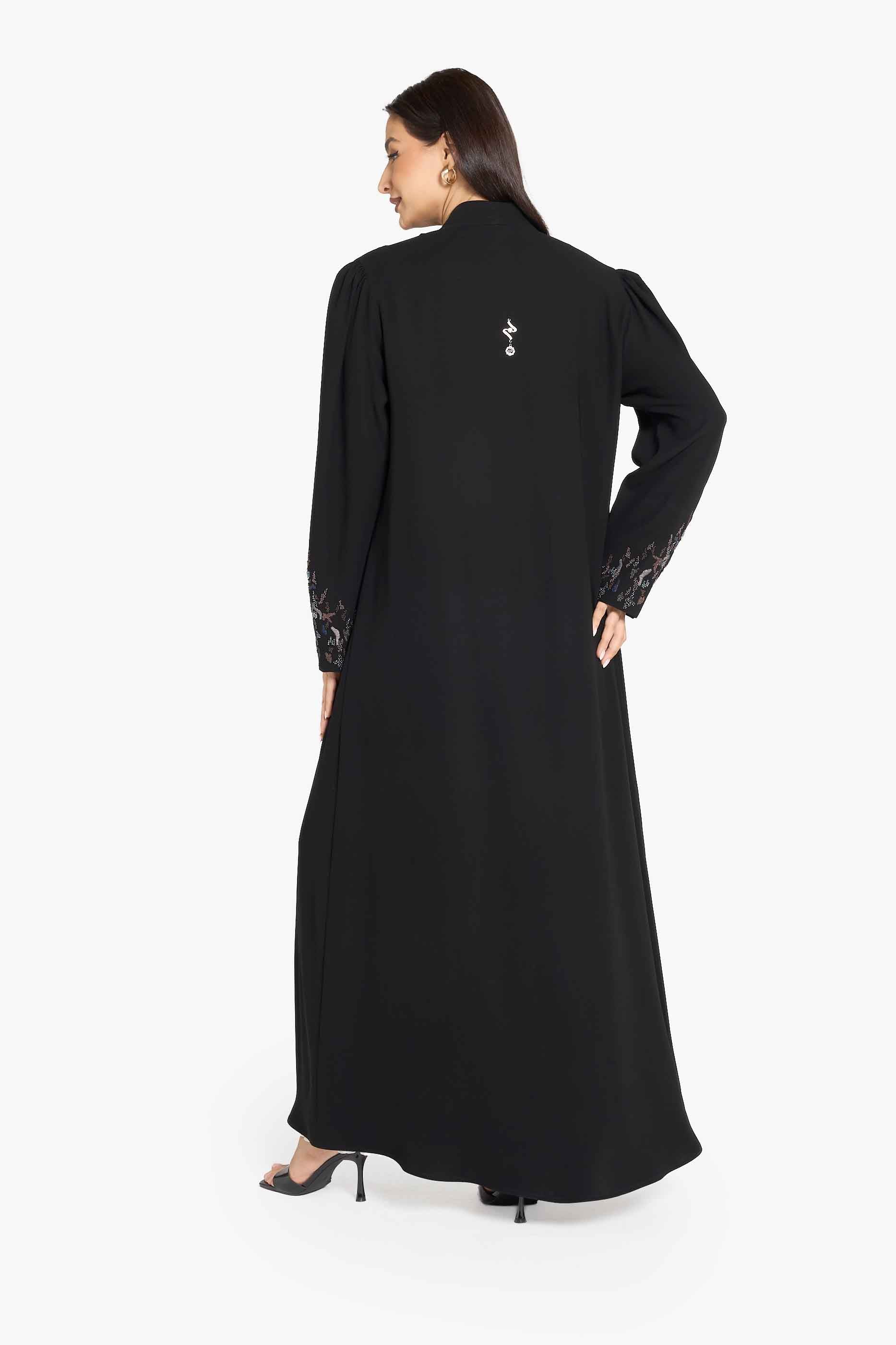 عباية لوزان، مصنوعة من قماش الكريب الفاخر، وتتميز بتطريز تجريدي ومزينة بدقة بالكريستال، مما يضفي عليها أناقة عصرية ورقيًا راقيًا.