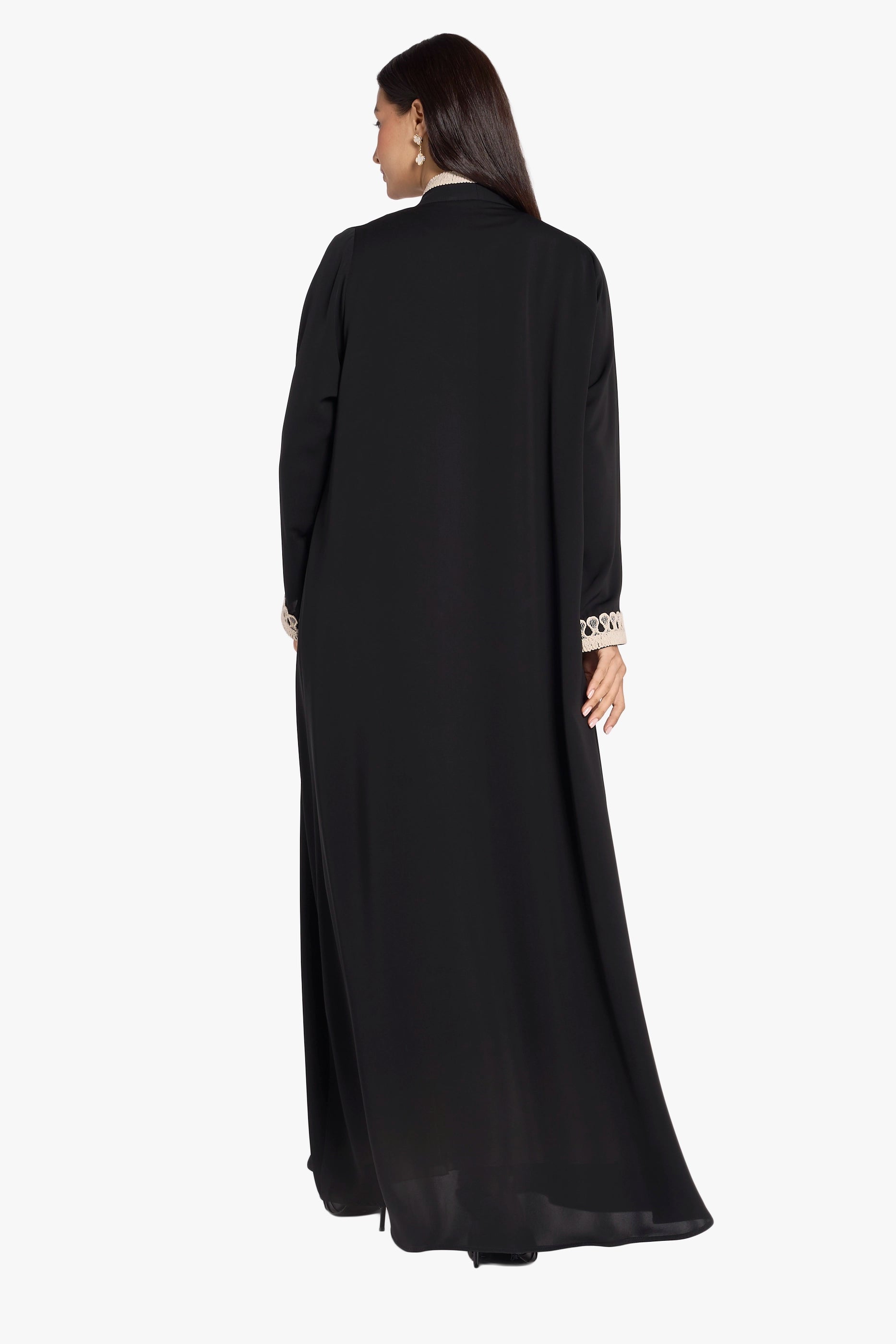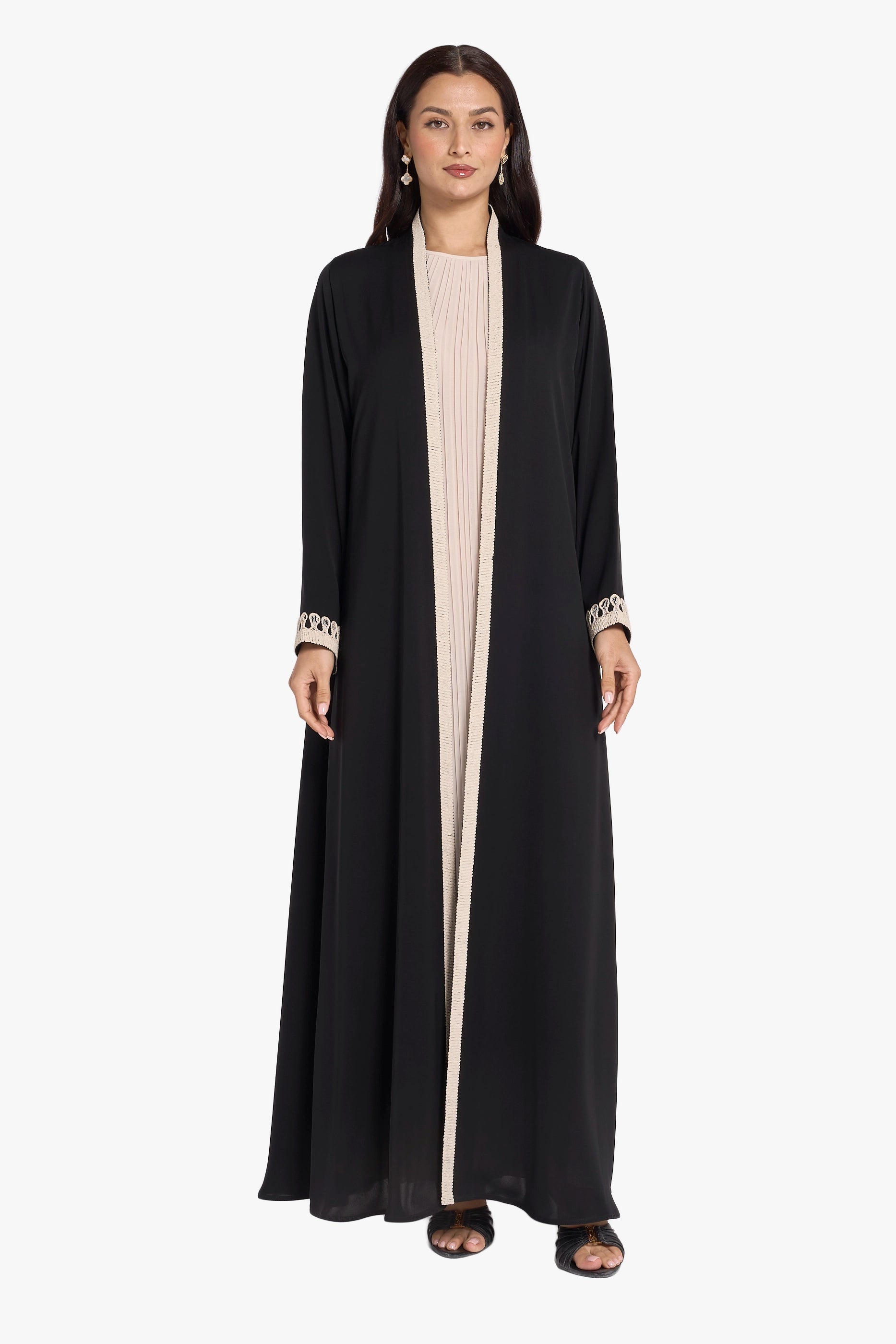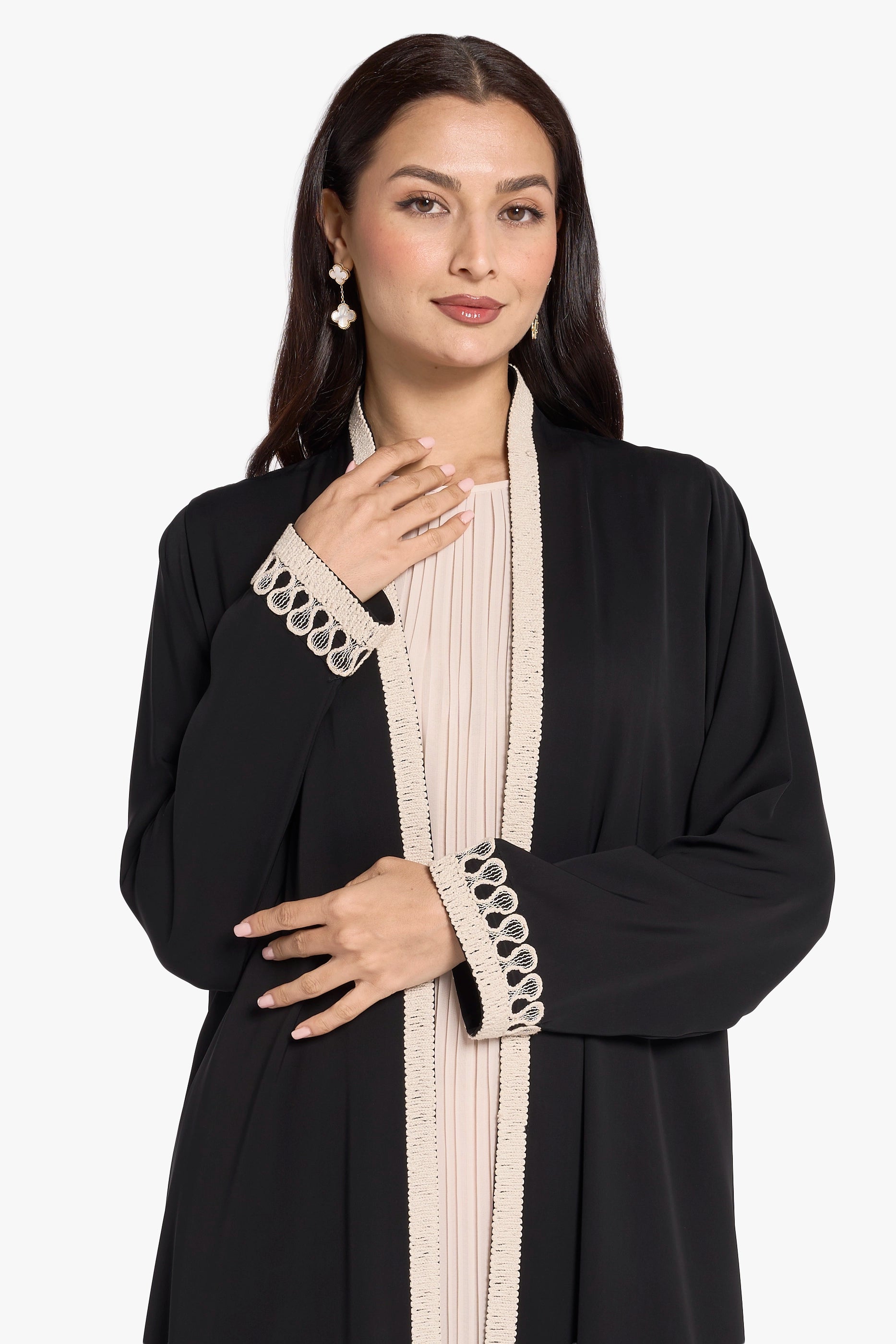 تتميز عباية أوشا بتطريز أنيق على الأكمام وتفاصيل دقيقة على الجهة الأمامية، تجمع بين الفن والأناقة الراقية. تُضفي هذه الزخرفة اليدوية لمسةً من الأناقة على العباءة، مقدمةً خيارًا راقيًا لمن يُقدّرن التقاليد والأناقة العصرية المحتشمة.