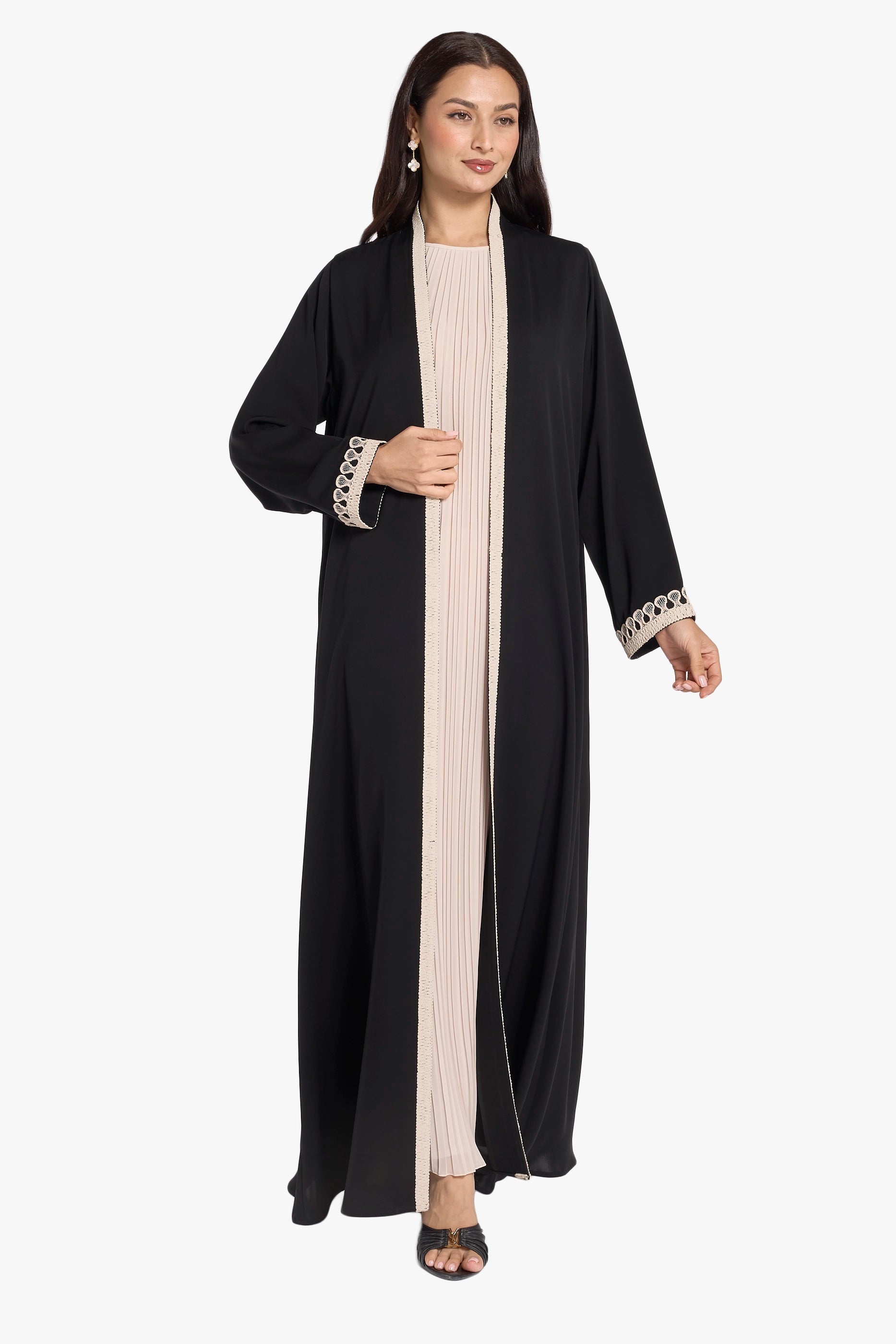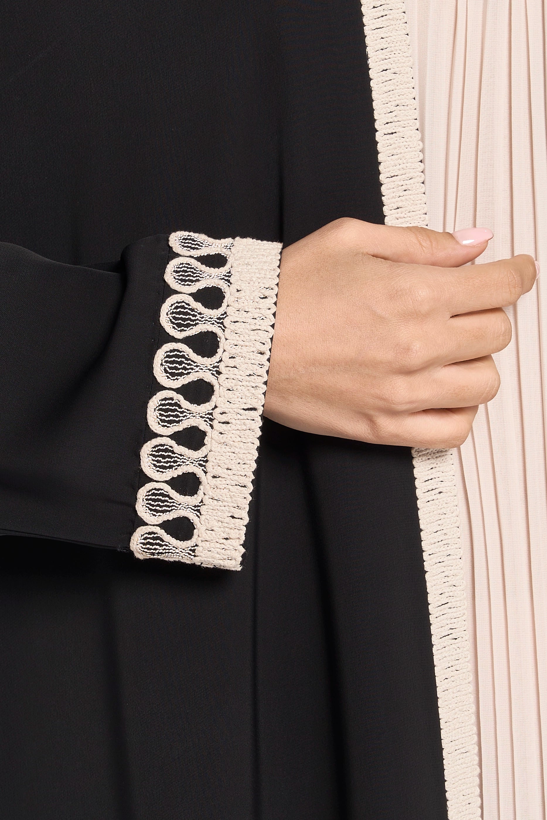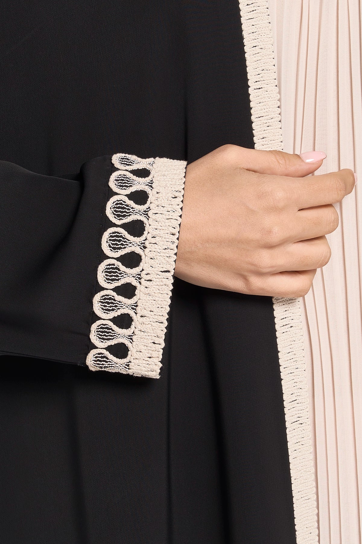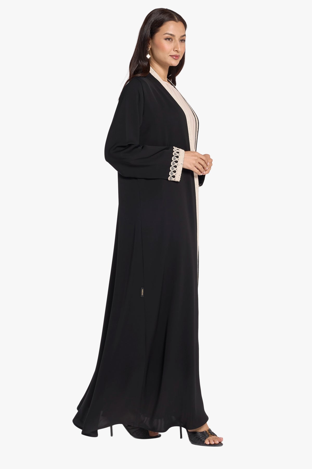 تتميز عباية أوشا بتطريز أنيق على الأكمام وتفاصيل دقيقة على الجهة الأمامية، تجمع بين الفن والأناقة الراقية. تُضفي هذه الزخرفة اليدوية لمسةً من الأناقة على العباءة، مقدمةً خيارًا راقيًا لمن يُقدّرن التقاليد والأناقة العصرية المحتشمة.