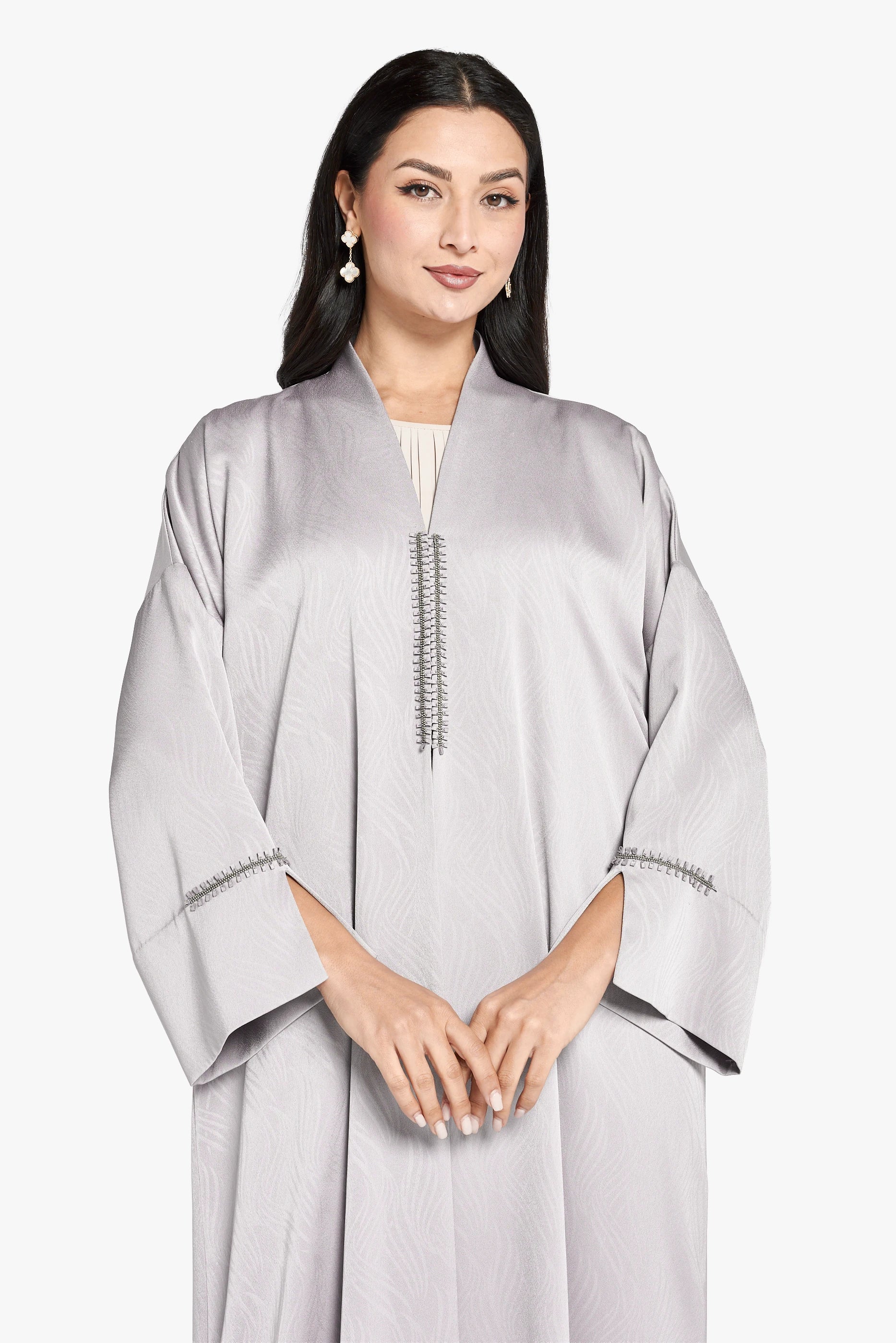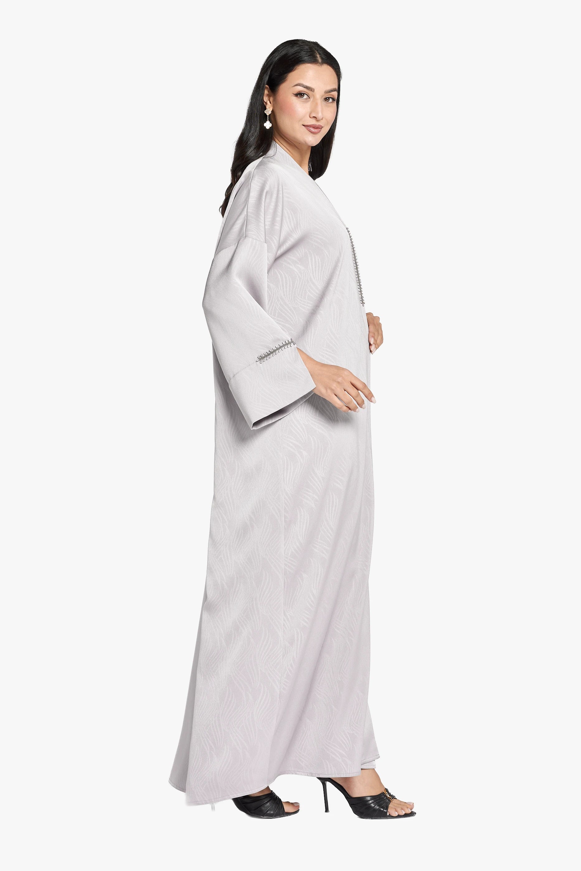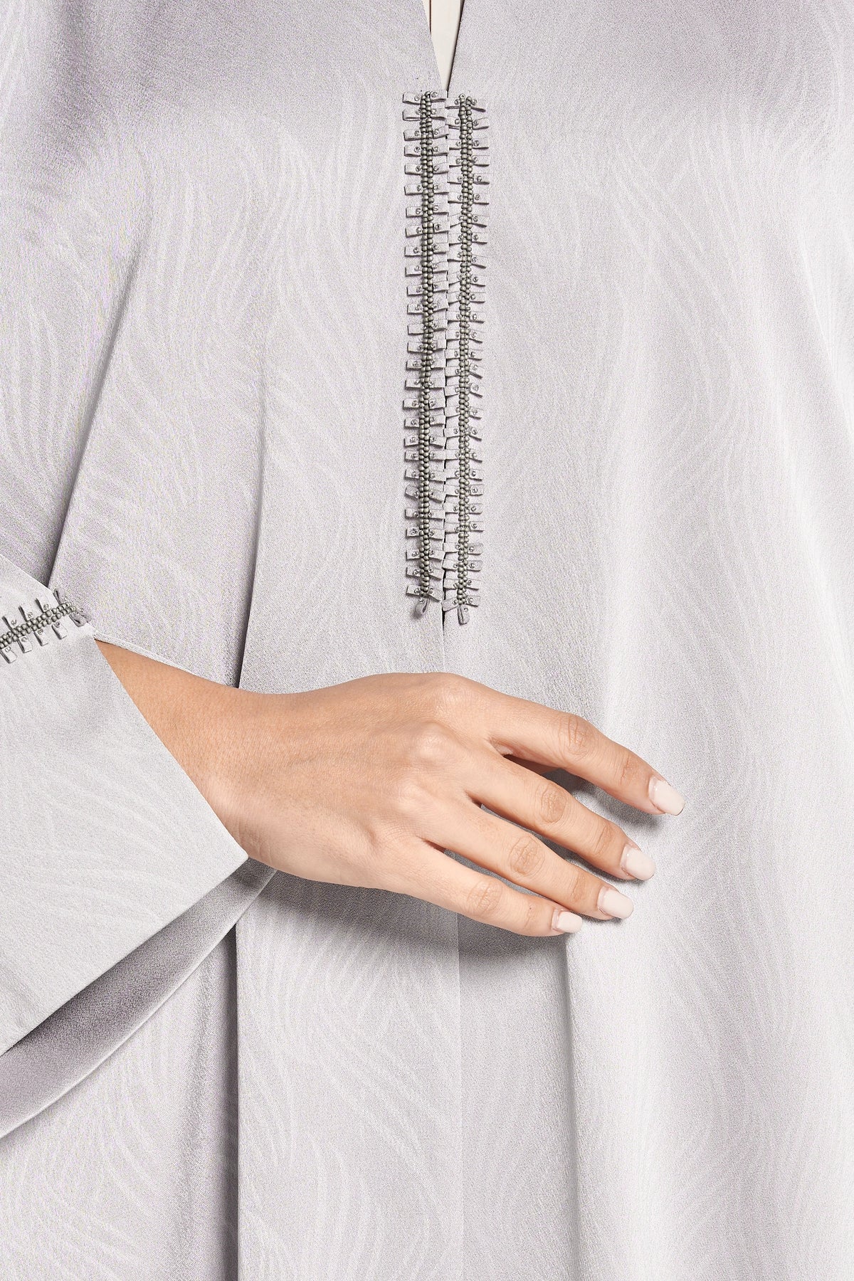 تتميز عباية أوشا OS-383 بقماش جاكار متناغم أنيق وتصميم عصري منسدل على الكتفين لإطلالة أنيقة ومريحة. مزينة بتطريز ثلاثي الأبعاد مقطوع بالليزر، معزز بالكريستال والخرز، مما يمنحها مظهرًا أنيقًا يأسر الضوء ببراعة. يوفر هذا التصميم الراحة والجماليات الفريدة، وهو مثالي لمن يبحث عن الفخامة البسيطة مع حرفية عالية.