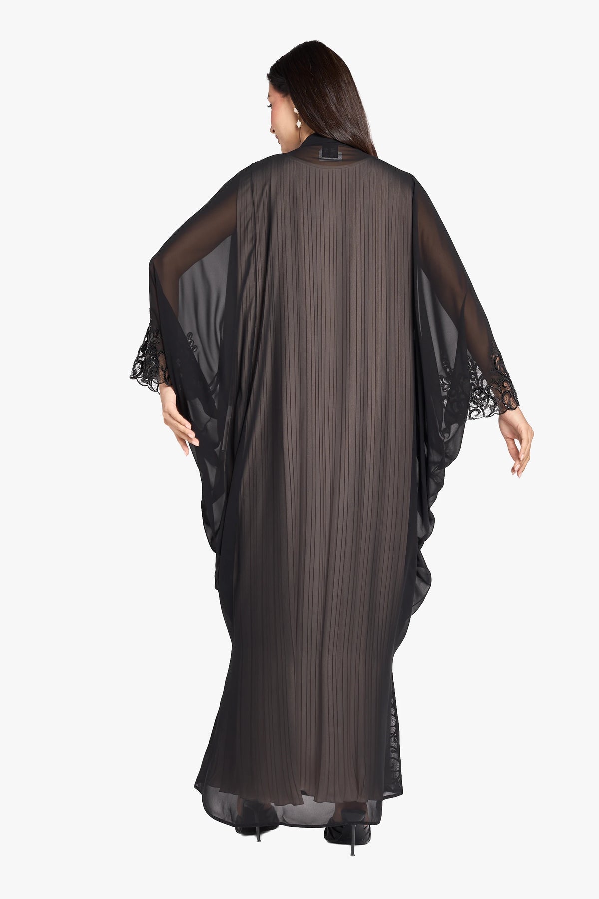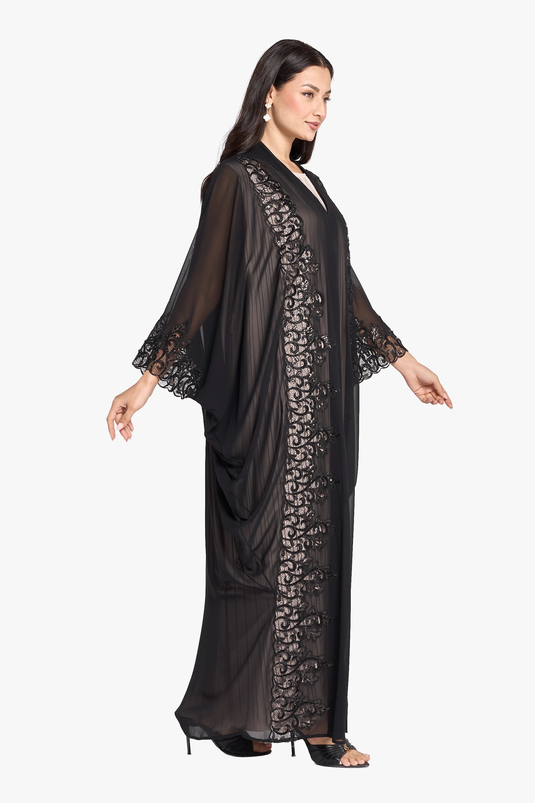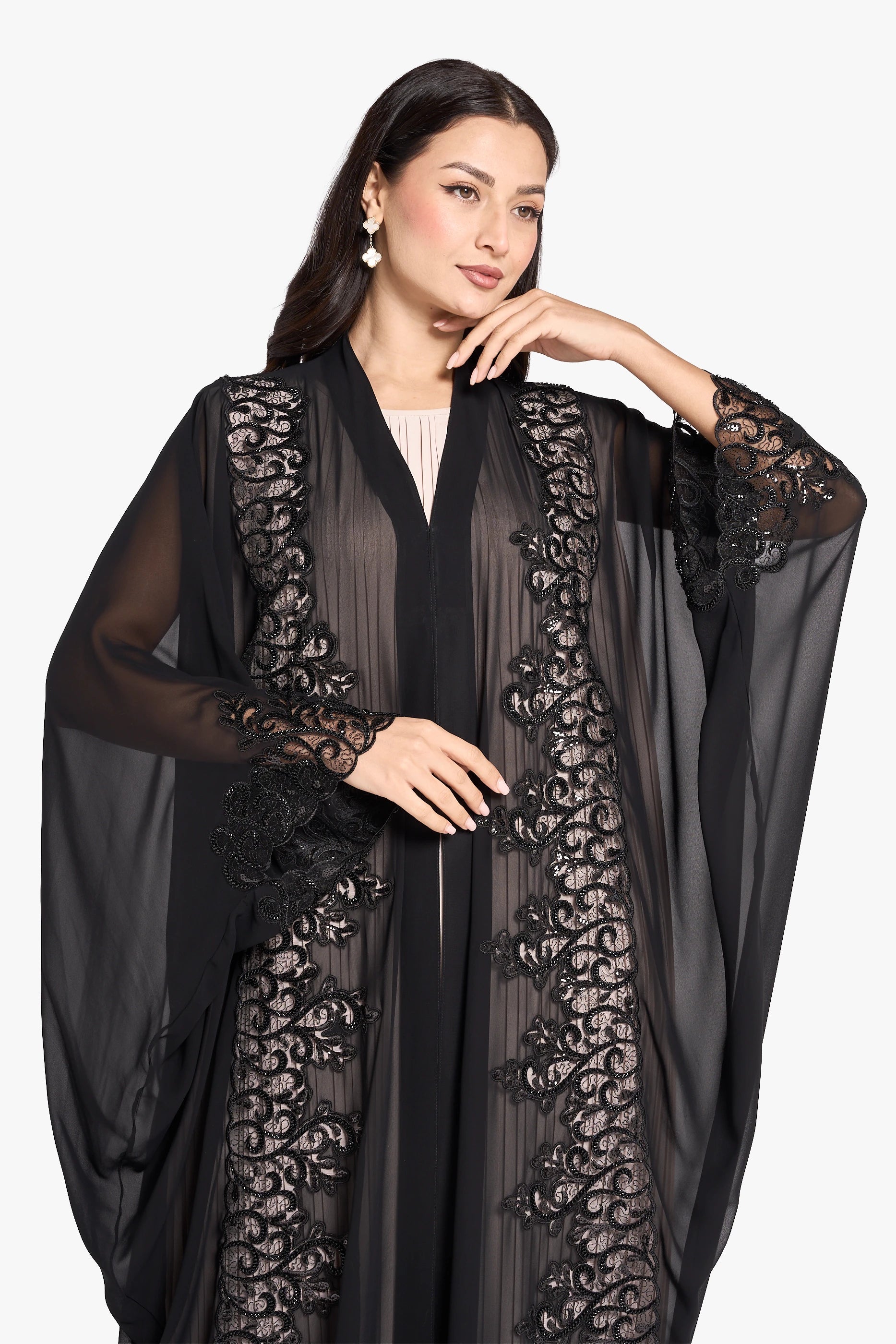 عباية أوشا OS-393 مصنوعة بمهارة من الشيفون خفيف الوزن، وتتميز بأكمام أنيقة واسعة توفر الراحة والحركة. زُيّنت واجهتها وأكمامها بتطريزات دقيقة، مما يمنحها إطلالة راقية وعصرية، مثالية لحفلات الزفاف. تجمع هذه العباءة بين التصميم الرقيق والتطريز الأنيق، مما يجعلها خيارًا راقيًا للمناسبات الخاصة.