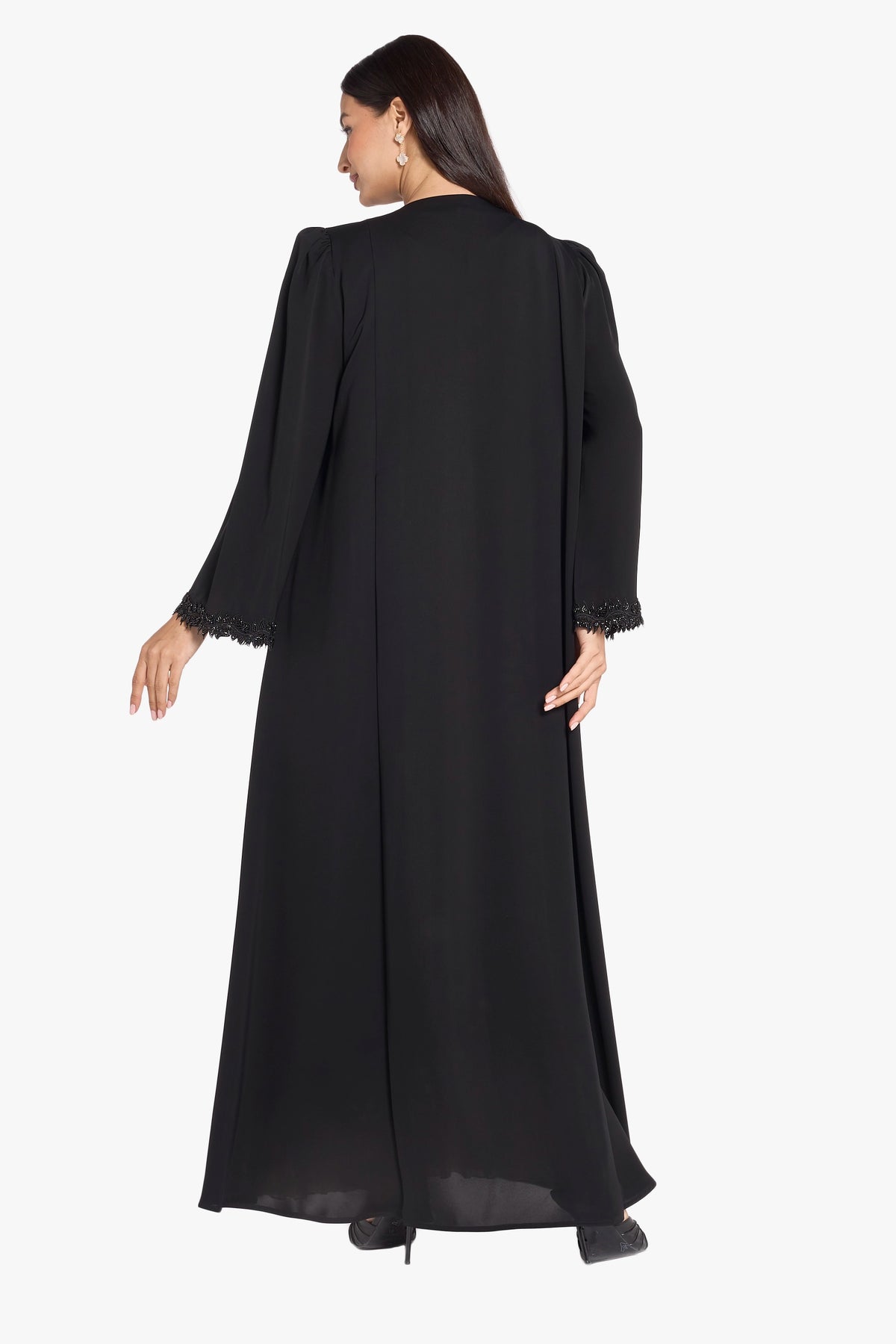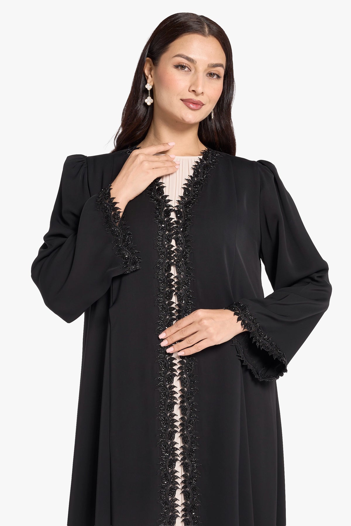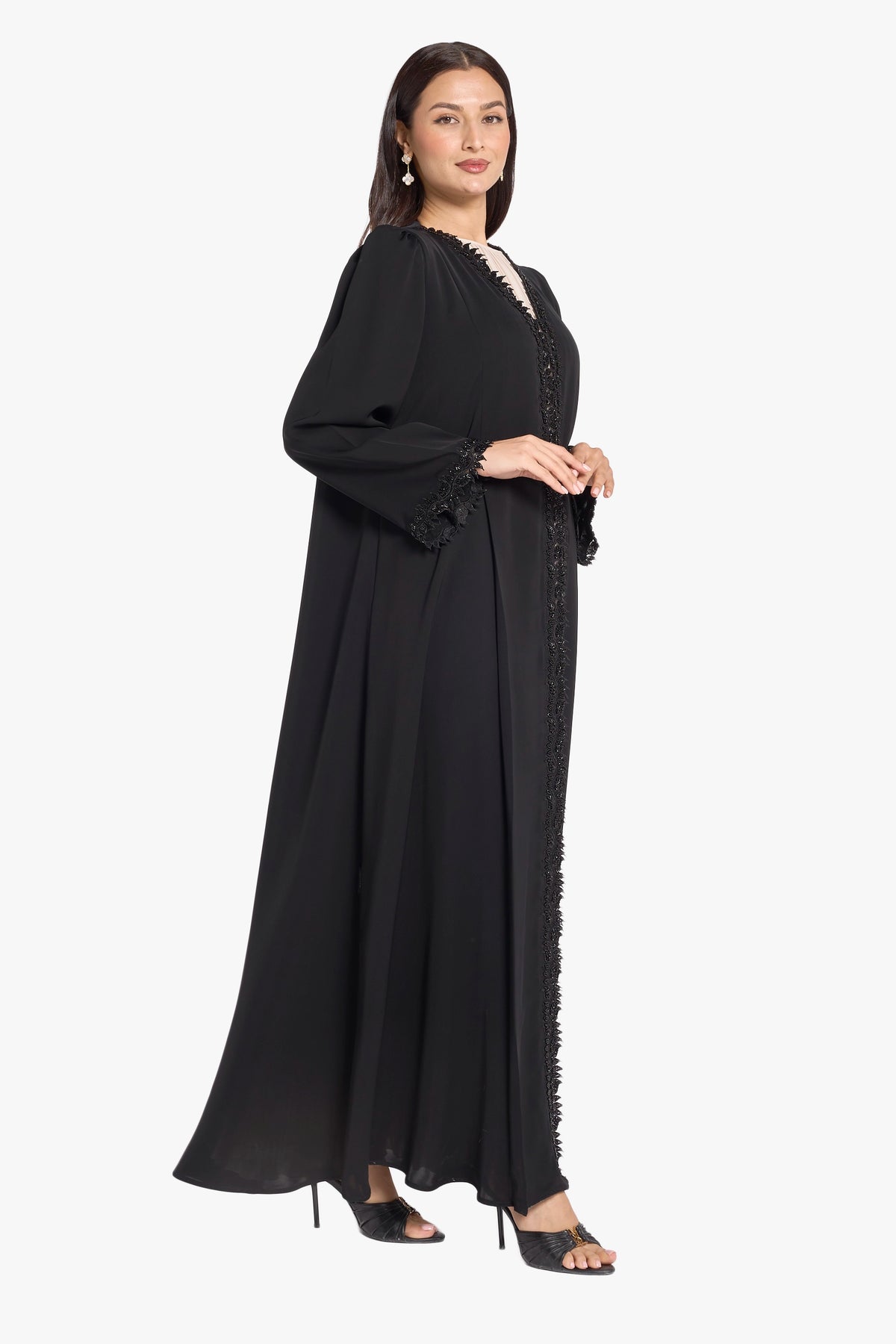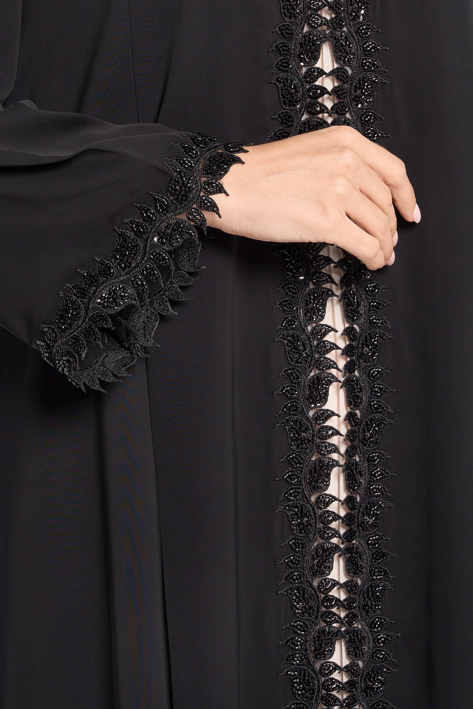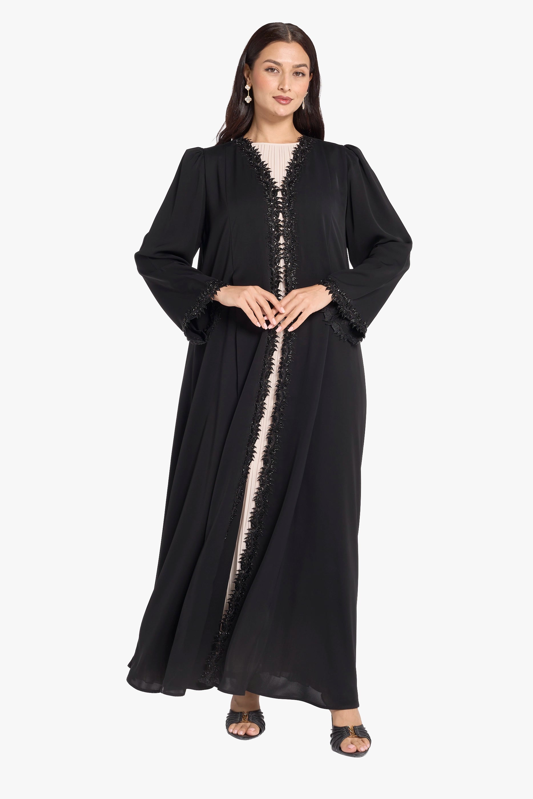 تتميز عباية أوشا بتفاصيل دانتيل أنيقة على الجهة الأمامية، مما يضفي لمسة راقية ورقيقة على تصميمها العام. هذه اللمسة الراقية تُعزز أناقة العباءة، ما يجعلها خيارًا مثاليًا لمن يبحثن عن أناقة خالدة بأسلوب محتشم.