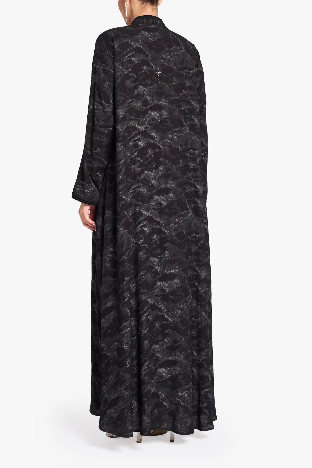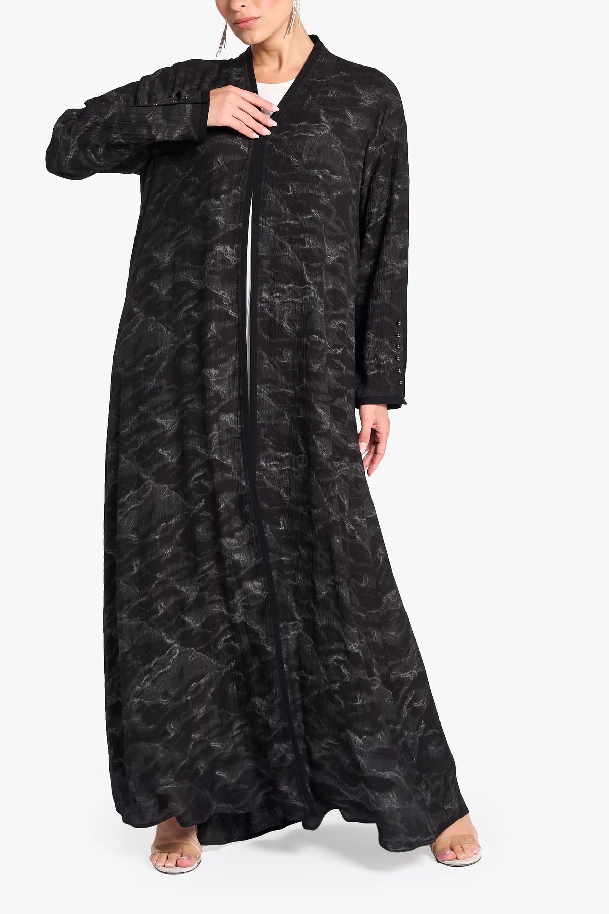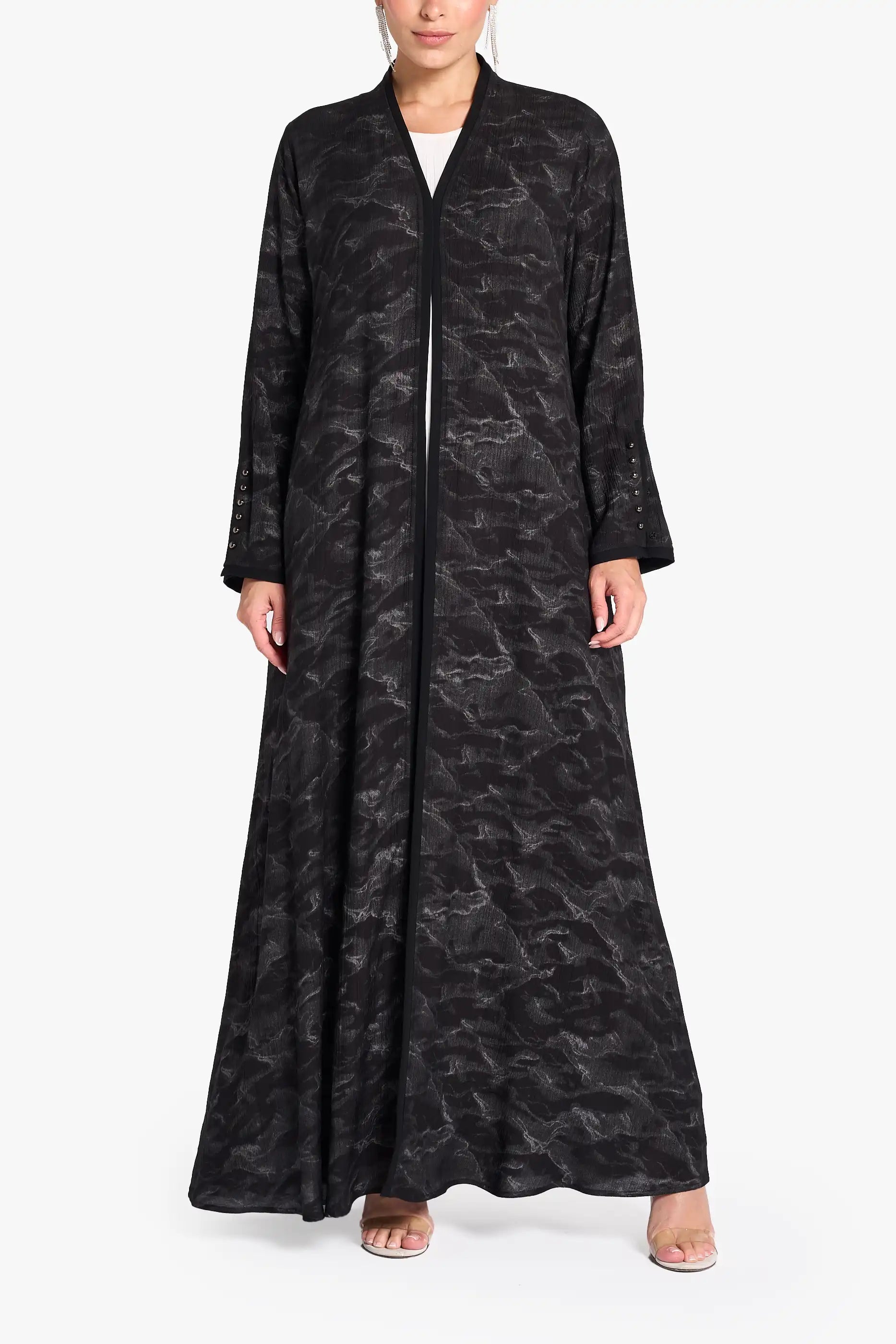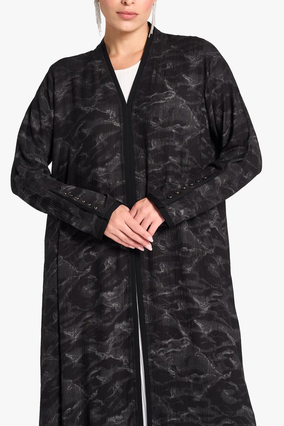 عباية لوزان مصنوعة من قماش الكريب المطبوع مع تفاصيل قماش متناسقة الألوان في الأمام، والأصفاد، والثنيات الخلفية، ومميزة بأزرار معدنية.