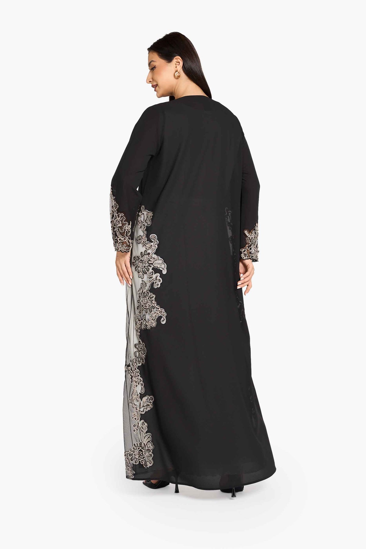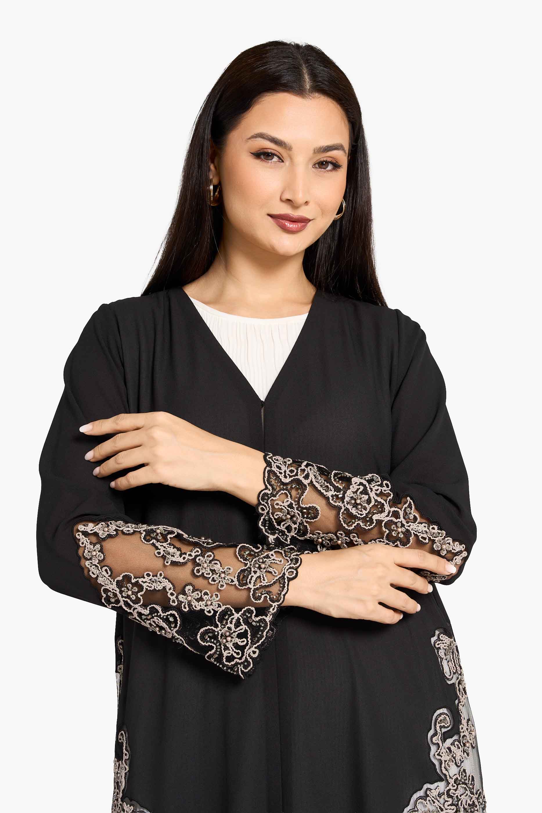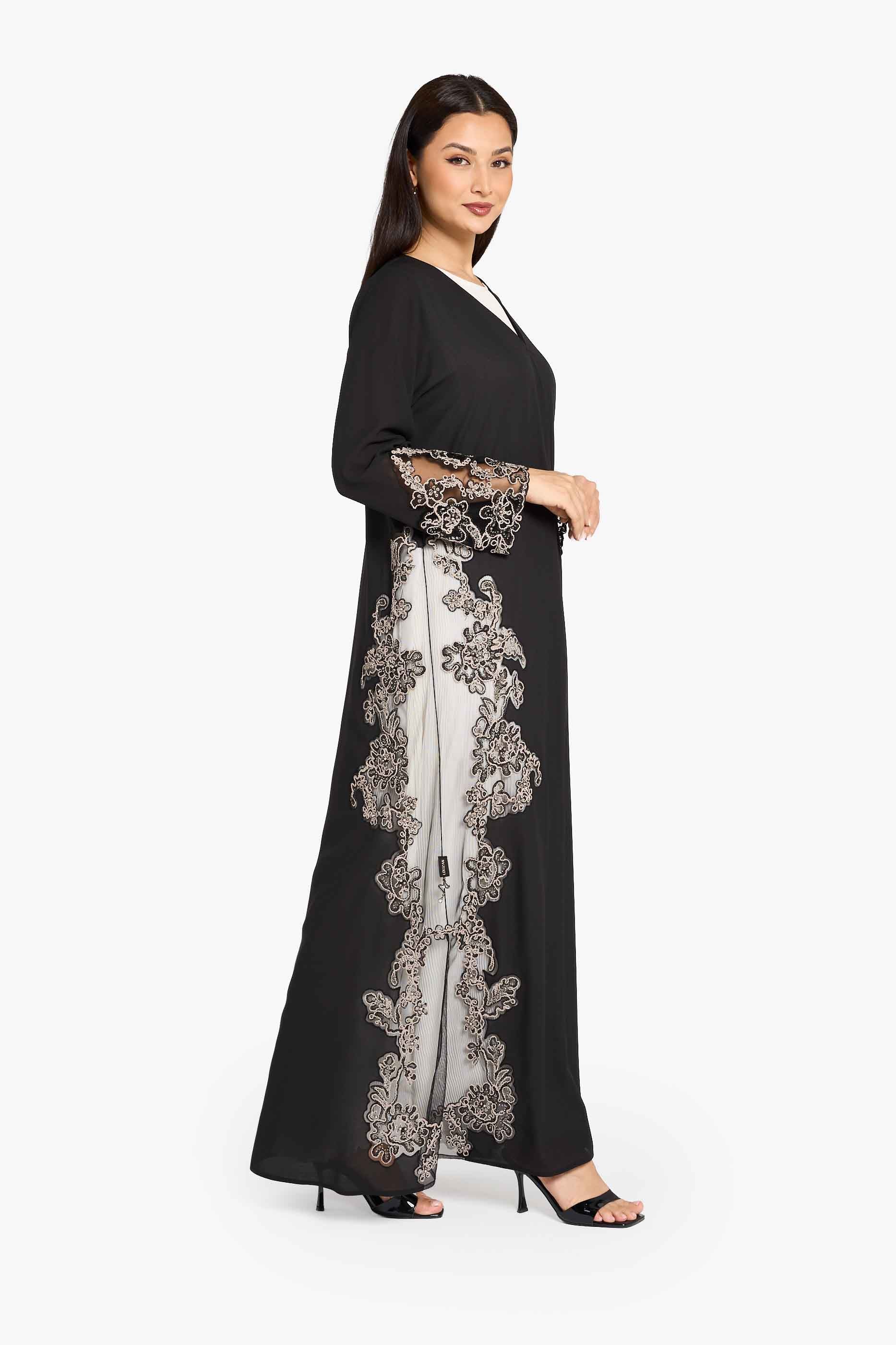 عباية لوزان لكبار الشخصيات مزينة بدانتيل زهري وحواف من الدانتيل.