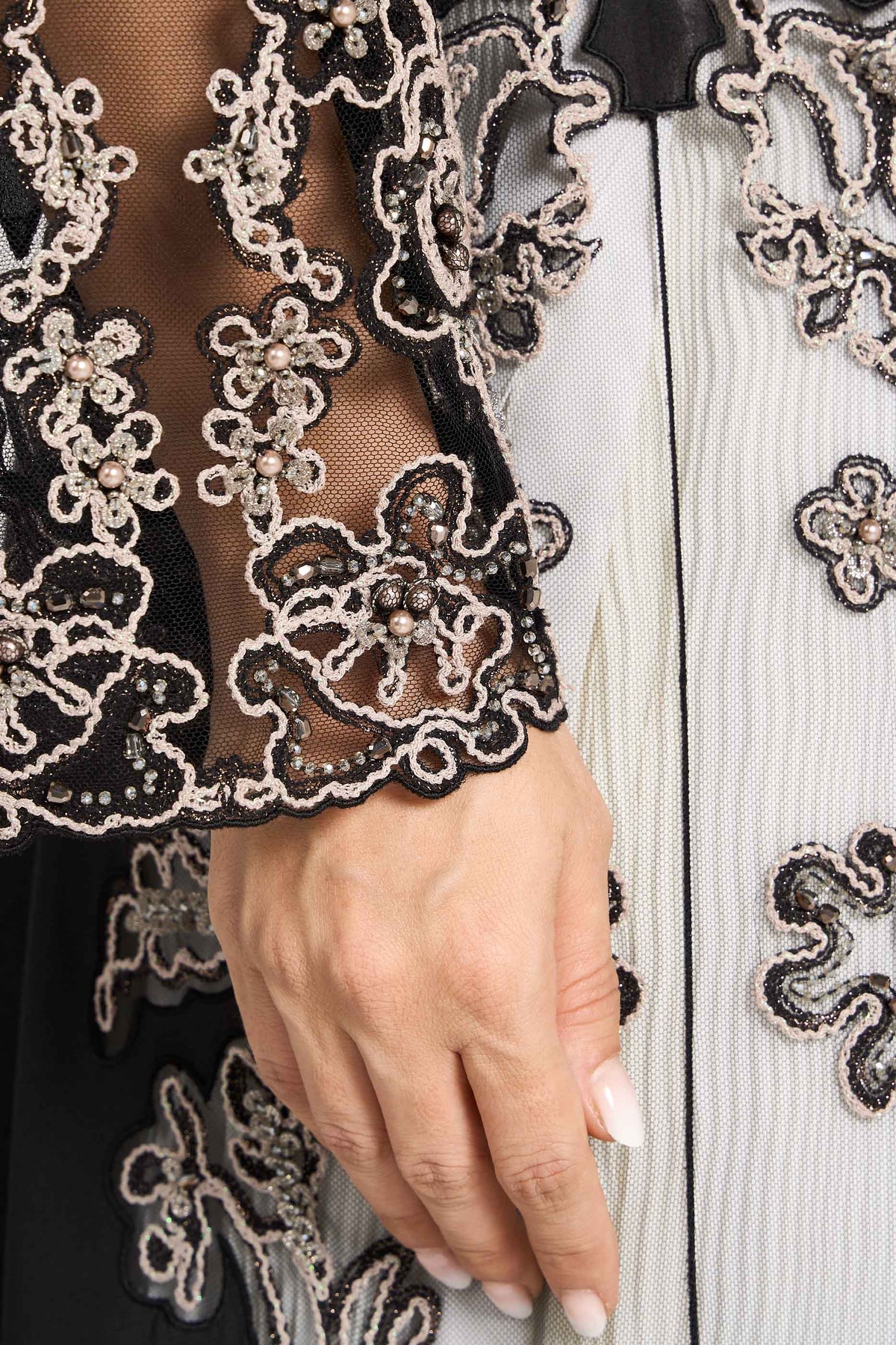 عباية لوزان لكبار الشخصيات، مصنوعة من الشيفون الرقيق، وتتميز بتطريز زهري باروكي مجرد بخيوط معقدة، ومزينة بدقة بالكريستال والخرز، مما يضفي عليها فخامة راقية وأناقة عصرية.