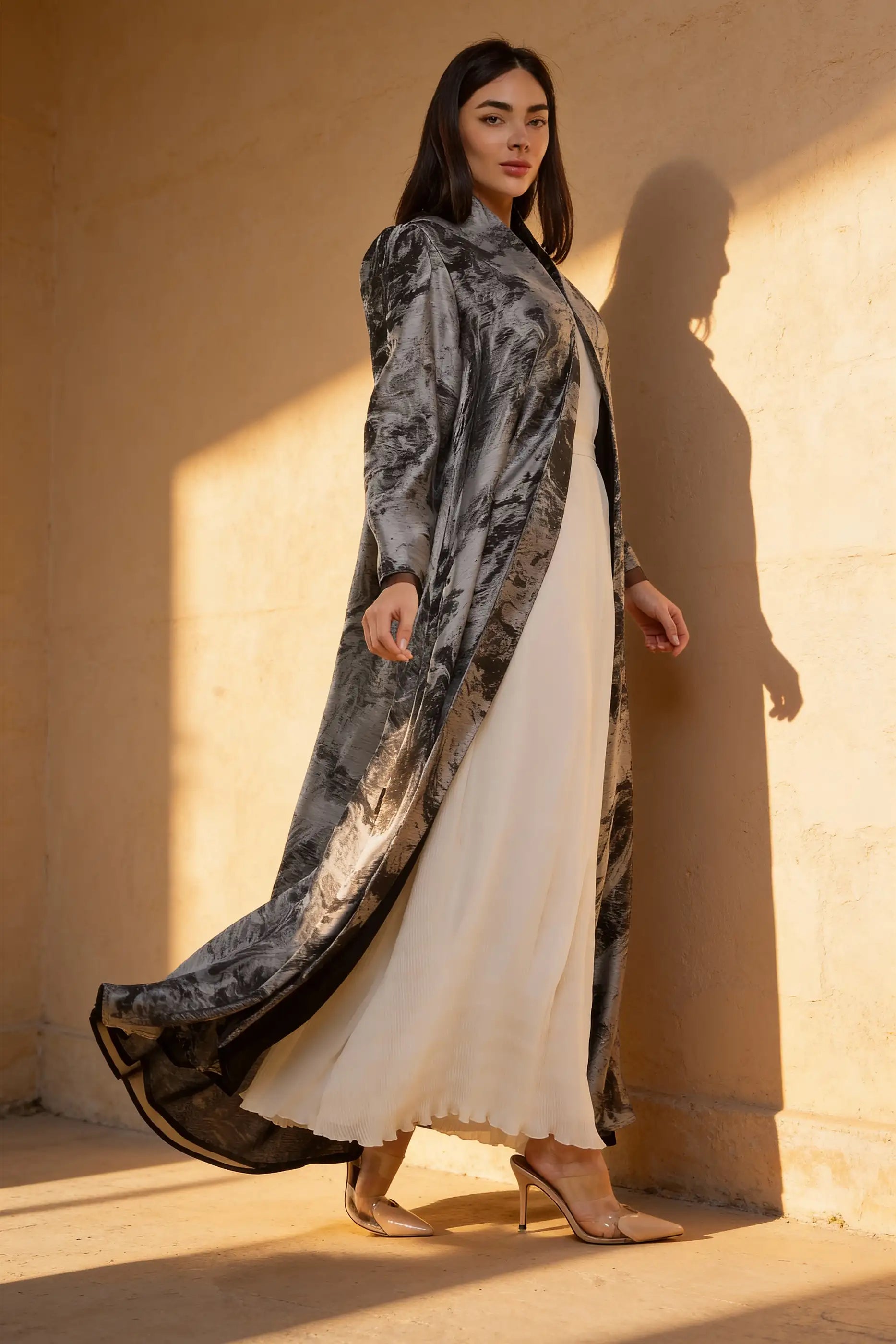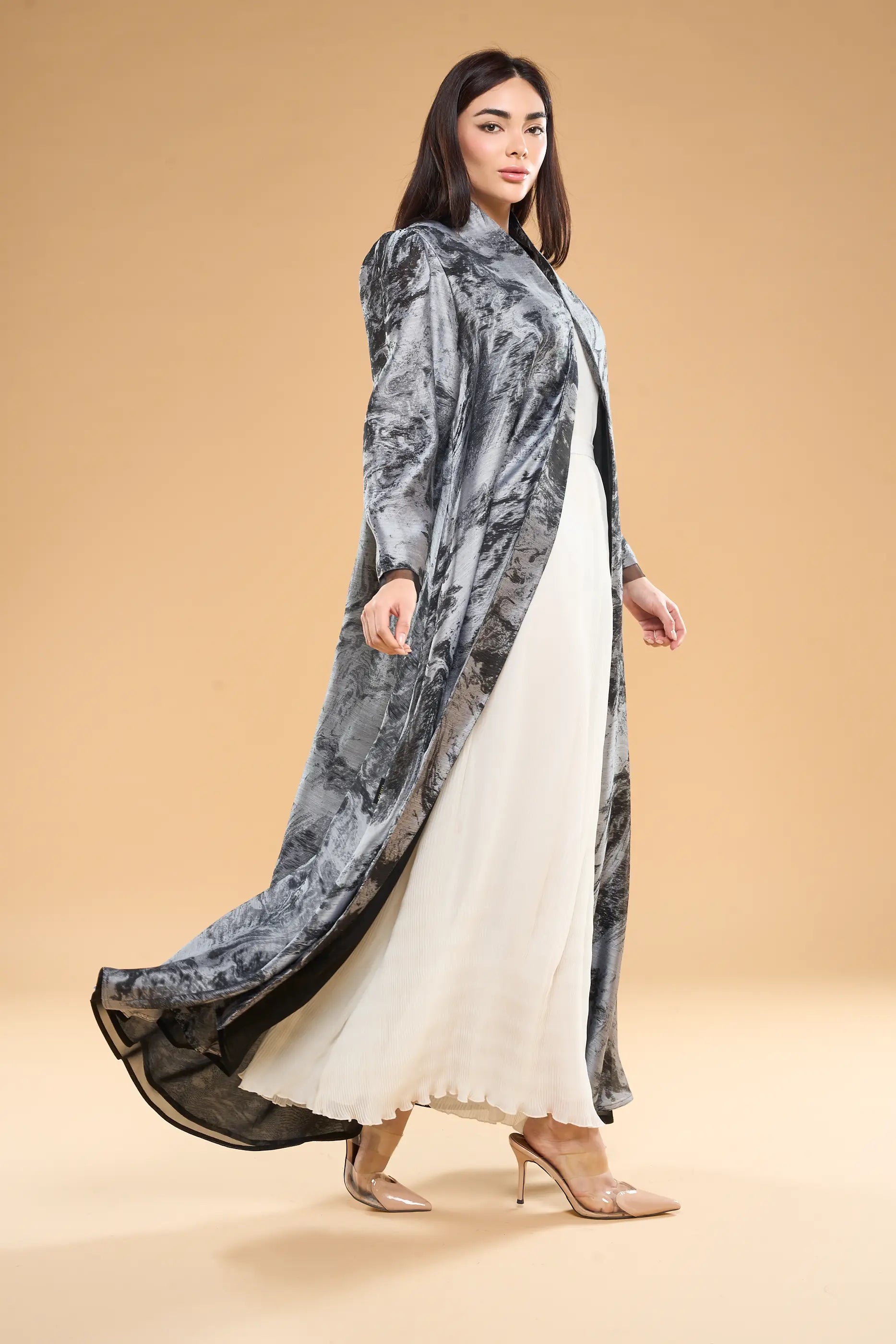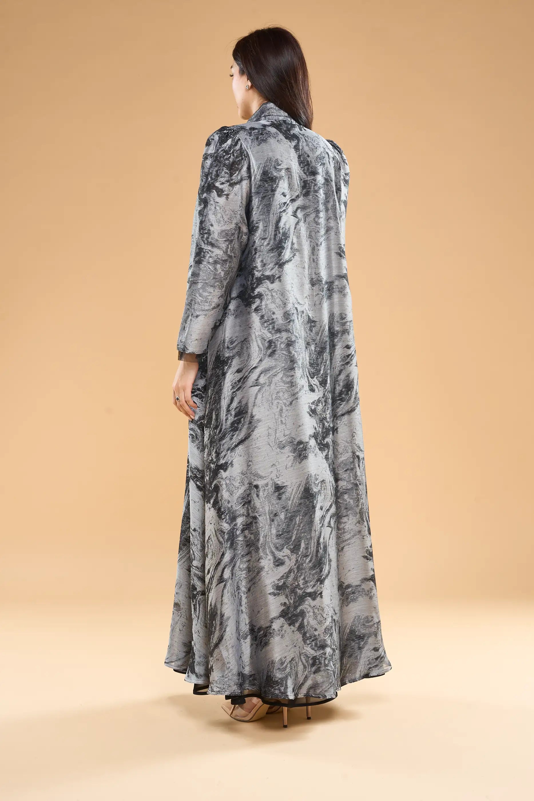 عباية أوساها مصنوعة من قماش الأورجانزا الساتان المطبوع بنقوش تجريدية، وتتميز بأكمام مكشكشة وقصة خفيفة الوزن تضفي أناقة عصرية بلمسة نهائية راقية.