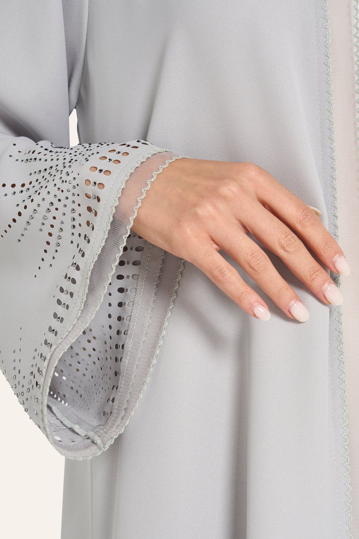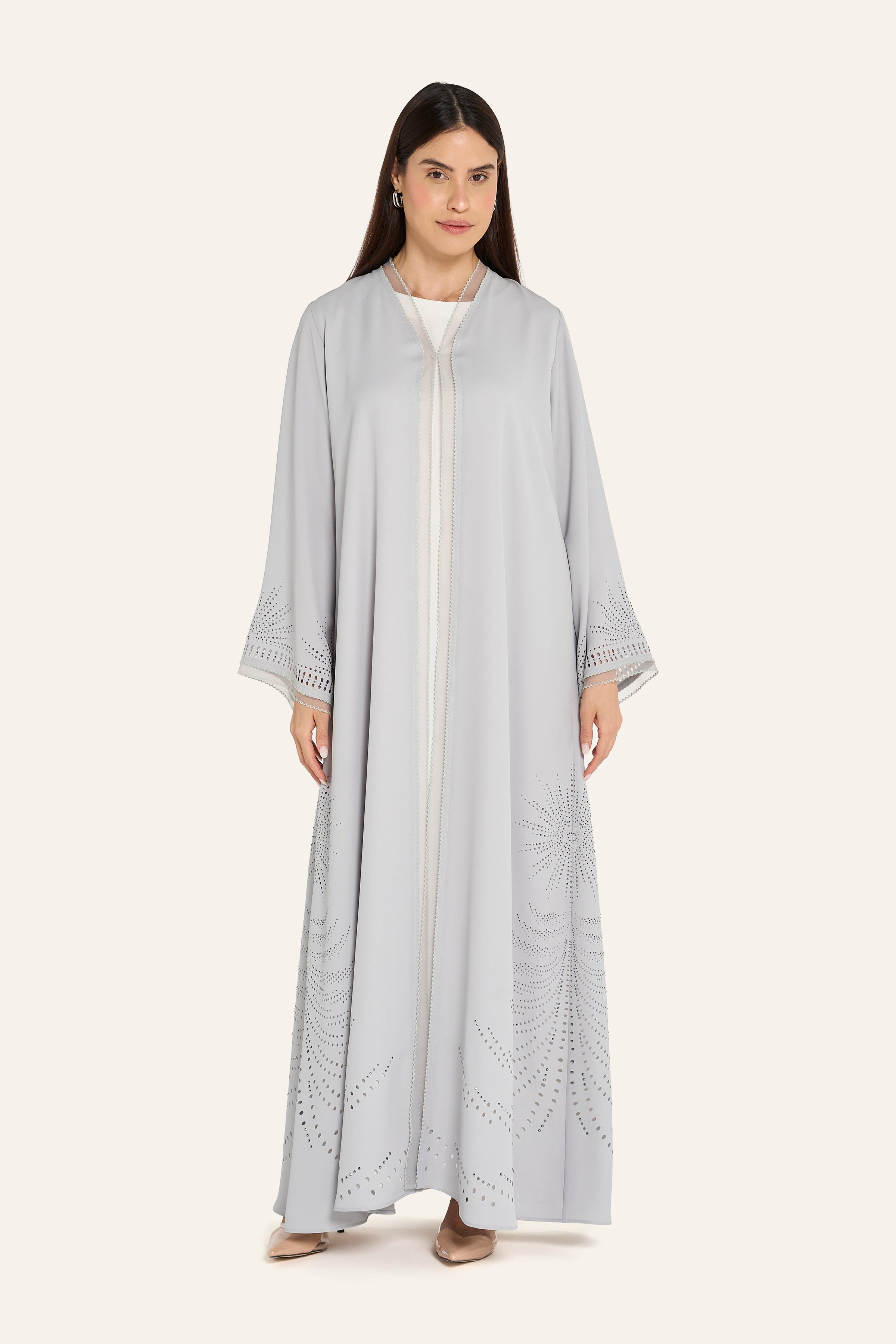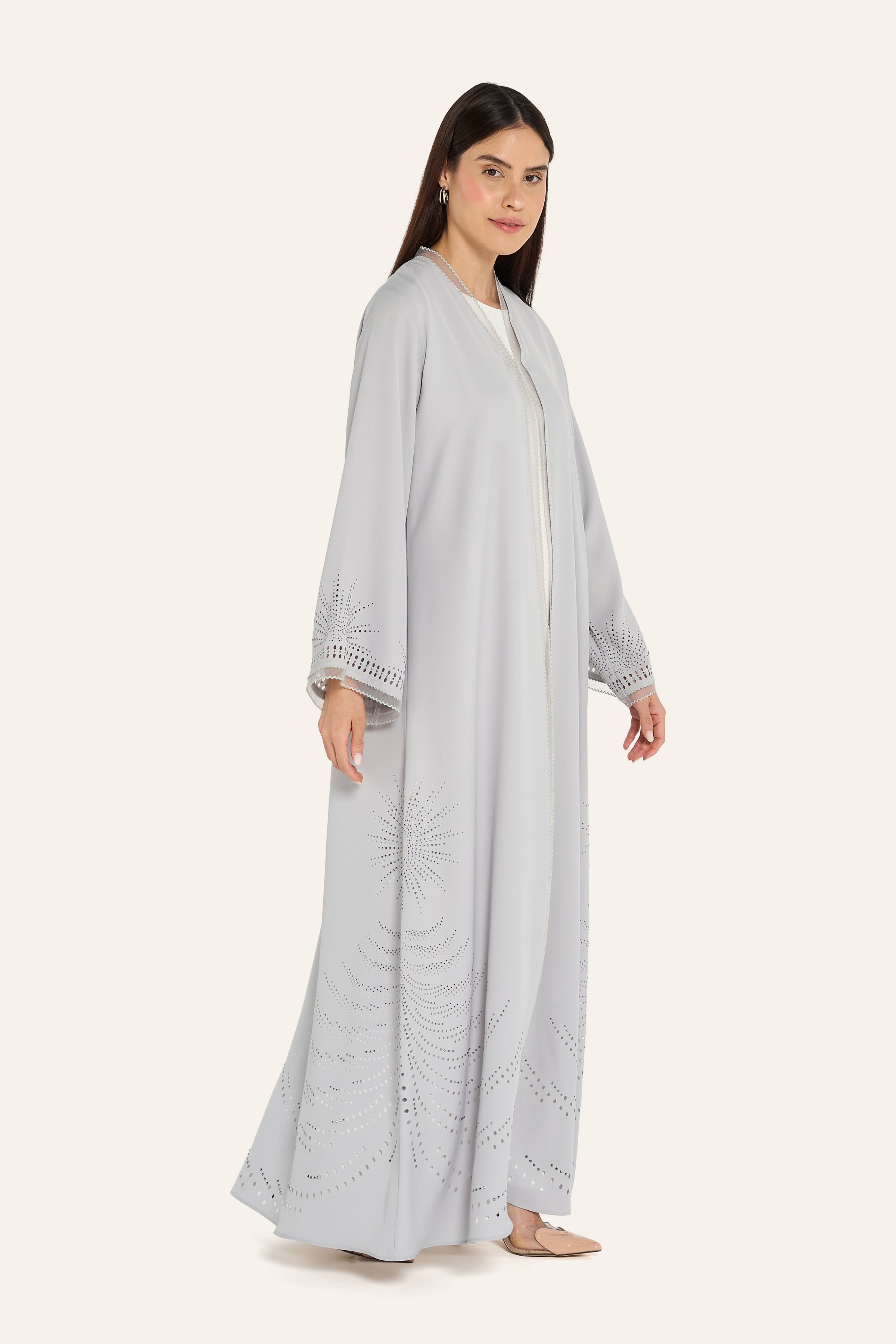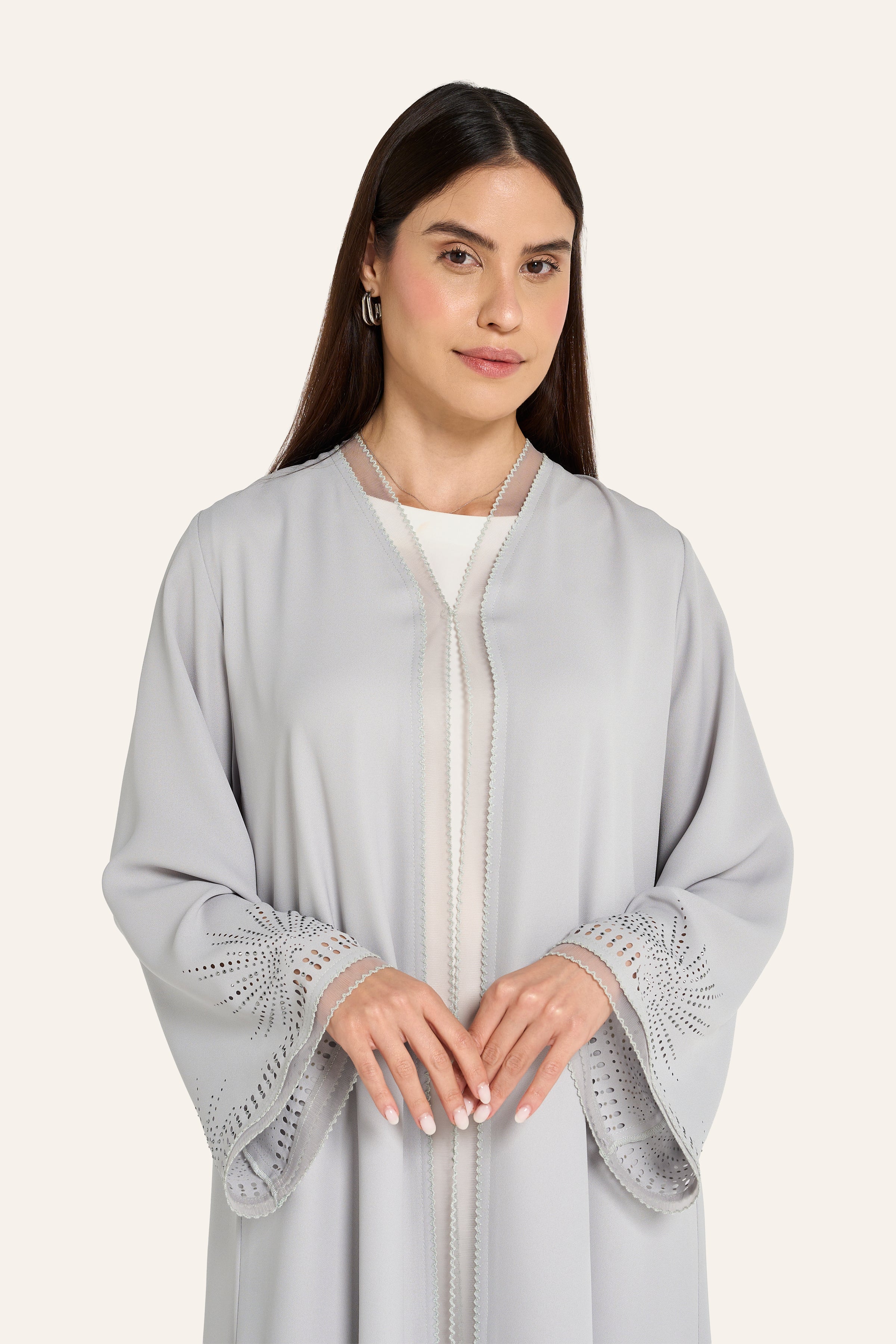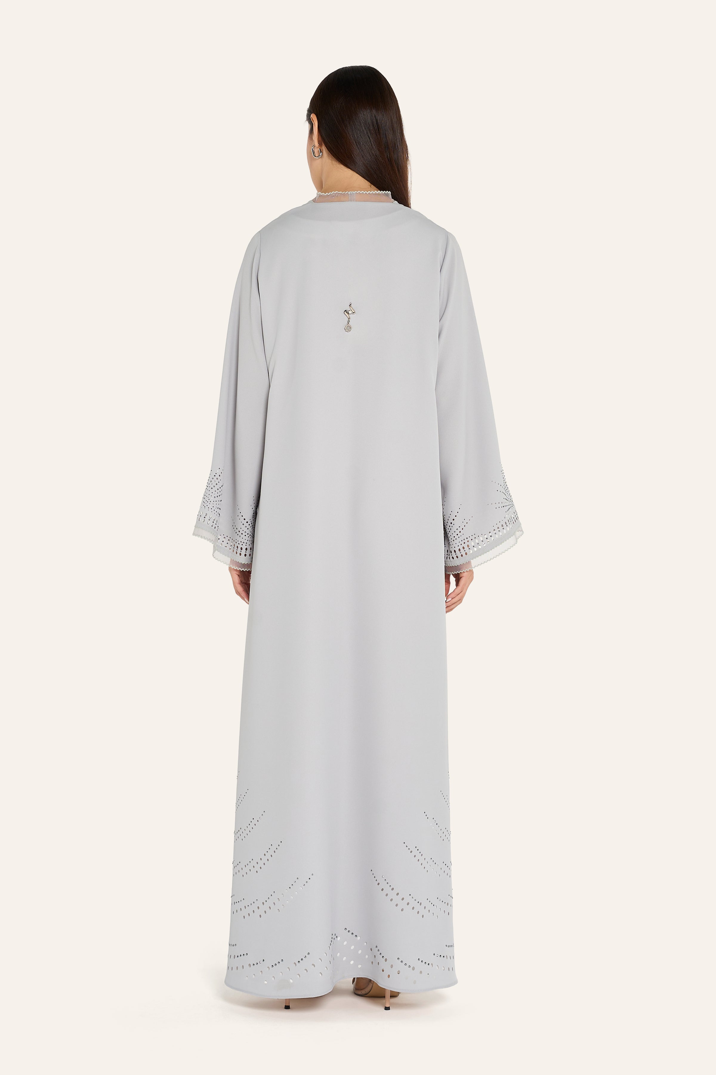 يتميز هذا الثوب بتصميم بسيط وأنيق، بفتحة أمامية مُحاطة بزخارف رقيقة. وتتخلل أطراف الأكمام والحافة السفلية نقوش دقيقة مُفرّغة أو مُثقّبة، تُضفي لمسة جمالية دون أن تُطغى على التصميم البسيط. يبدو القماش ناعمًا وخفيفًا، مما يمنح الثوب مظهرًا انسيابيًا رقيقًا.