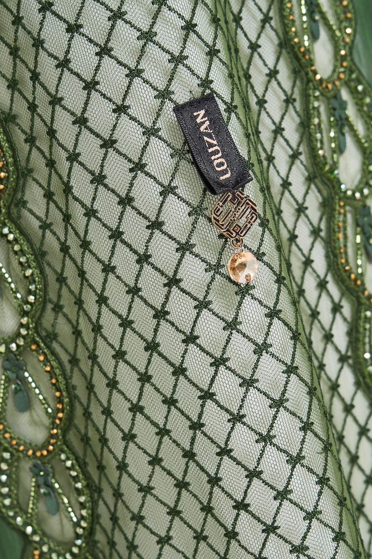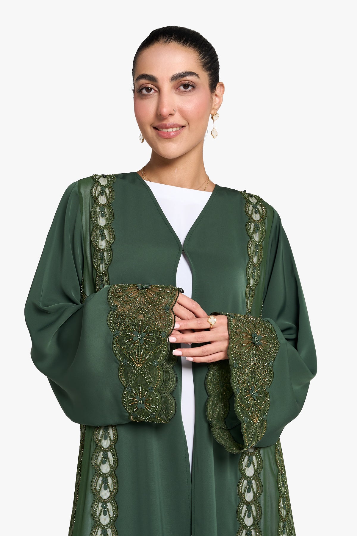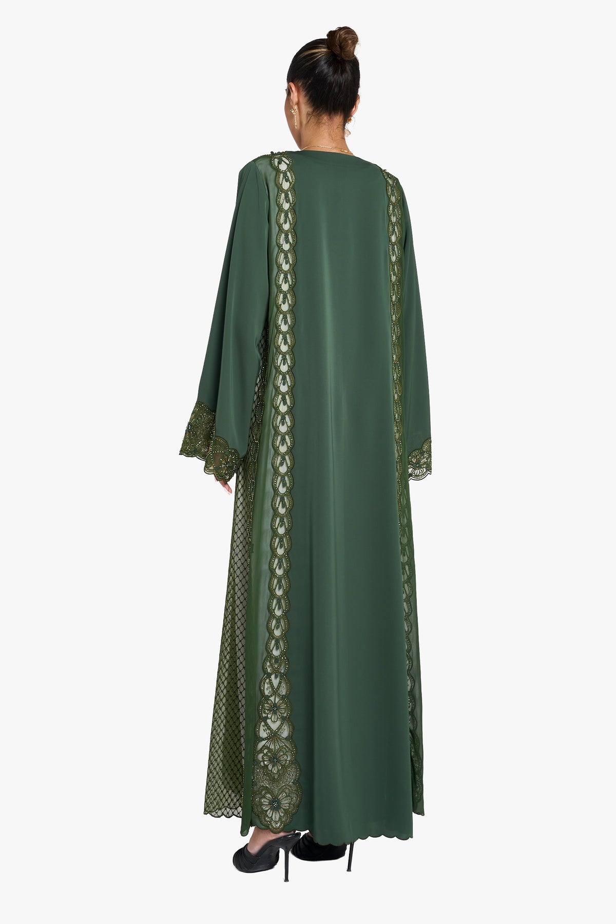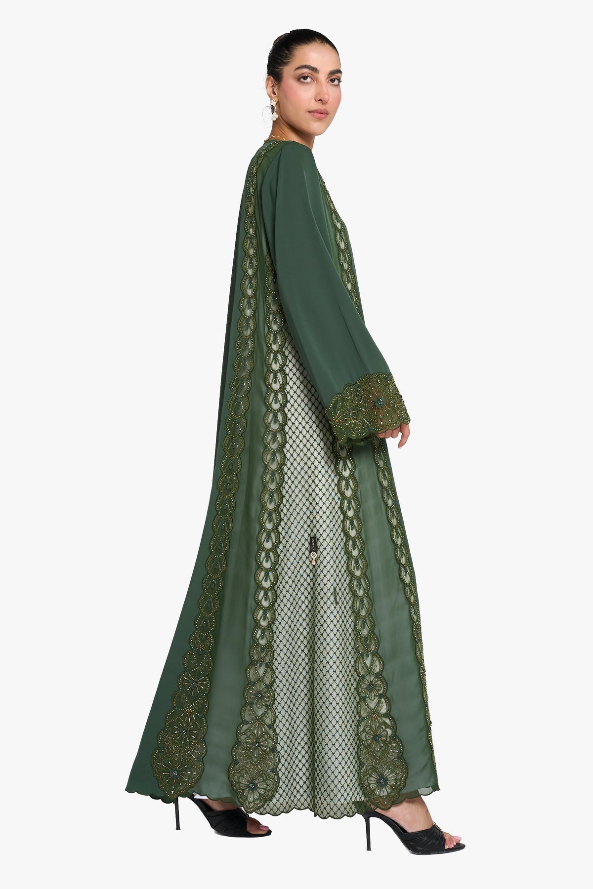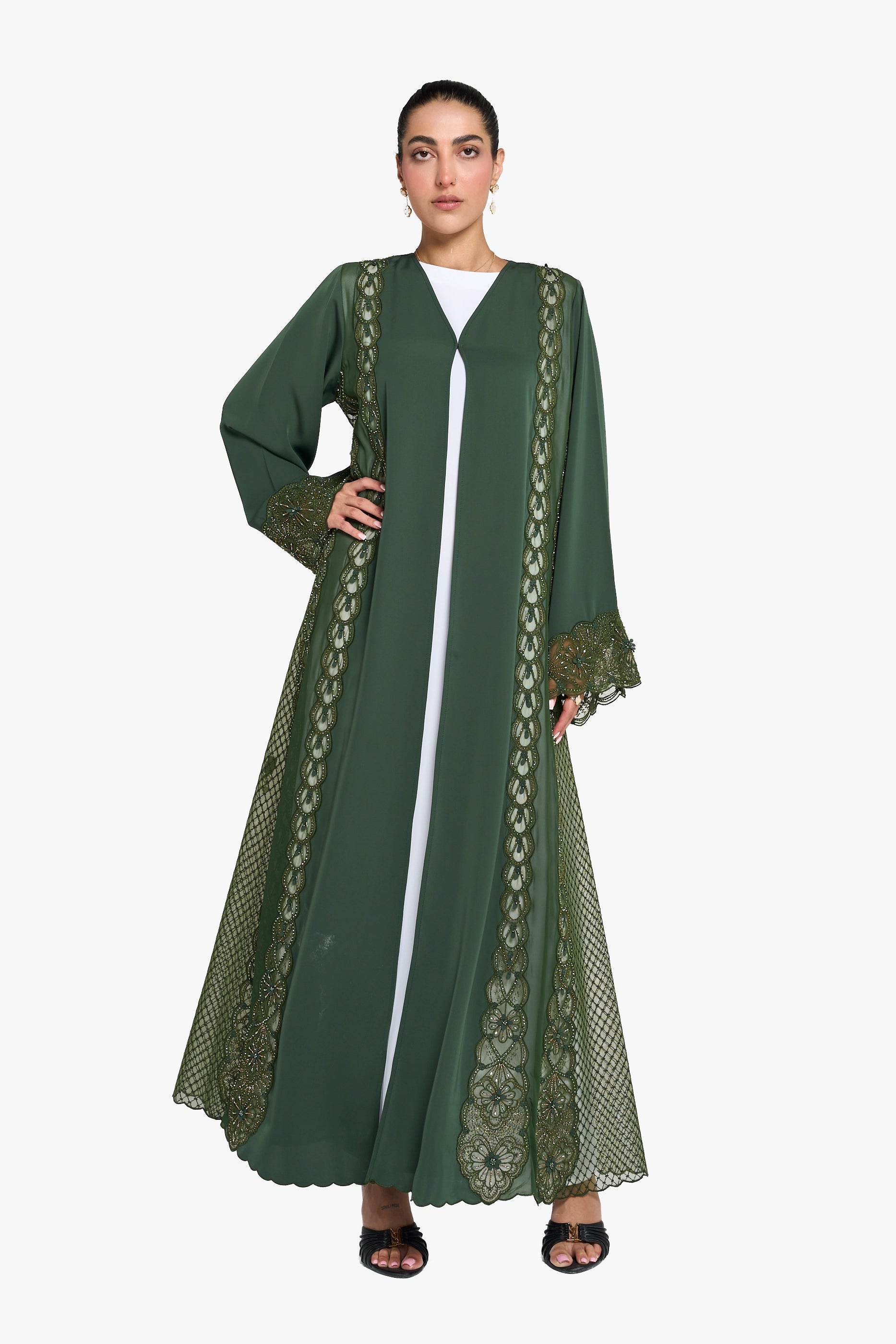 تُضفي هذه العباءة لمسةً راقيةً على إطلالات العمل الكاجوال، بتطريزها الهندسي الرقيق على شكل دوري، الذي يُضفي عليها لمسةً من الرقي والعمق. مُزينة بتطريز يدوي دقيق من الكريستال ثلاثي الأبعاد، تُضفي لمسةً من الرقي دون أن تُطغى على جمال التصميم. تُوازن هذه العباءة بين الاحترافية والأناقة، وتُناسب بيئات العمل اليومية مع الحفاظ على الراحة والأناقة.