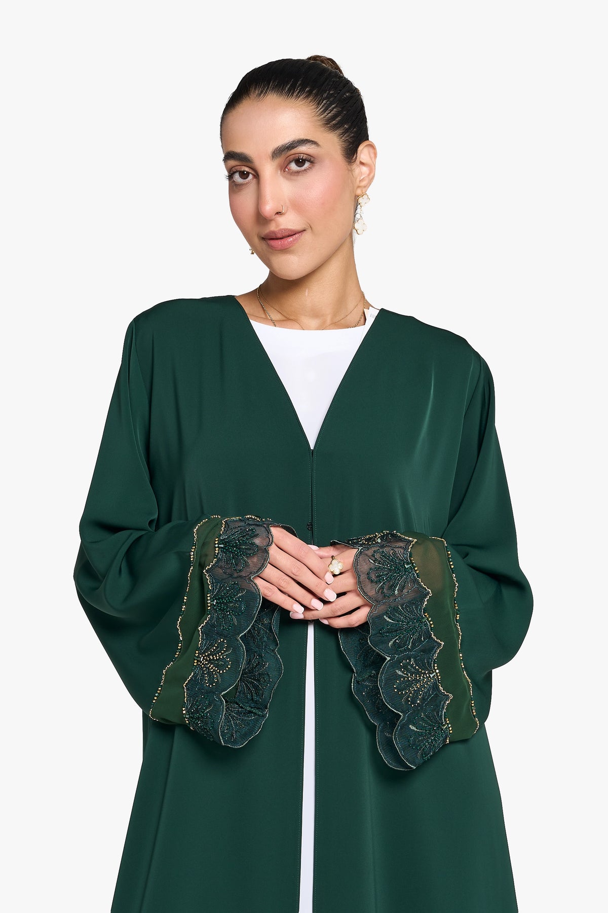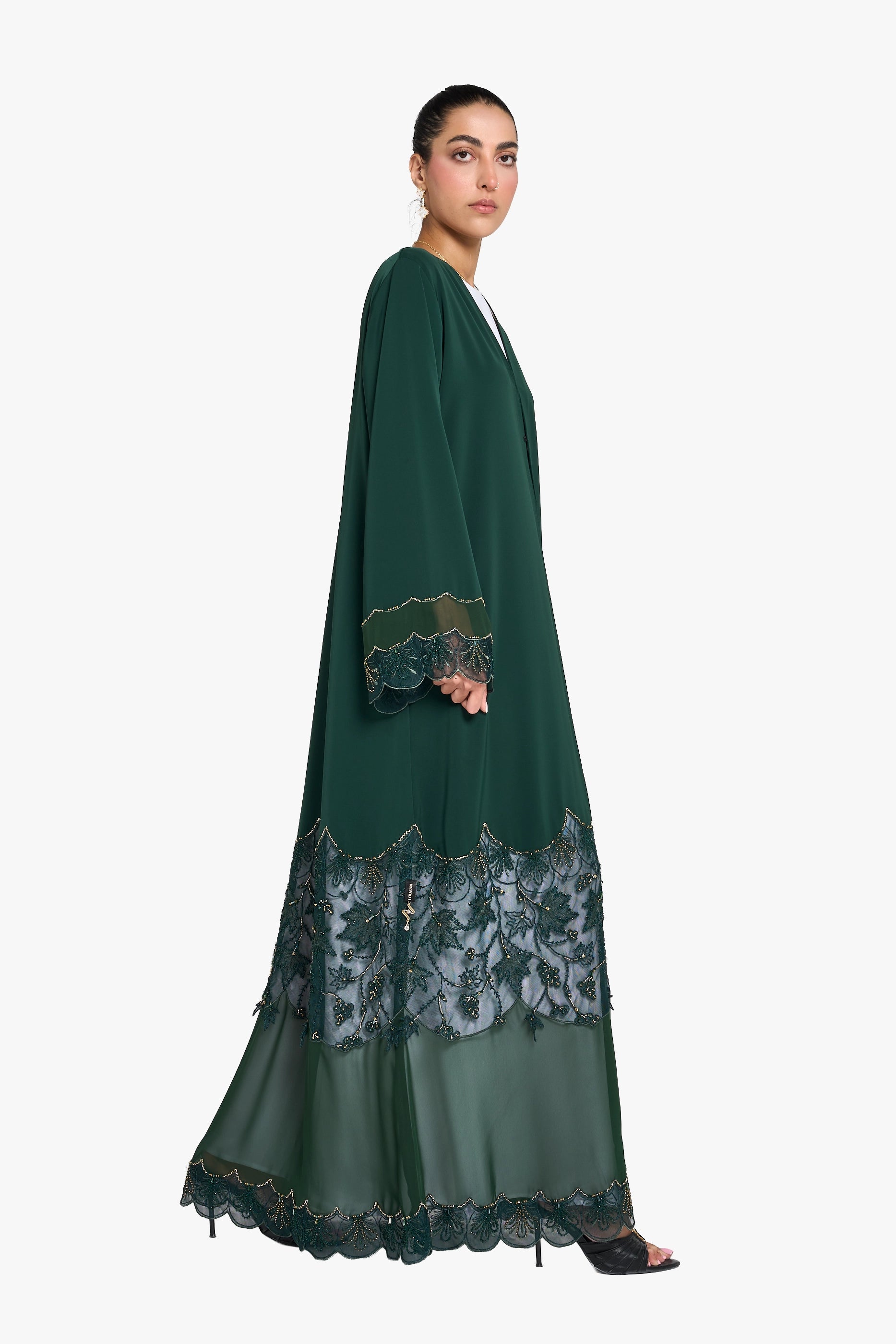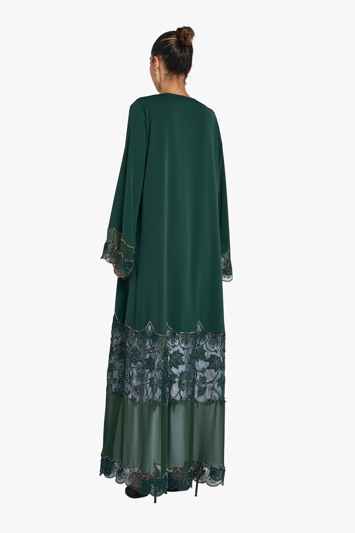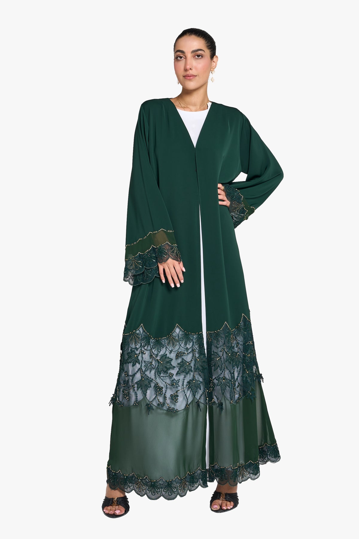 عباية لوزان VIP، المصنوعة من قماش النيدا الفاخر، تتميز بتطريز دوري بديع بتصميم زهري مستوحى من الطراز الباروكي. مزينة بكريستالات وخرز موزعة بعناية، تضفي بريقًا رقيقًا، تجسد الأناقة والرقي. تحتفي هذه العباءة بالتقاليد العريقة، وتقدم تصميمًا أنيقًا، مثالية لمن يقدرون الفن والأناقة في ملابسهم.