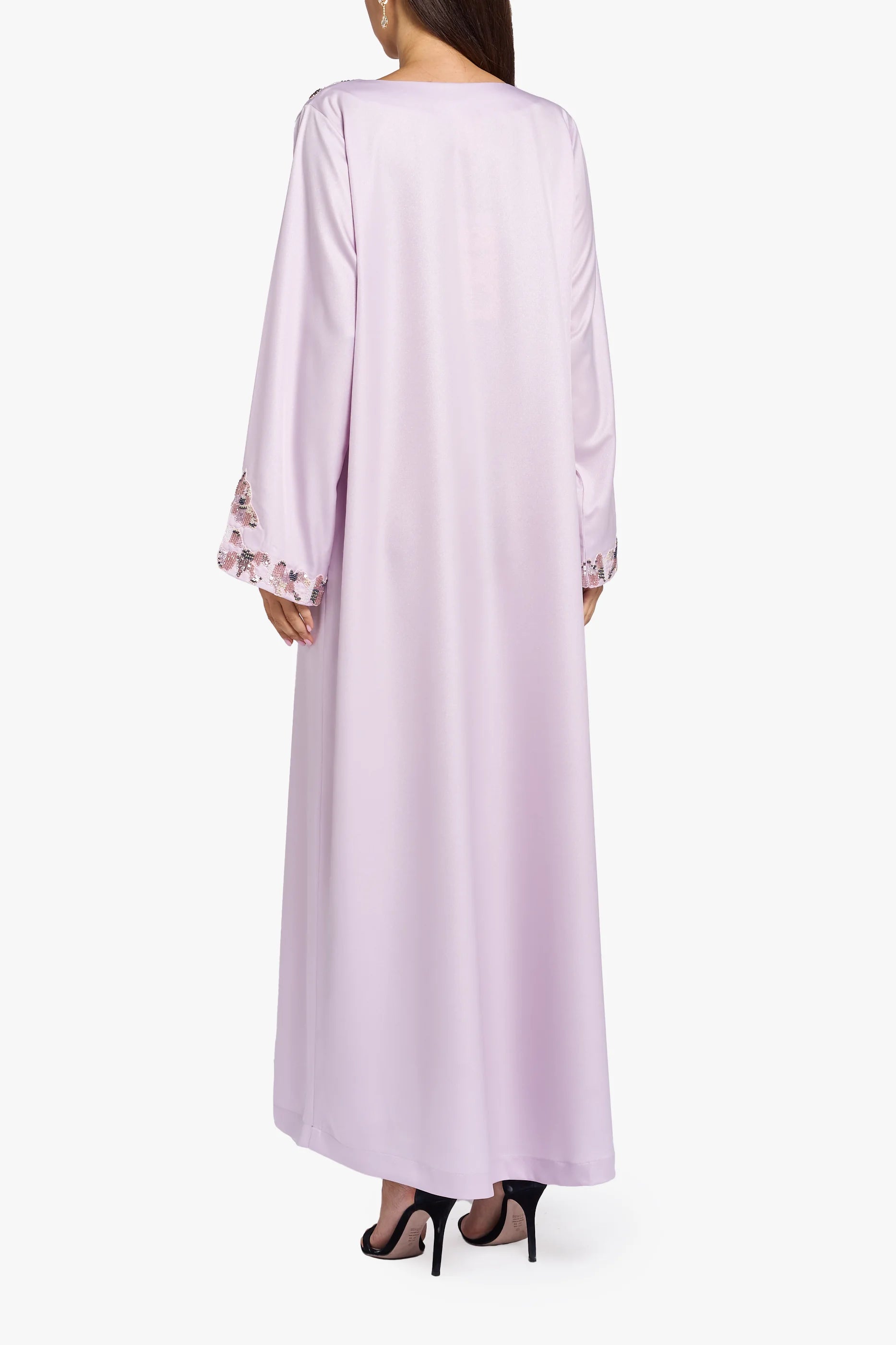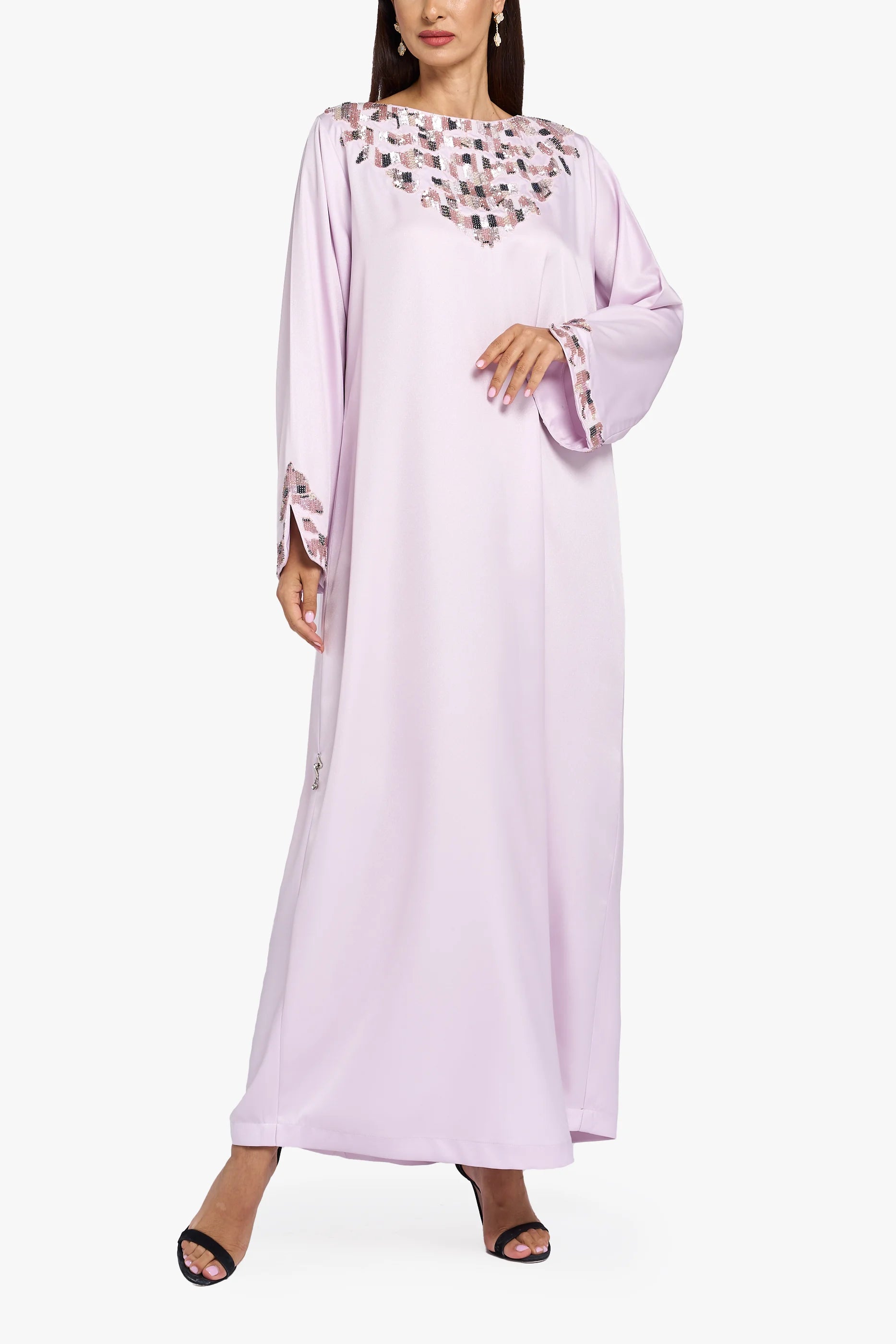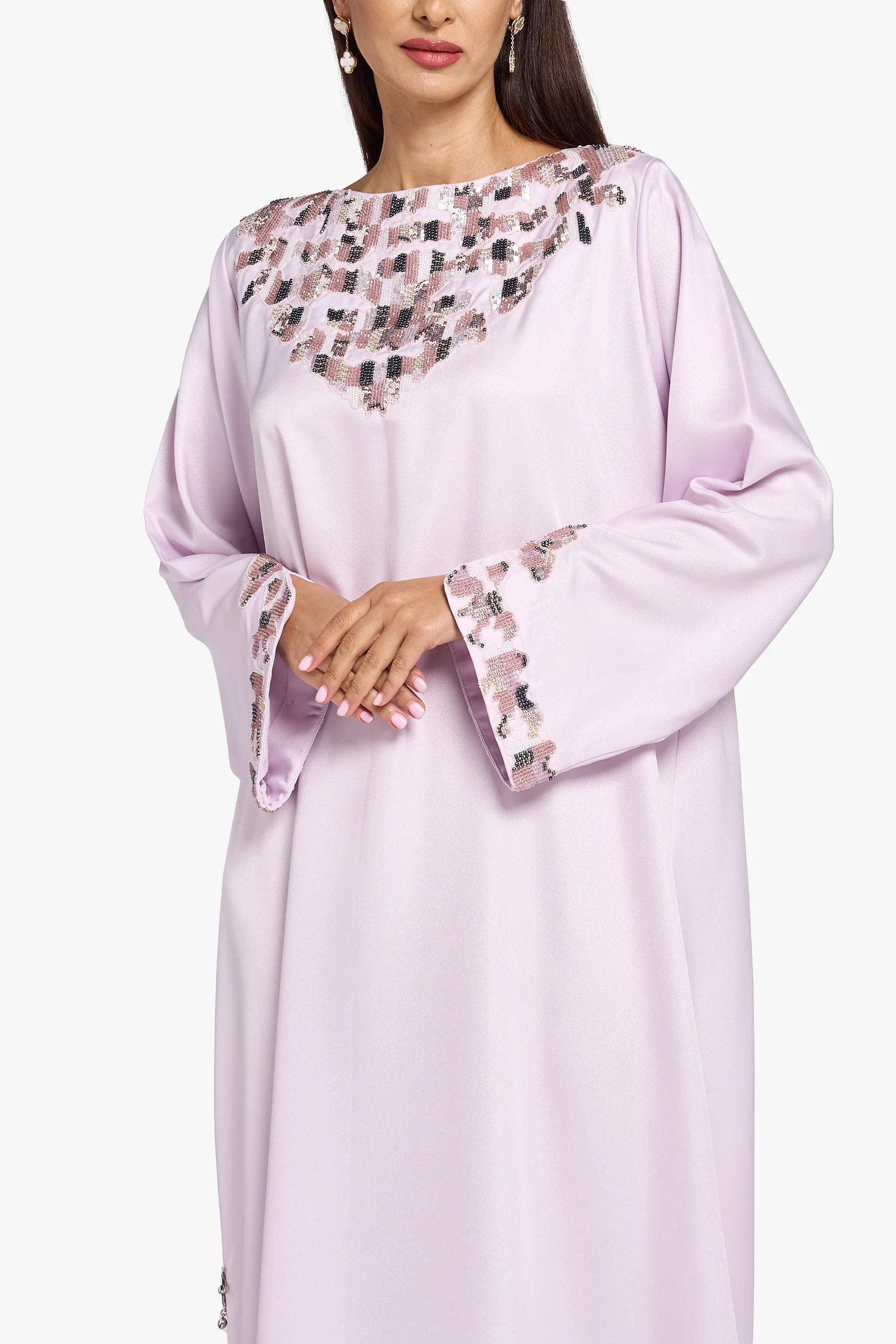 يأتي هذا المَخْوار بلون وردي فاتح، مزينًا بكريستال على الرقبة والأكمام. يتميز بتصميم انسيابي أنيق.