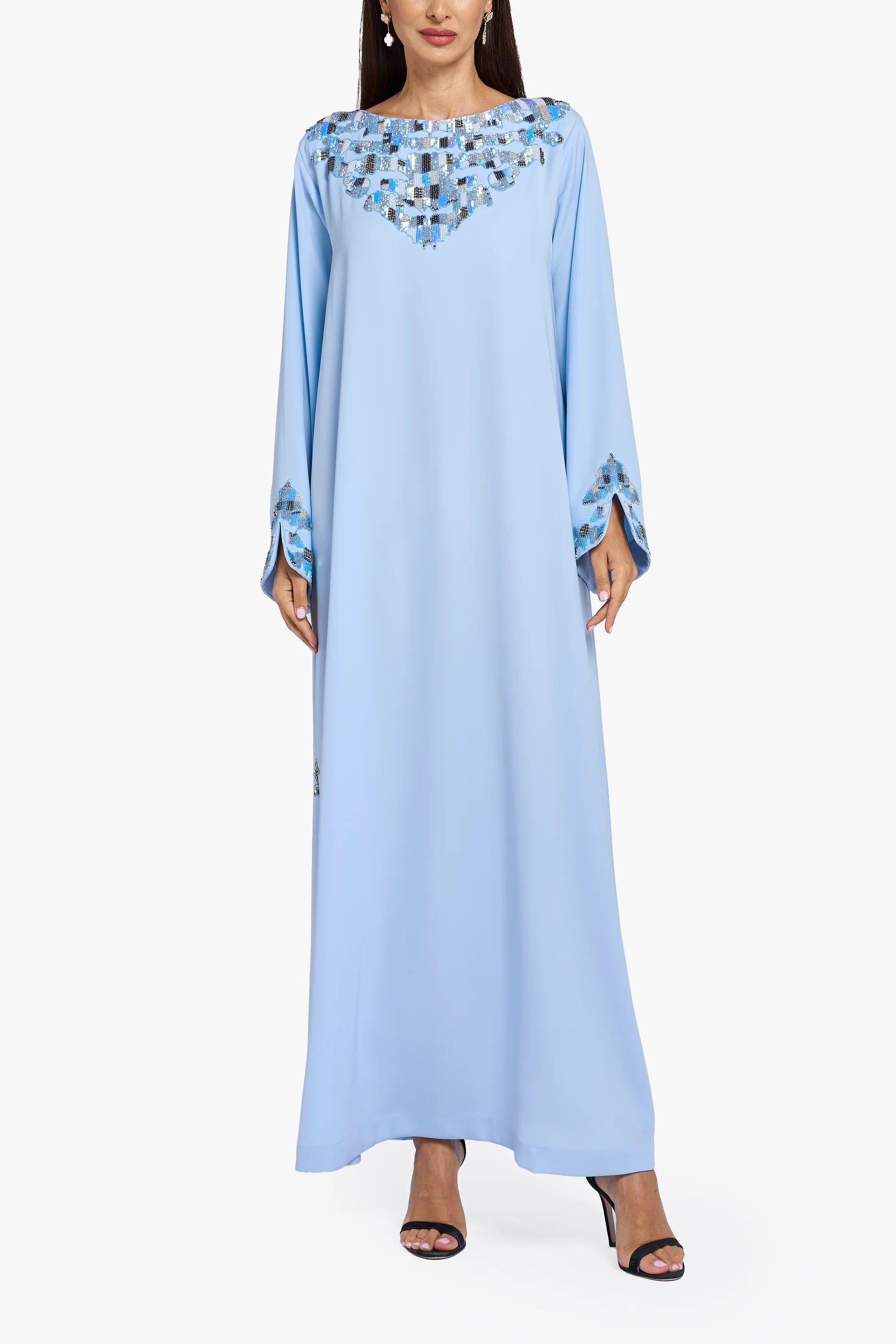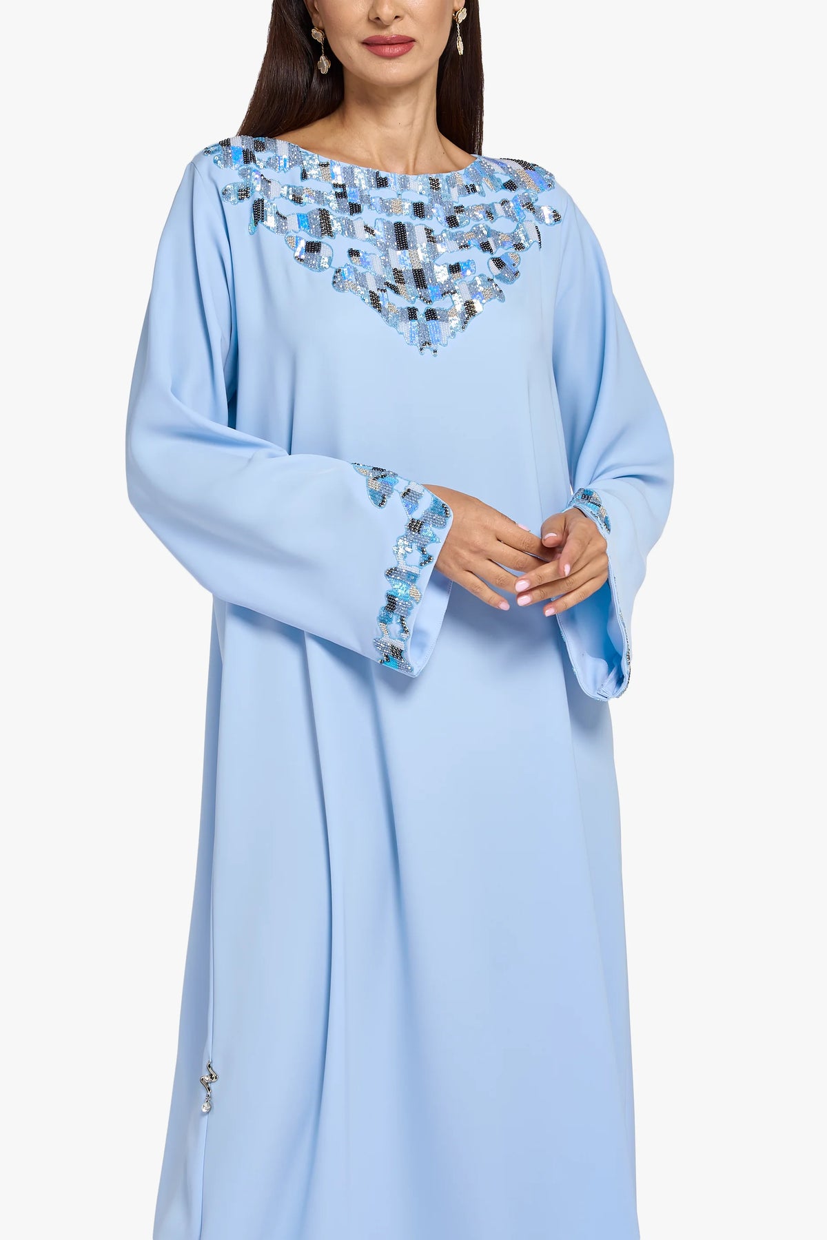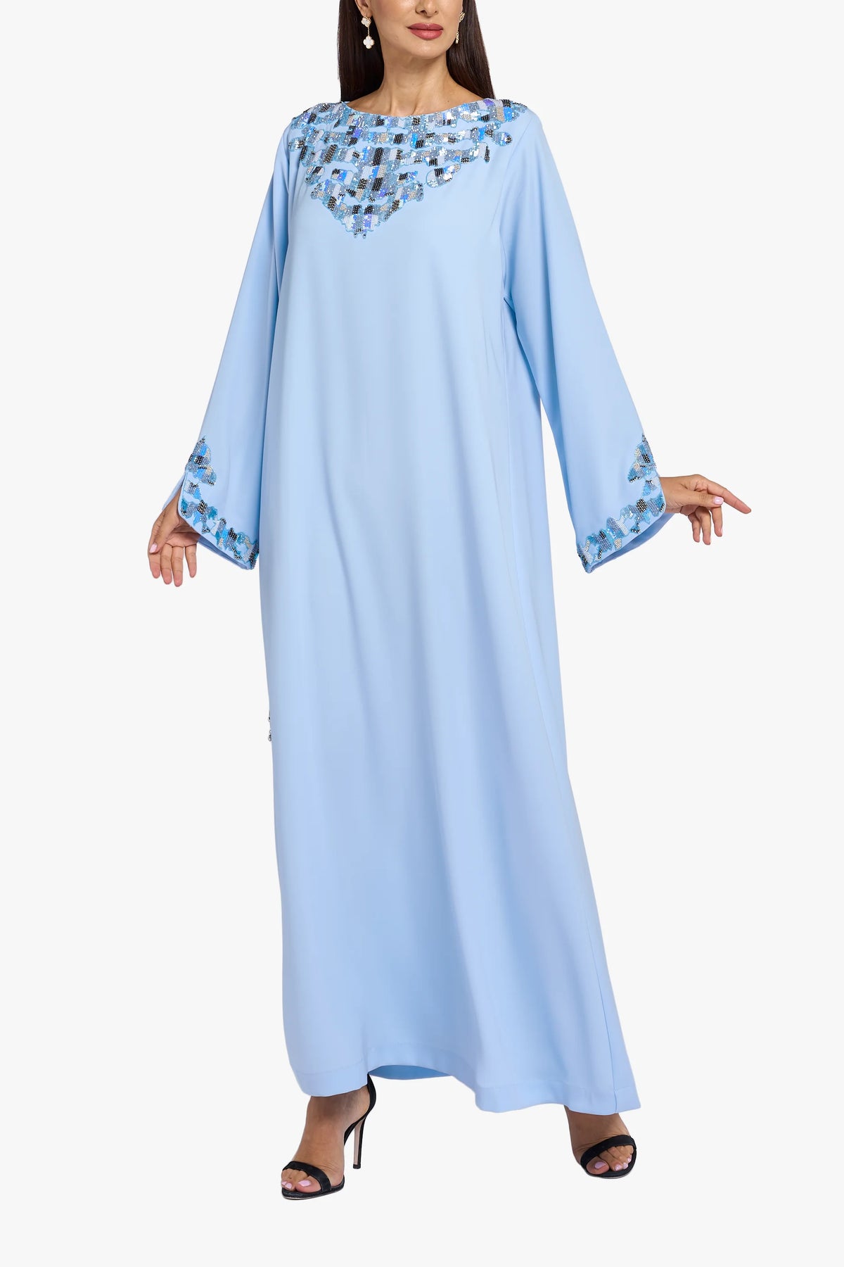 يأتي هذا المَخْوار باللون الأزرق الفاتح، مزينًا بالكريستال على الرقبة والأكمام. يتميز بتصميم انسيابي أنيق.