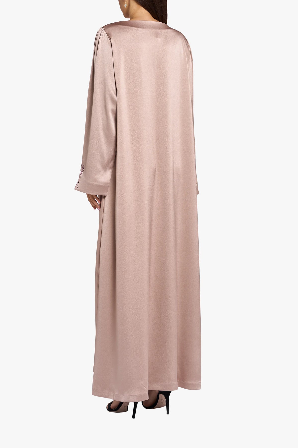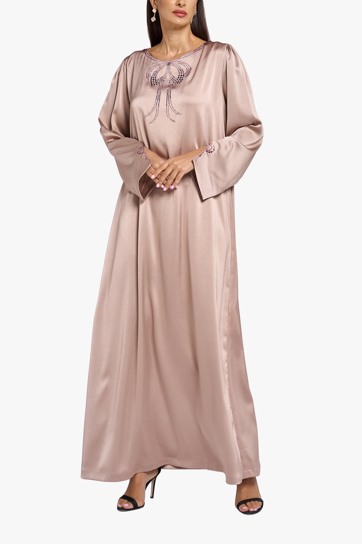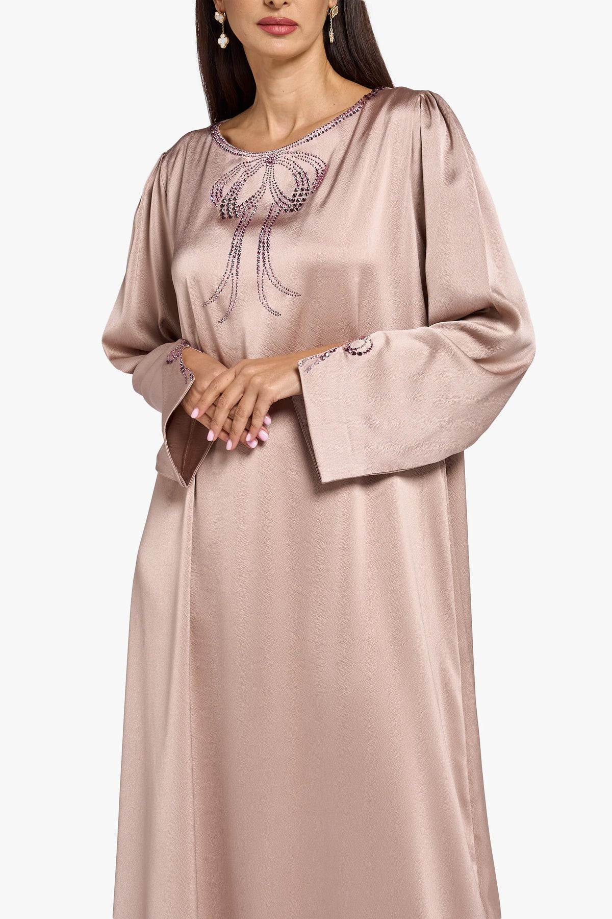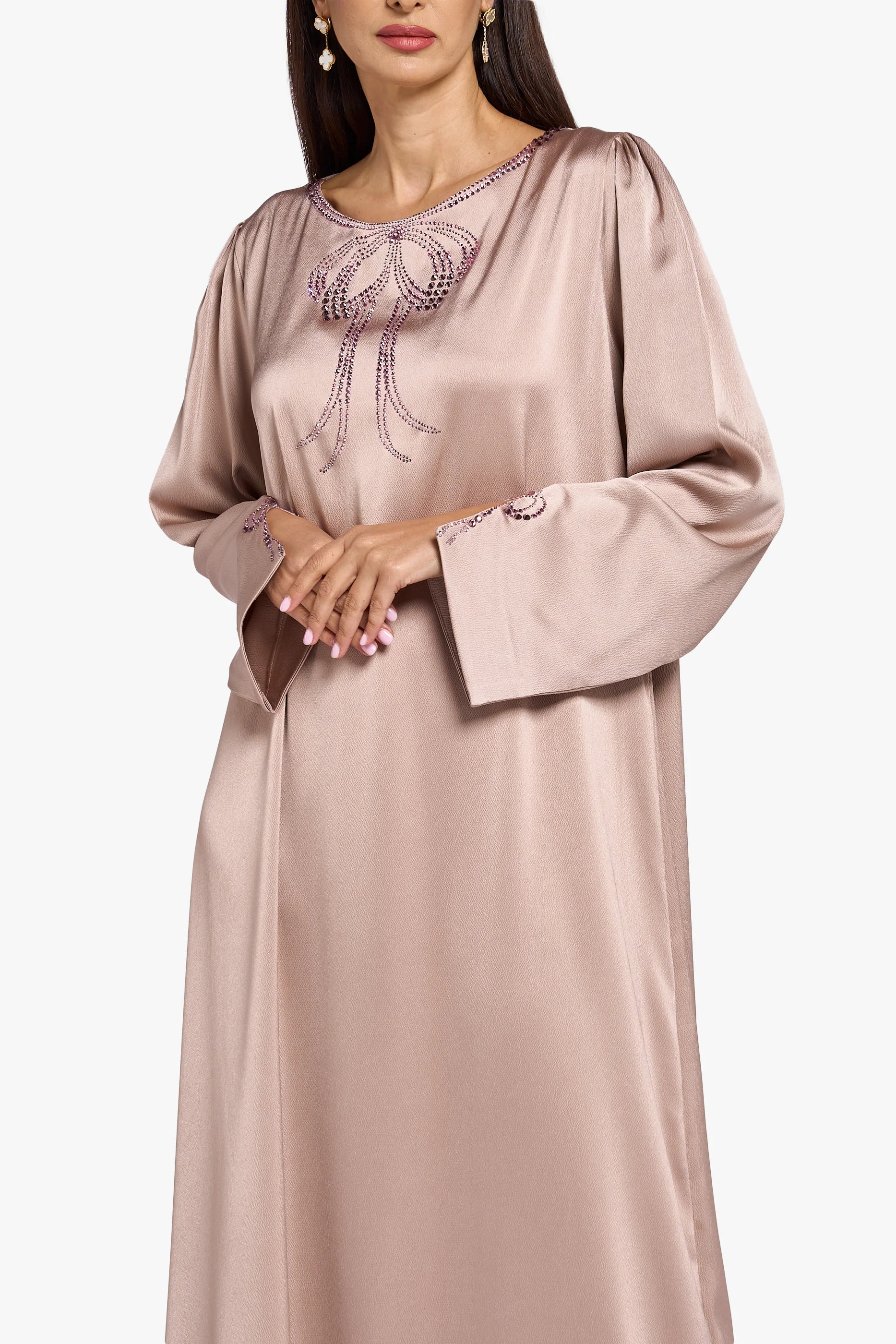 هذا المخور مصنوع من قماش الكريب الحريري باللون الوردي الناعم، مع تفاصيل كريستالية على الرقبة والأكمام لإطلالة بسيطة وأنيقة.