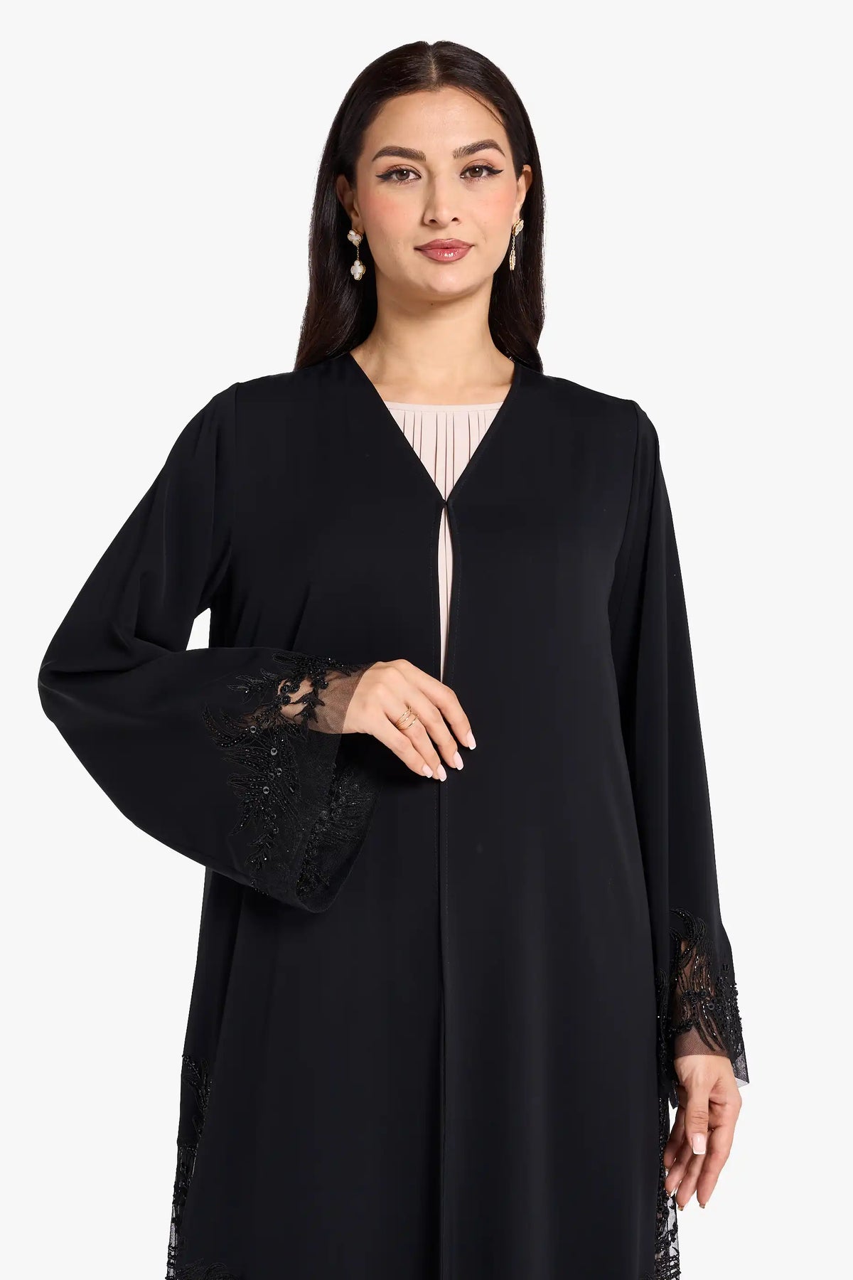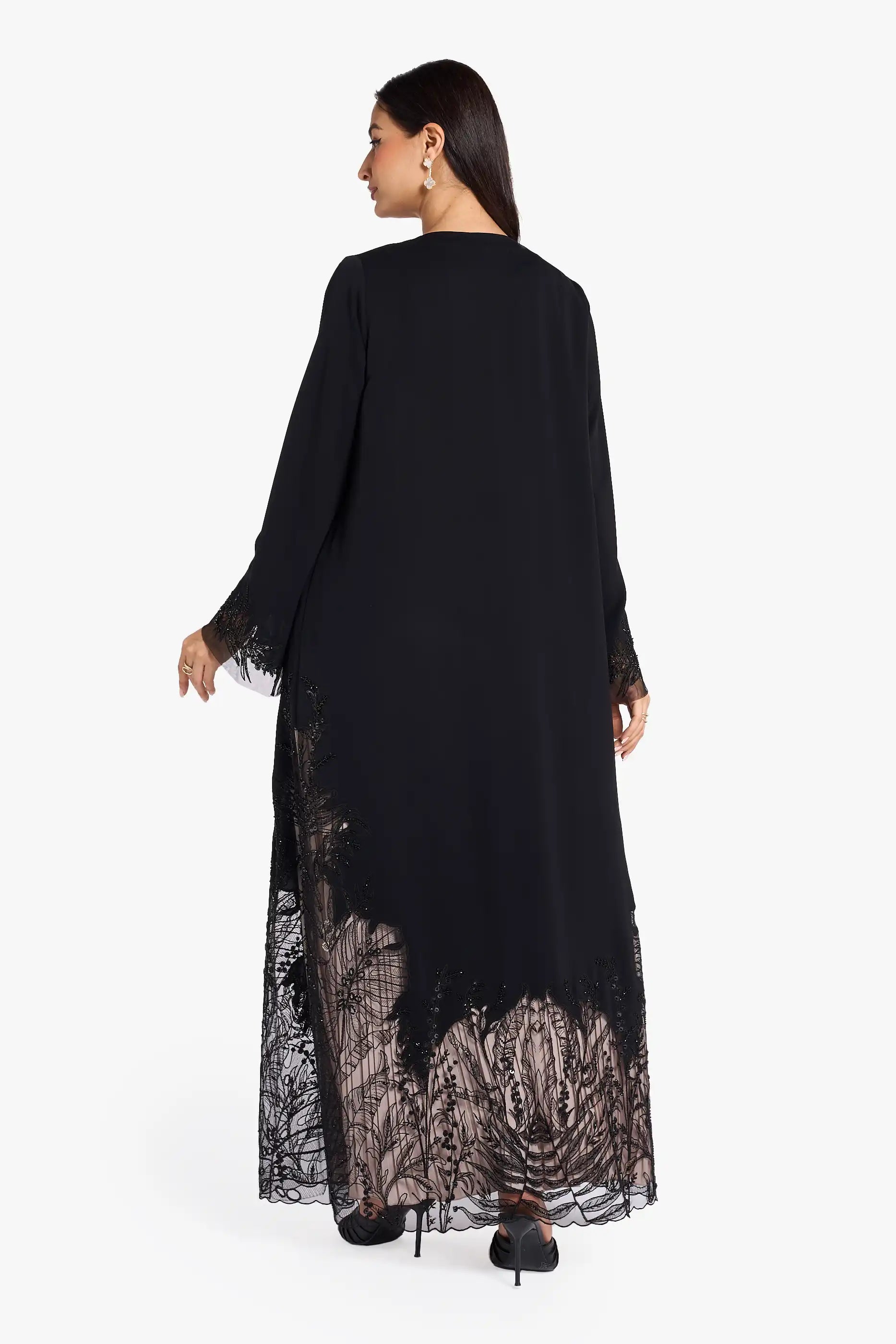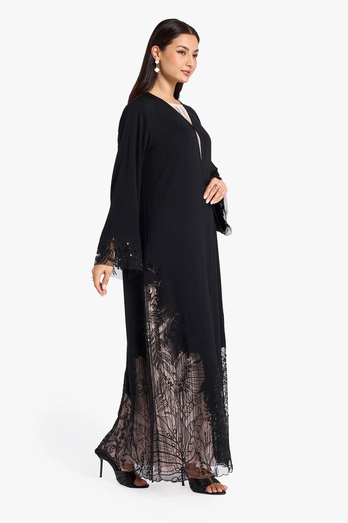 عباية لوزان VIP مصنوعة من قماش النيدا، مطرزة بزخارف نباتية استوائية دقيقة باستخدام الزري والدوري، ومزينة يدويًا بكريستالات براقة وخرز رقيق، تجمع بين الفن والأناقة. مثالية للمناسبات الراقية والملفتة.