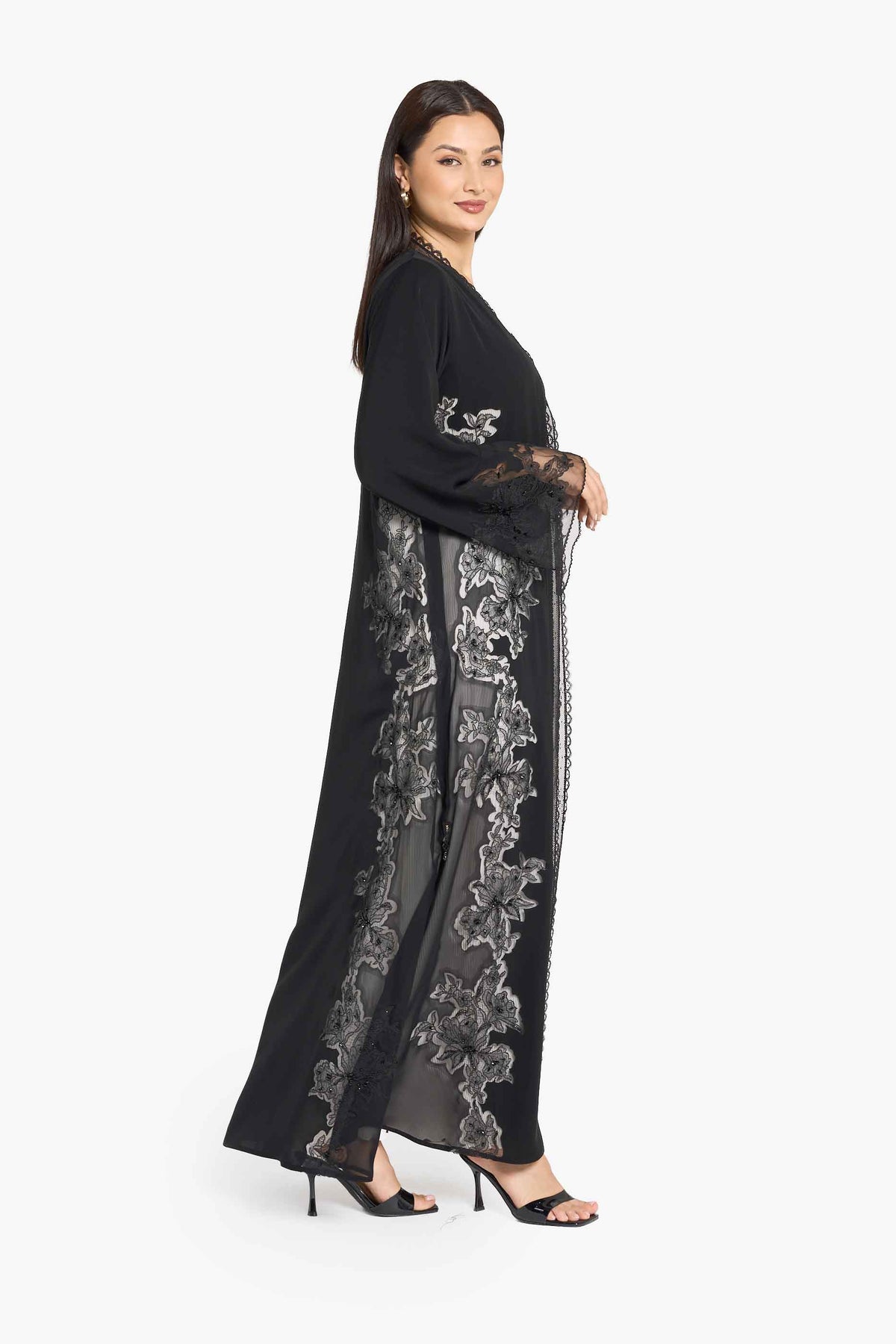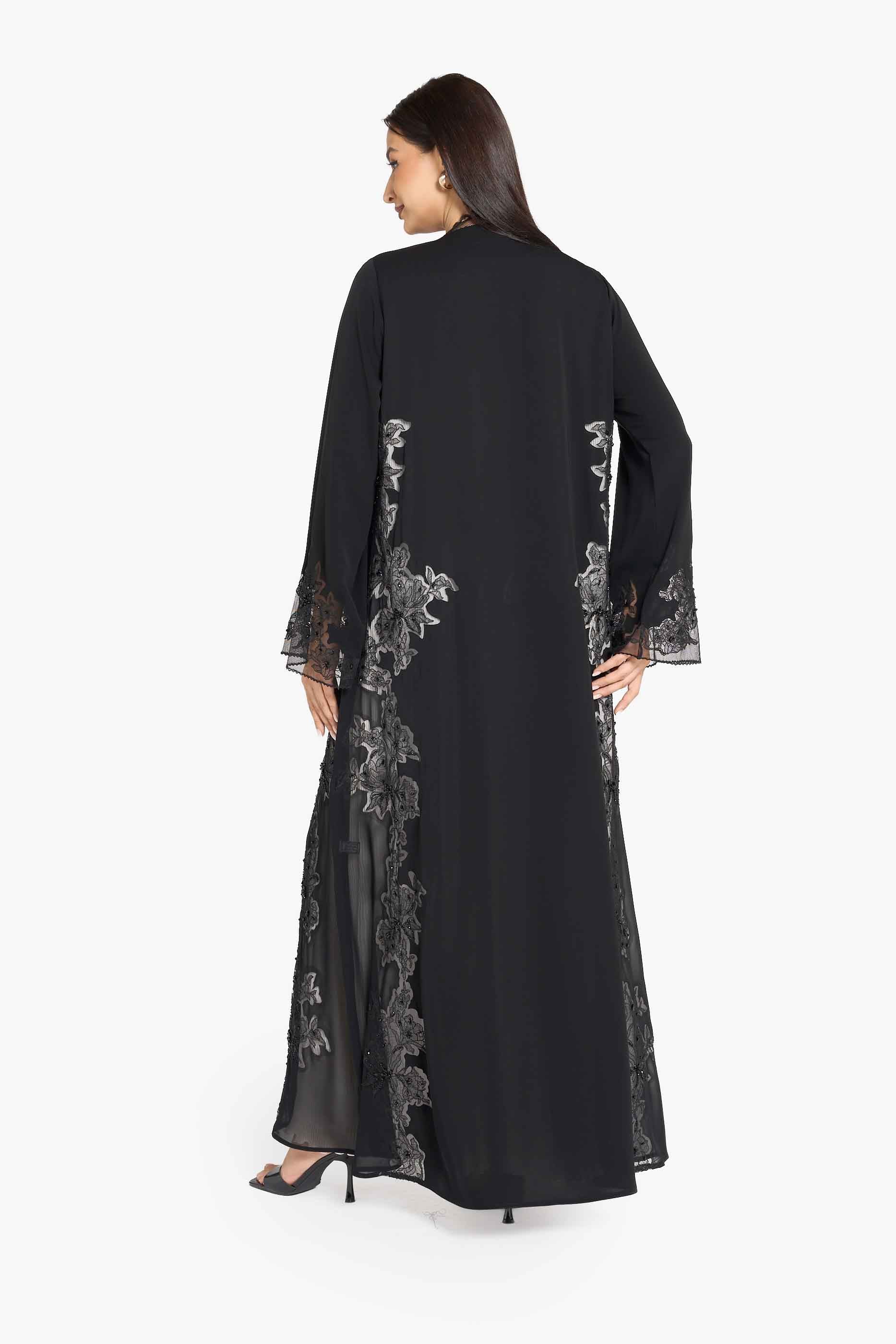عباية سوداء مزينة بتطريزات زهرية فرنسية بارزة ومرصعة بالكريستال