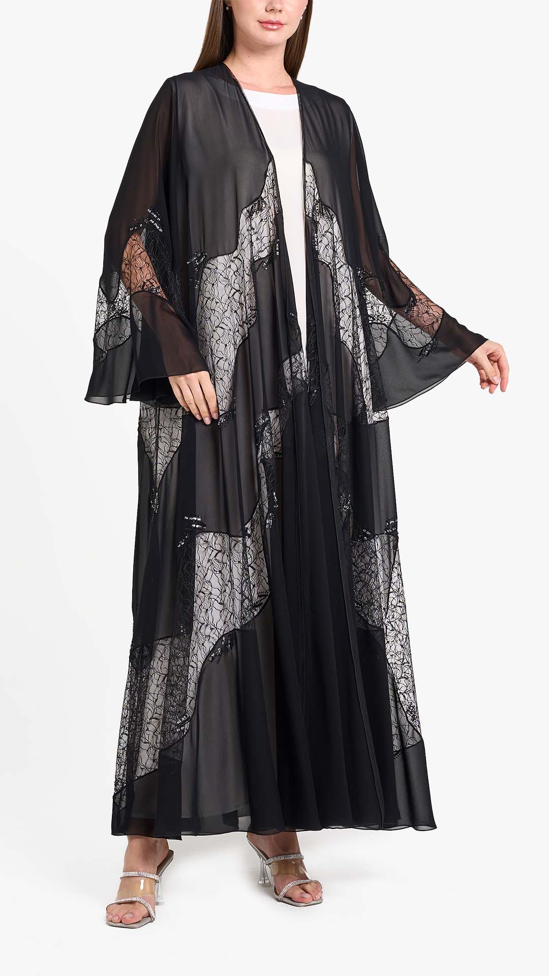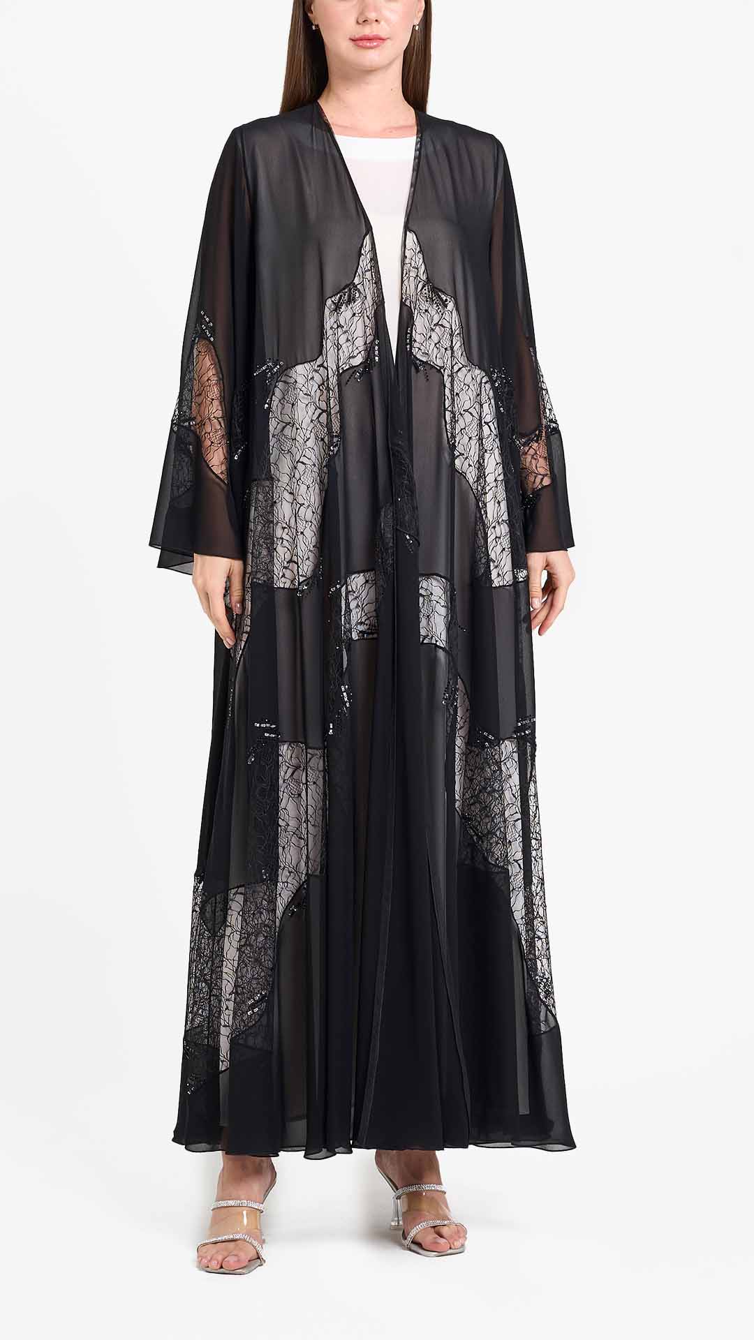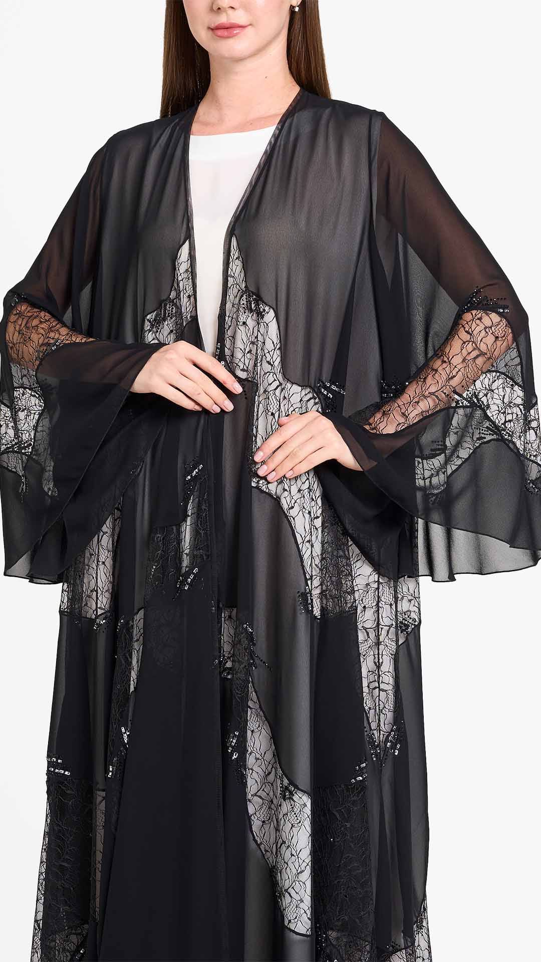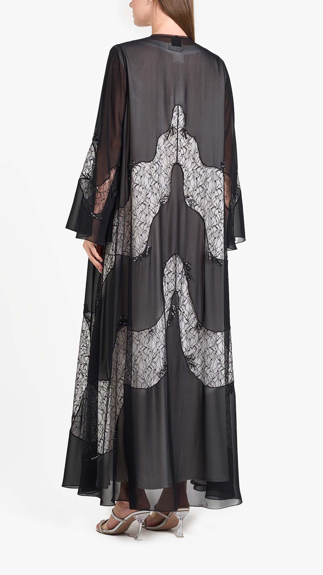 عباءة زفاف لوزان مصنوعة من قماش الشيفون والدانتيل مع تصميم لوحة تجريدية، مزينة بالترتر والكريستال والخرز.
