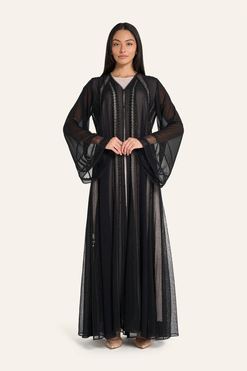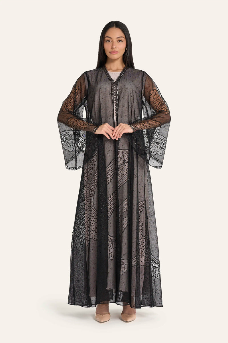 عباية زفاف من التول الأسود من لوزان | تطريز هندسي وكريستالات