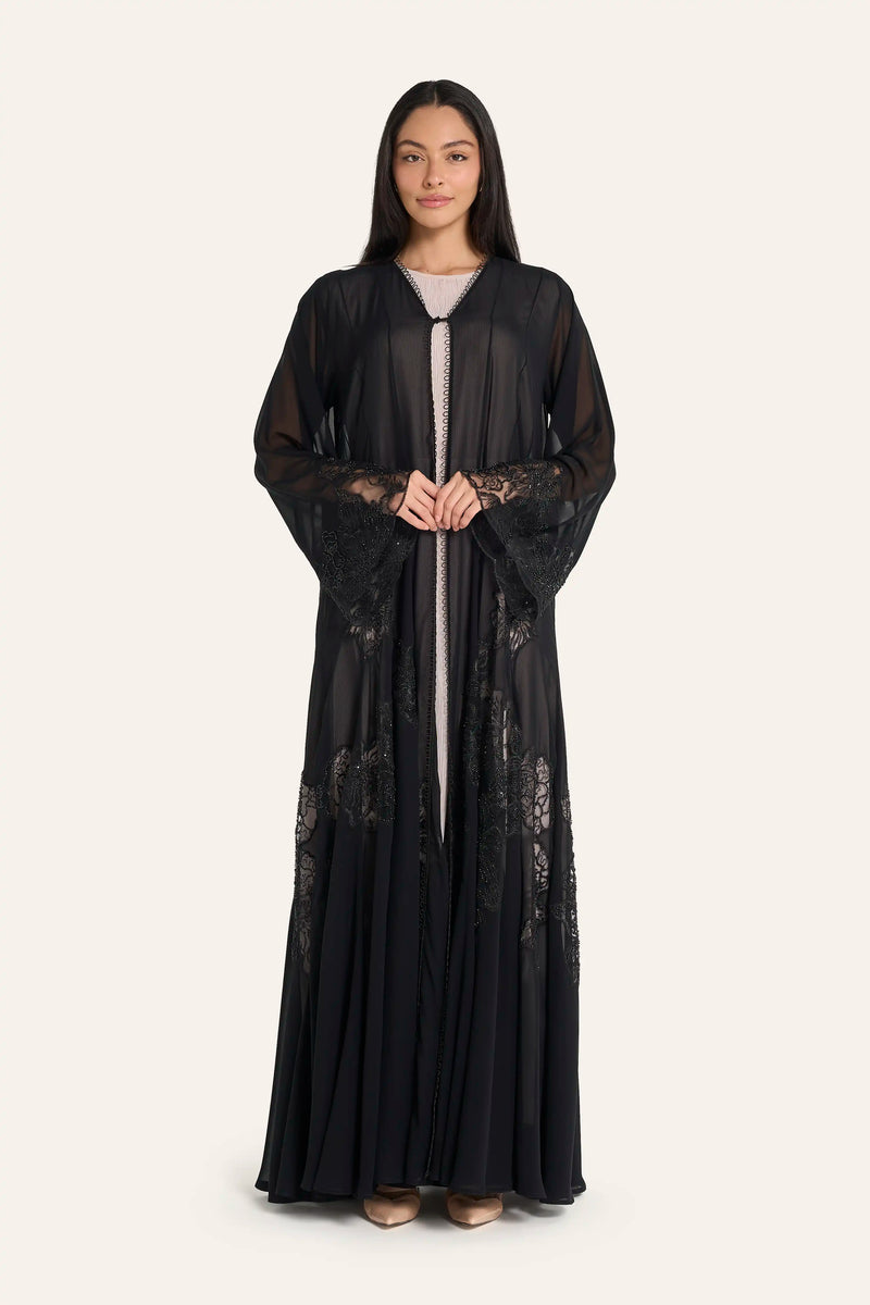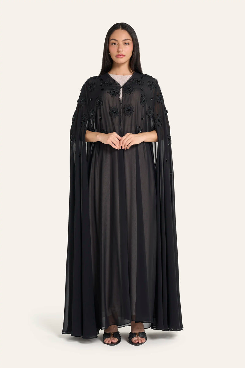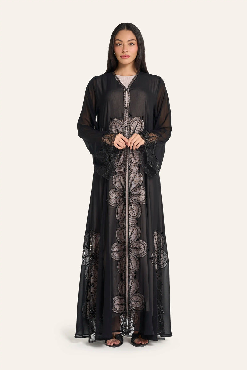 عباية زفاف من الشيفون الأسود من لوزان | تطريز ثلاثي الأبعاد بالكريستال الزهري