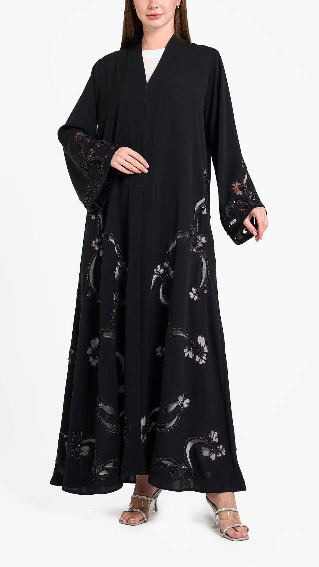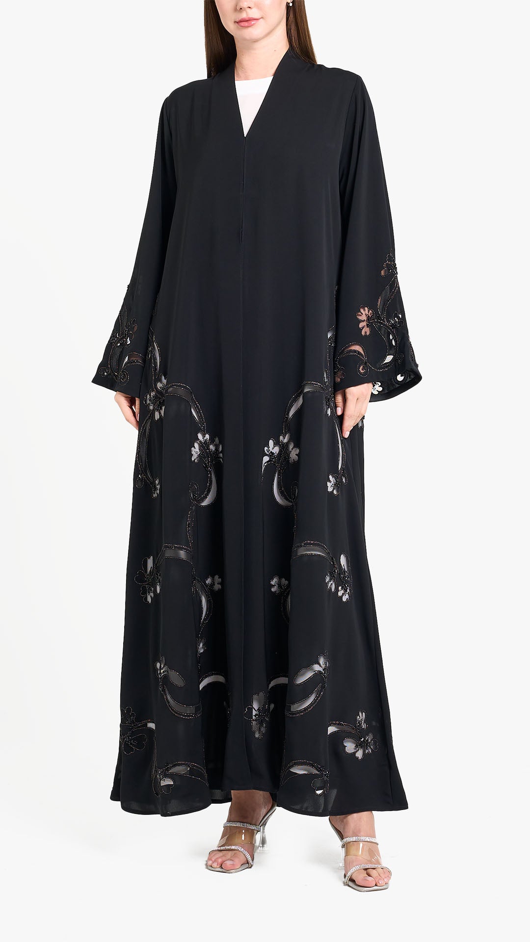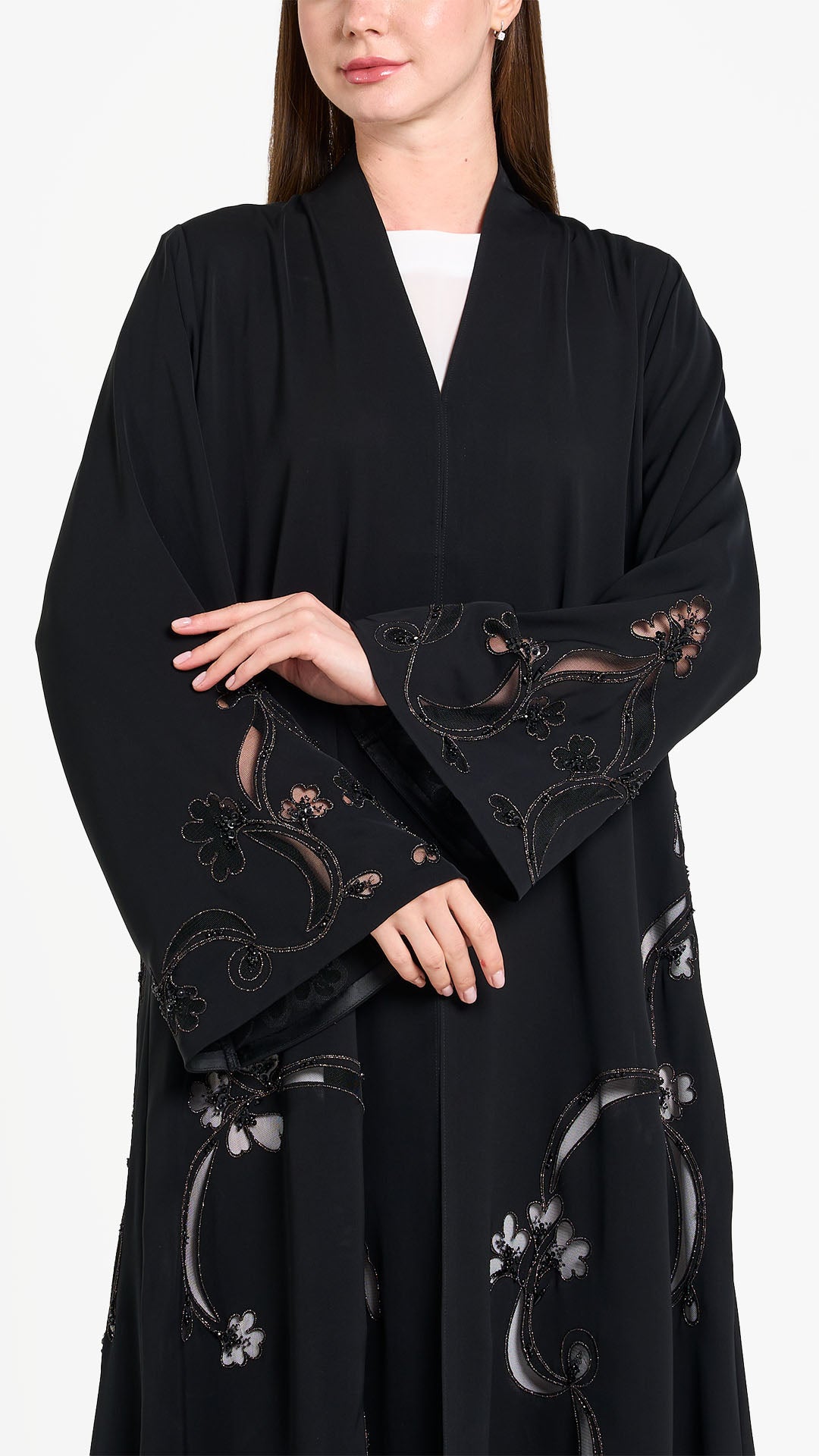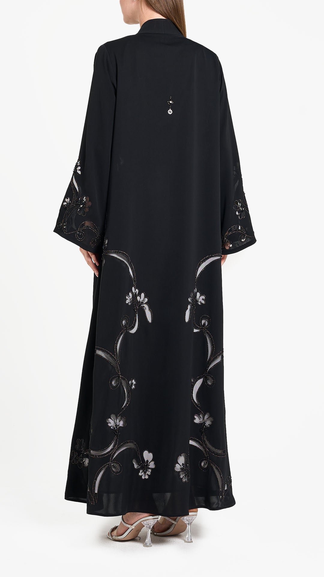 عباية لوزان مصنوعة من قماش النيدا مع تصميم مقطوع بالليزر وتطريز آري، مزينة بالخرز والكريستال.