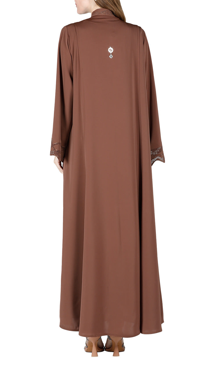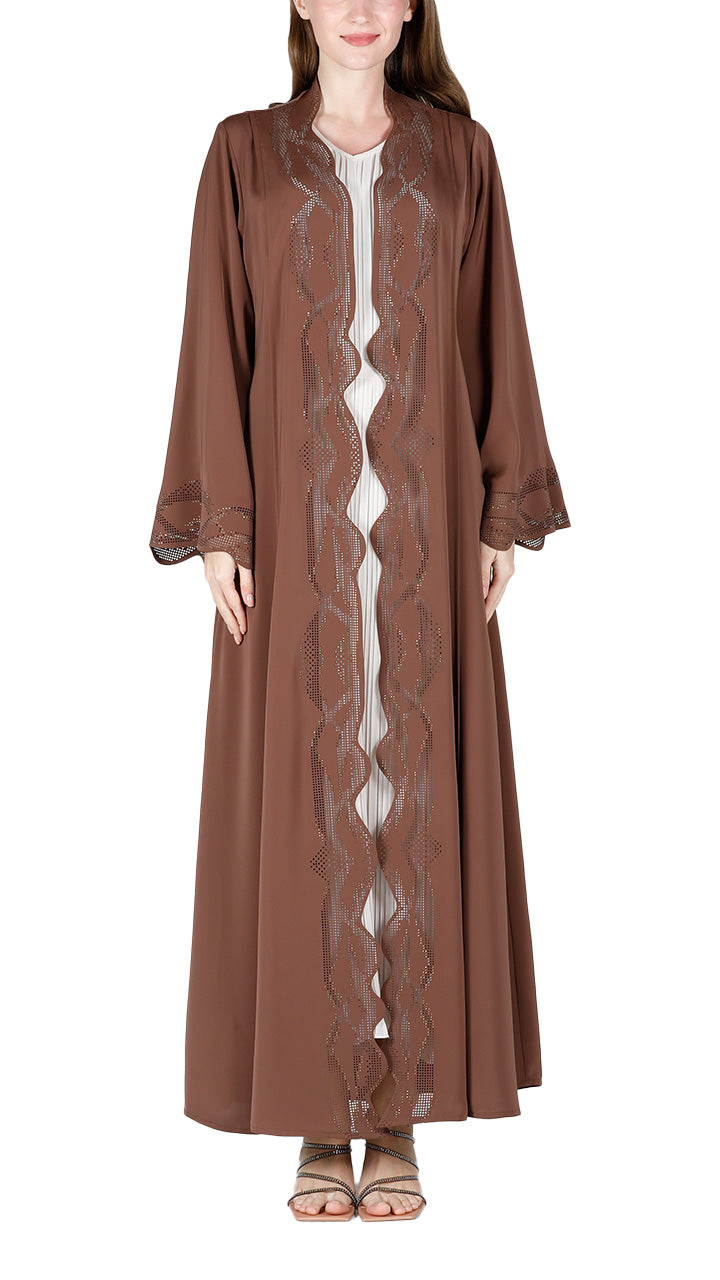 عباءة أنيقة باللون البني الفاتح مزينة بأحجار سواروفسكي تتألق بشكل مرح.