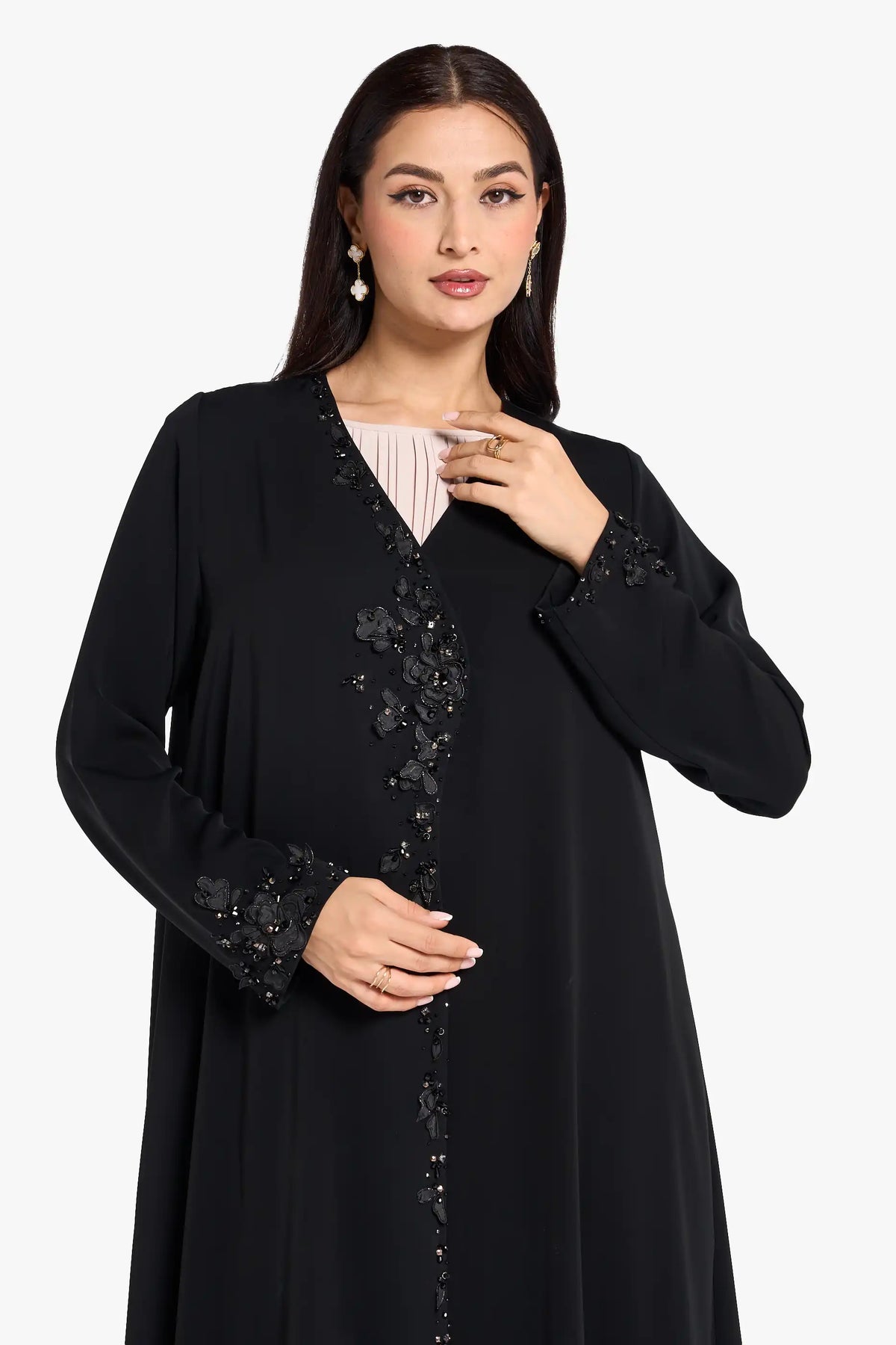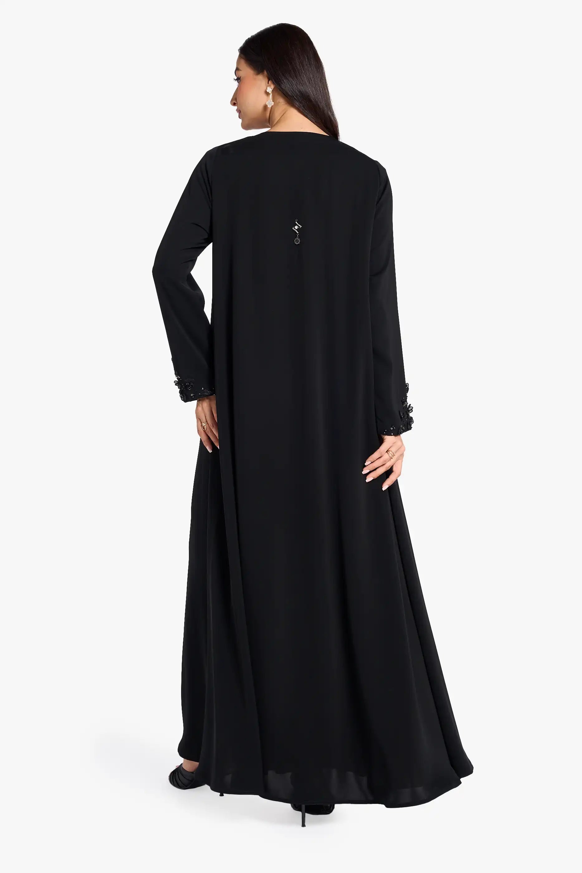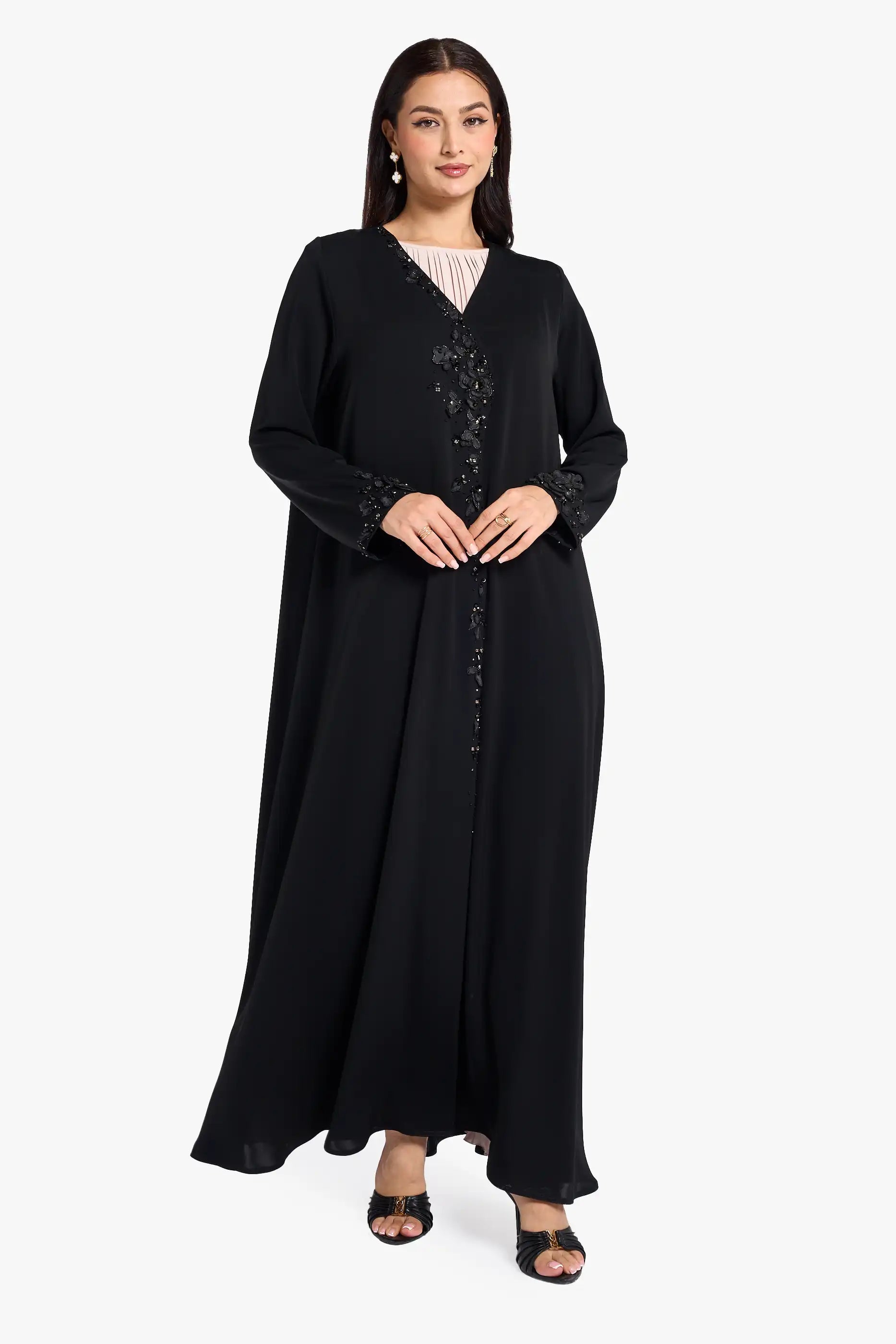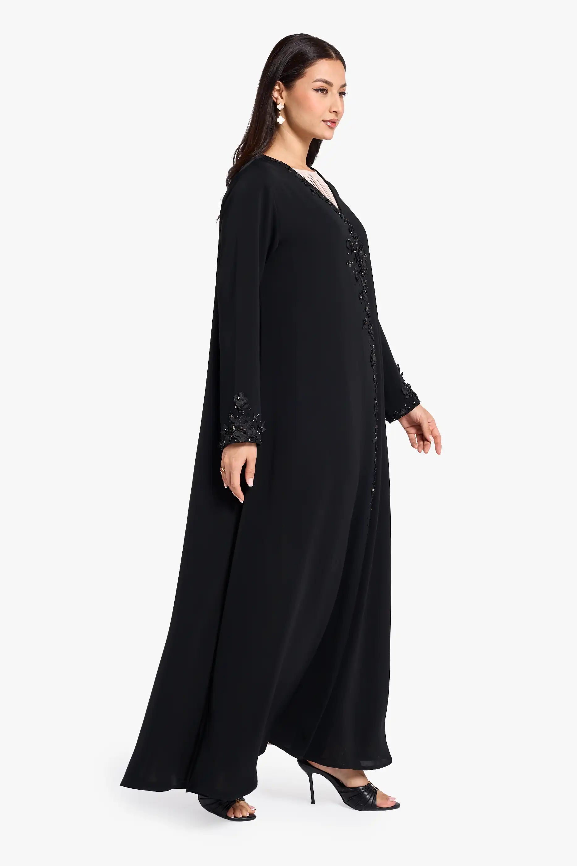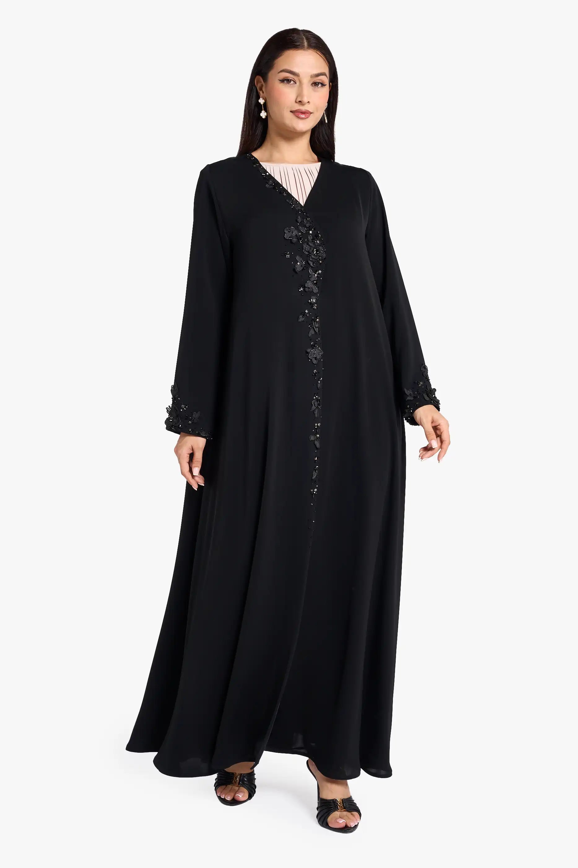 Louzan abaya carfted in nida fabric with asymmetrical neckline adrone with delicately embroiderd floral petals, hand embroidered crystal embellishments in different shapes add a subtle spakle, creating a look of elegance and artistry.