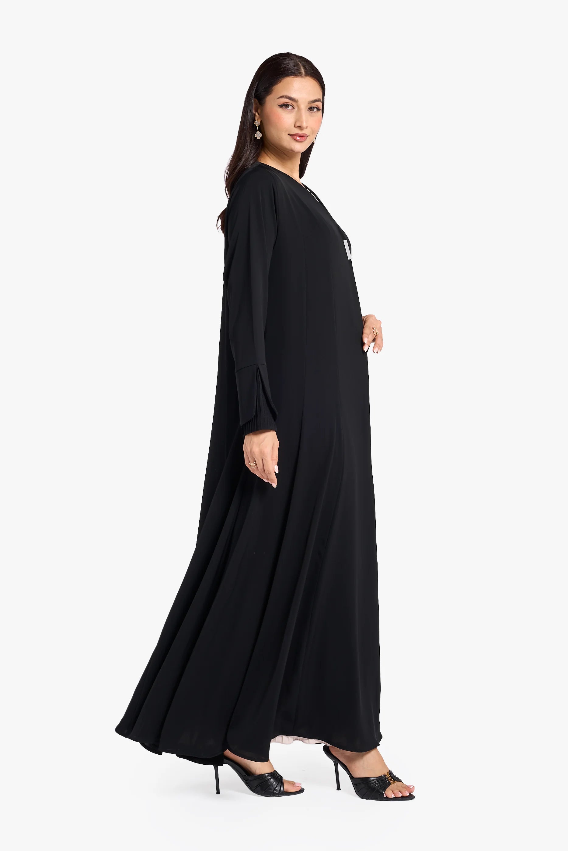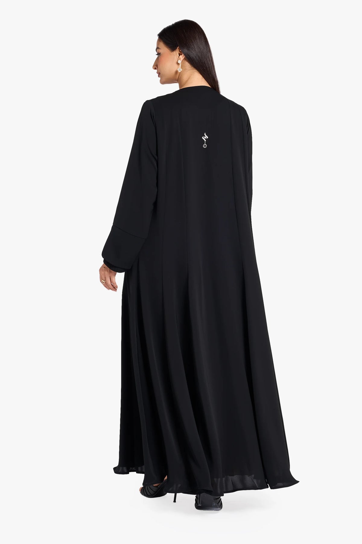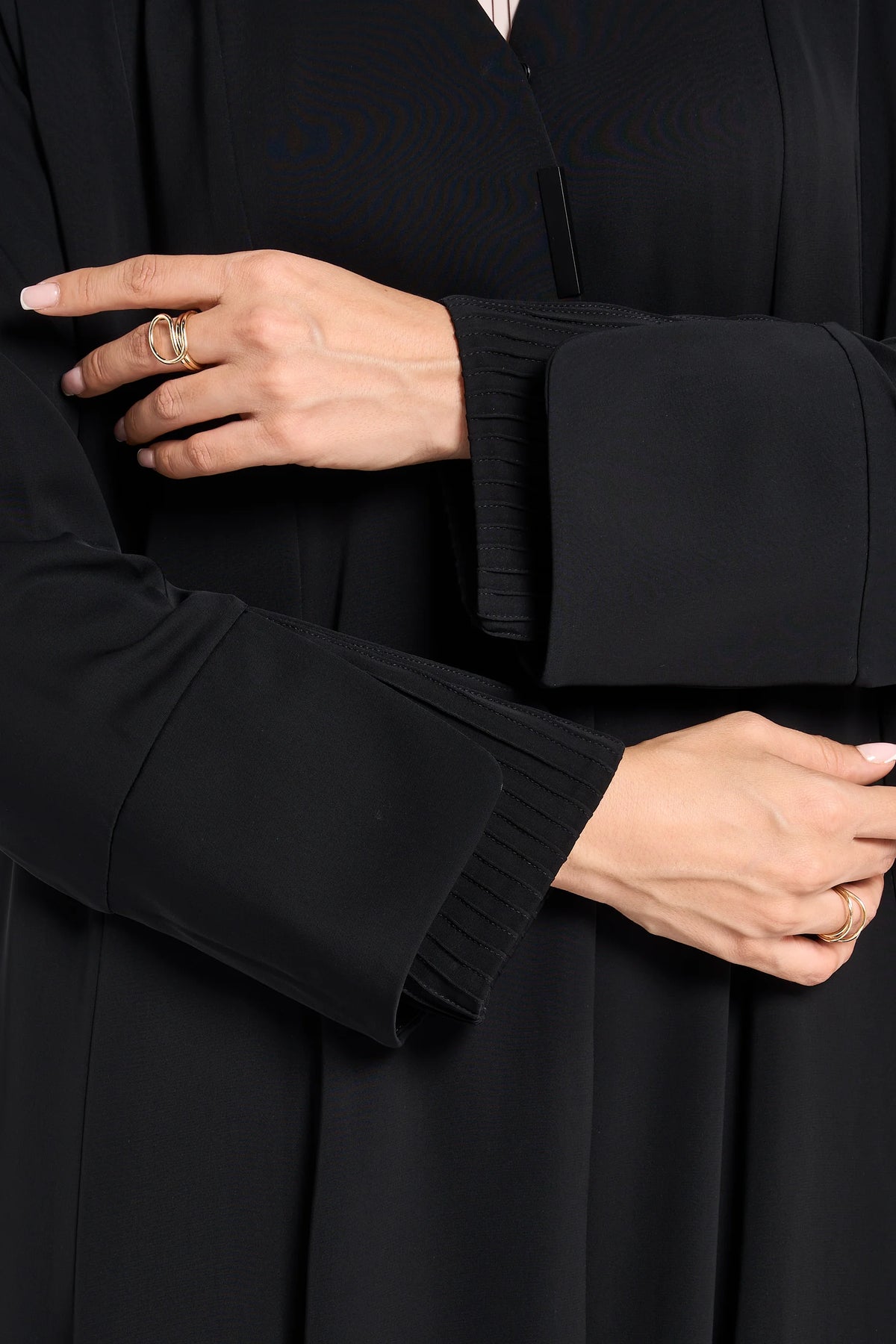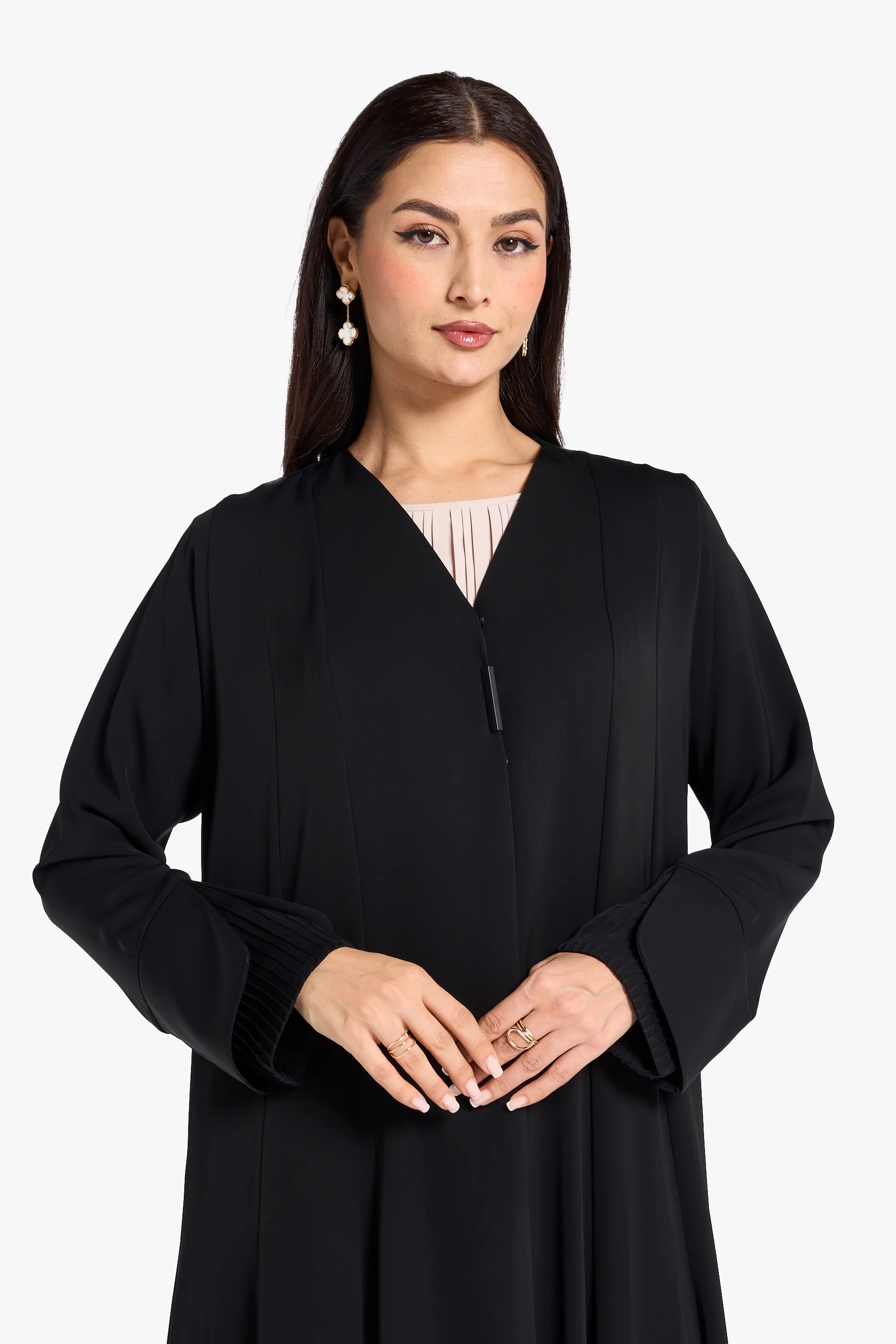 Louzan abaya crafted in nida fabric with flaterring princess-line silhouette and flared hem. Pintuck detailing at cuff adds texture and refinement and metal trim details adds modern elegance. Perfect for effortless, everyday sophistication.