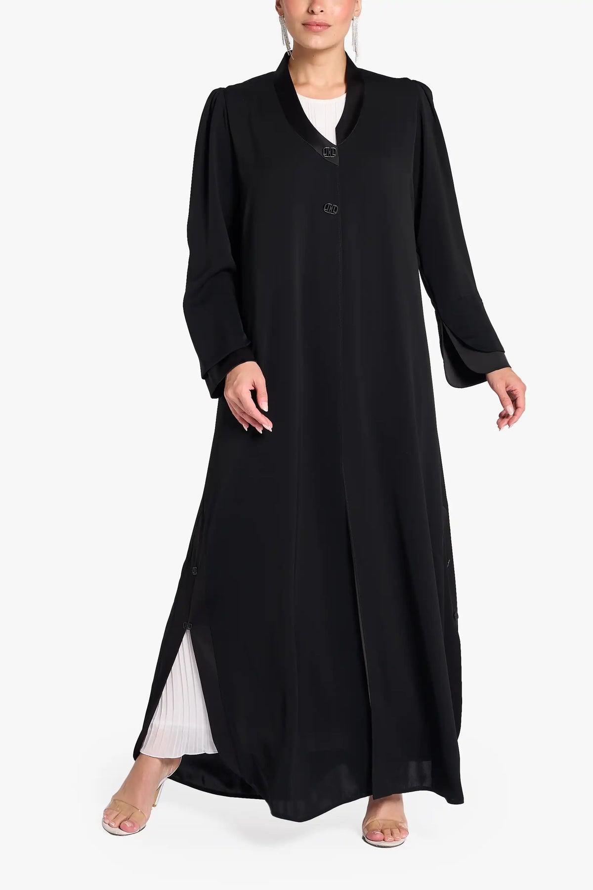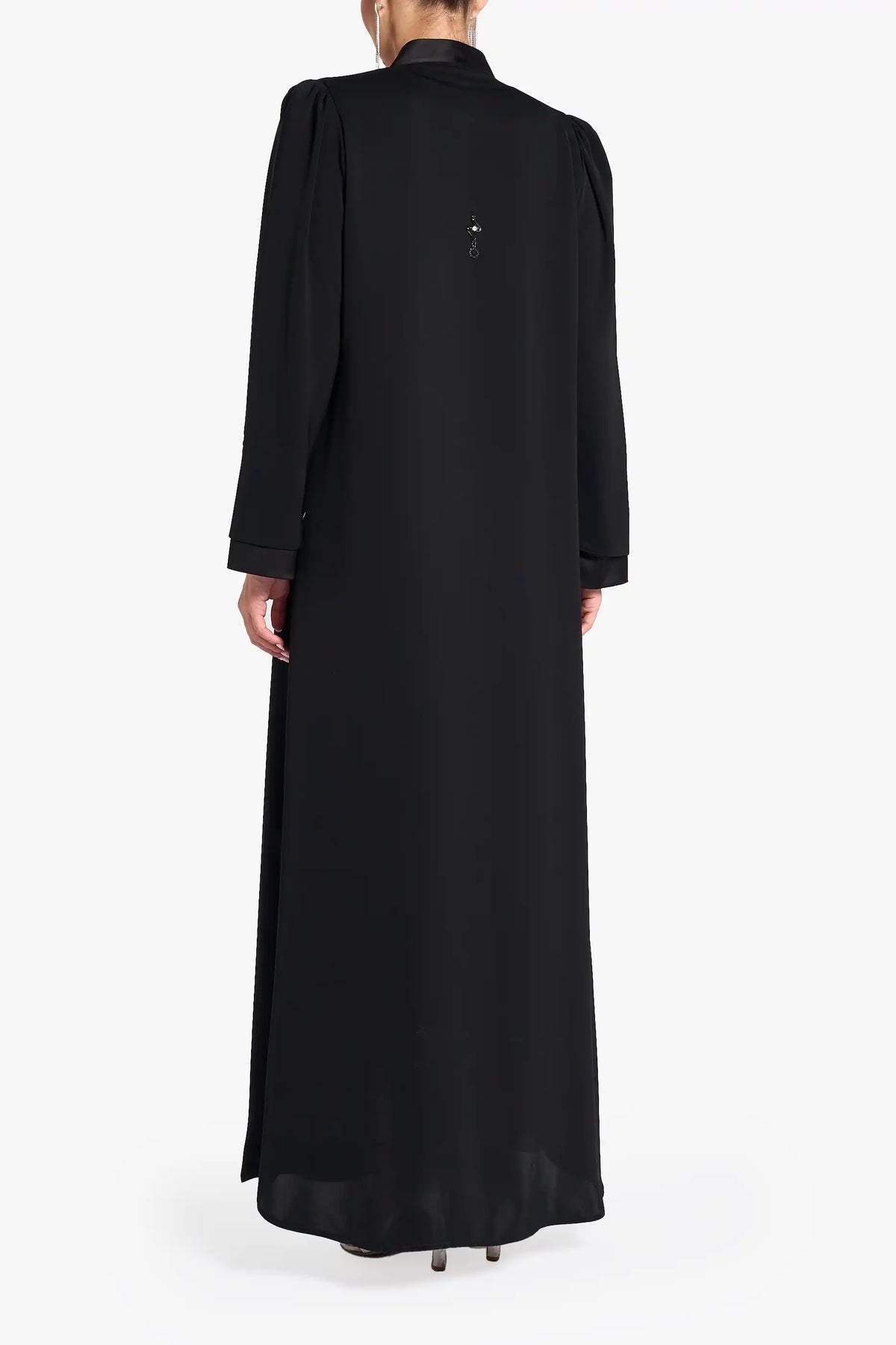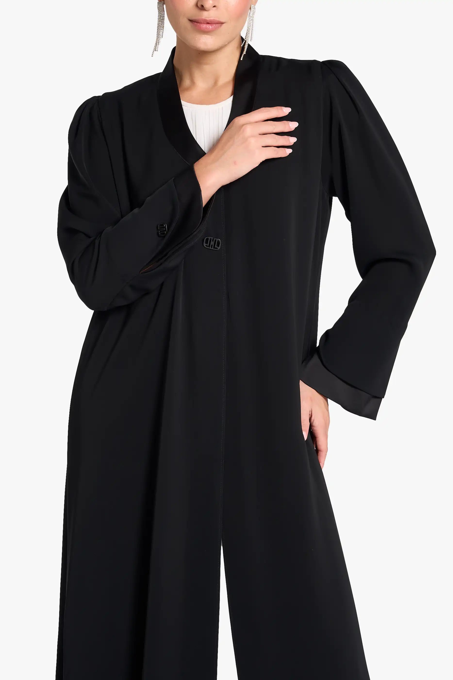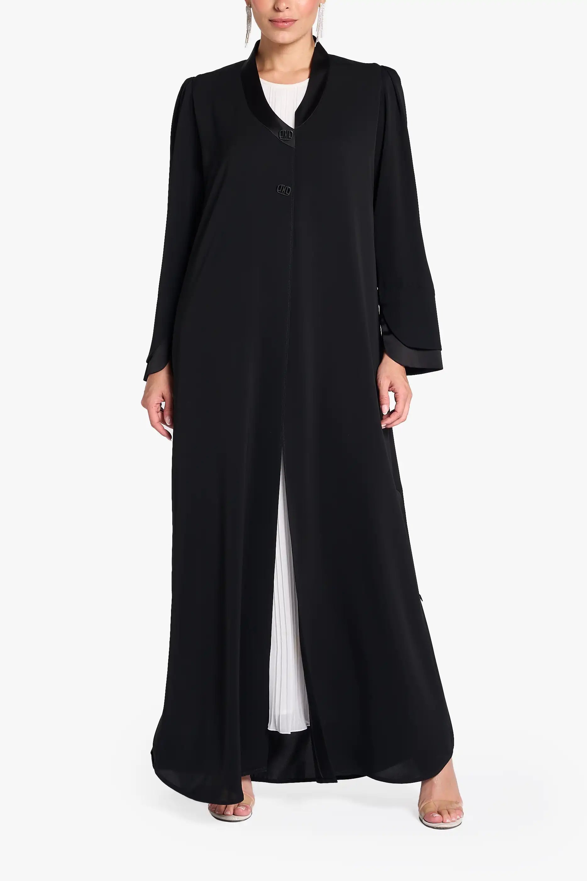Louzan abaya crafted in nida fabric with assymetrical collar and front placket design.