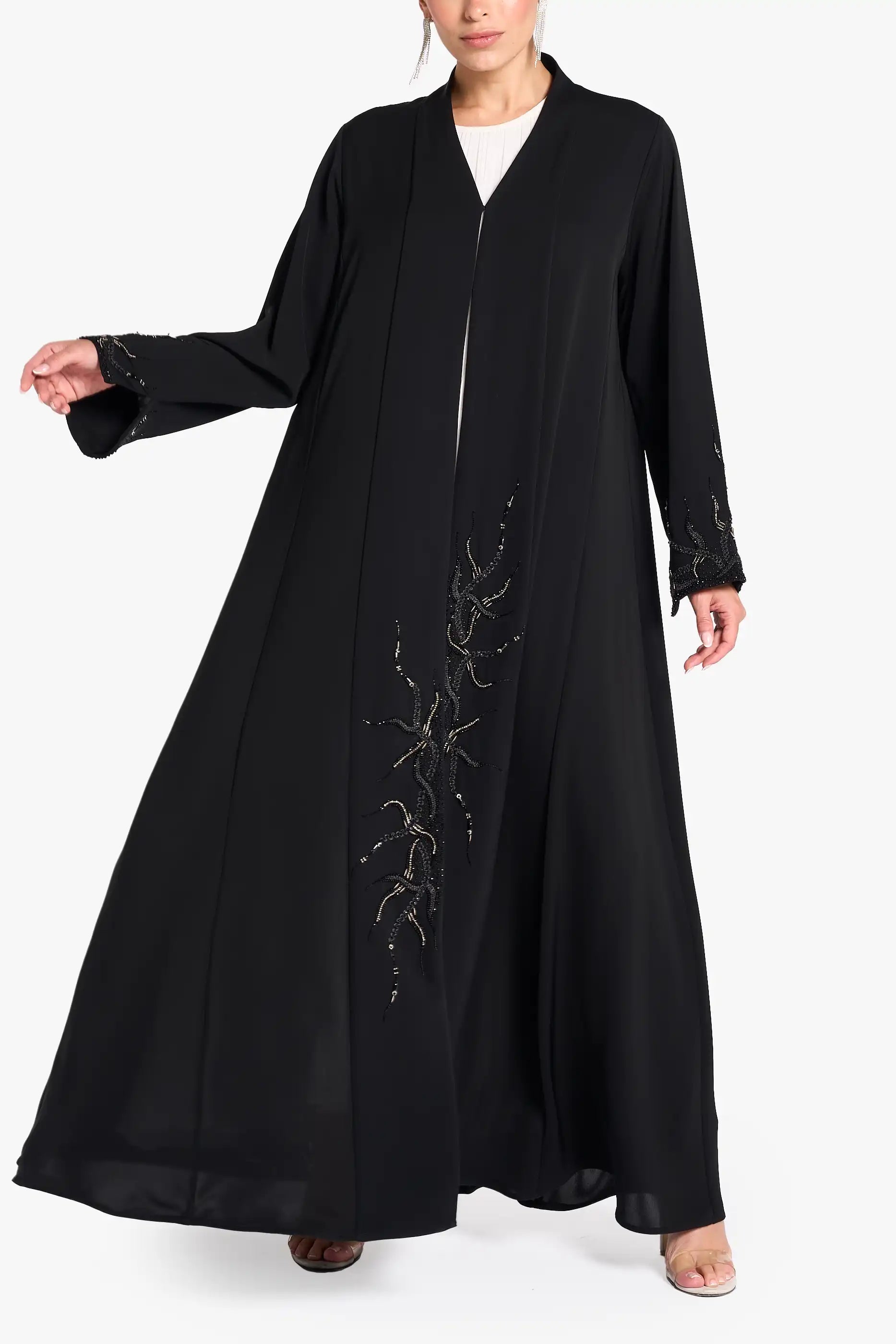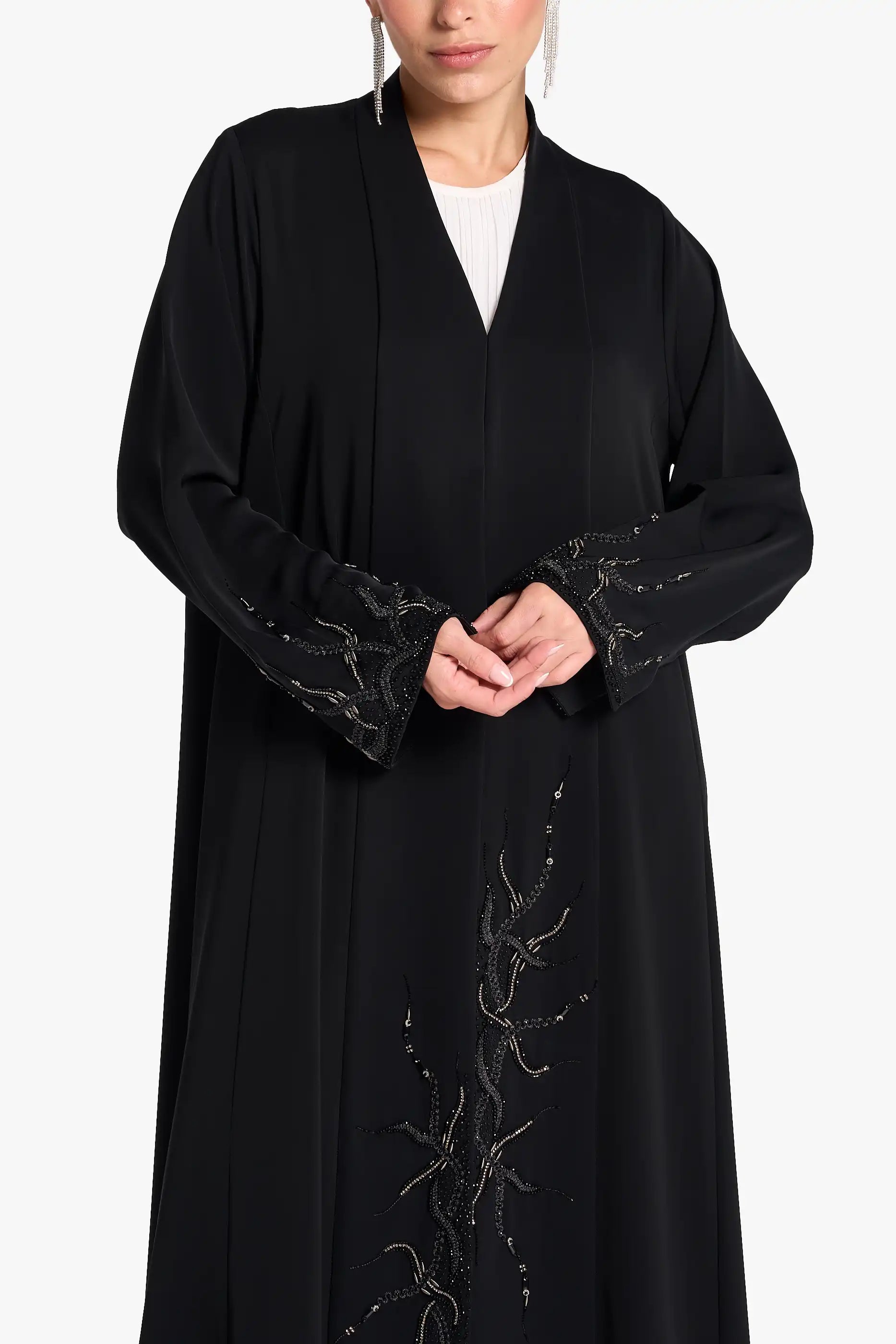 Louzan abaya crafted in nida fabric with abstract design dori embroidery, embellished with crystals and beads.