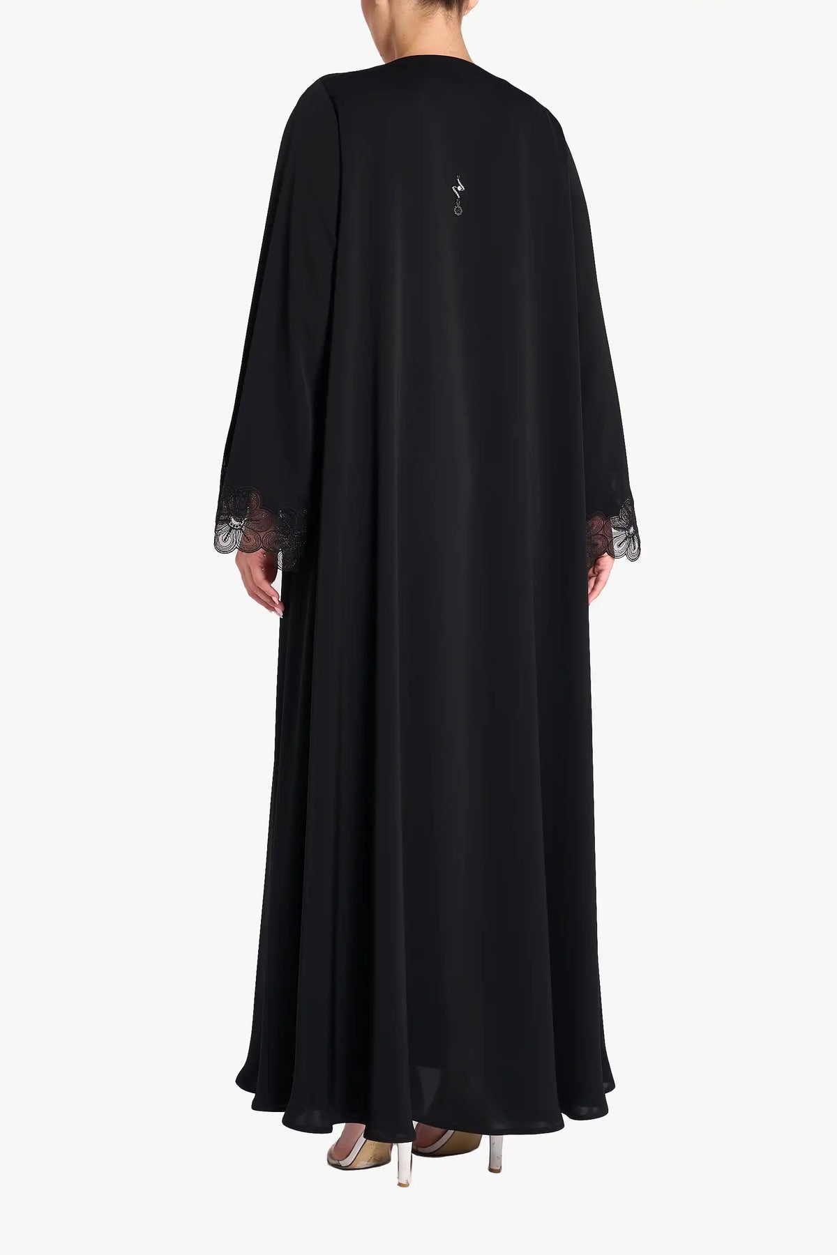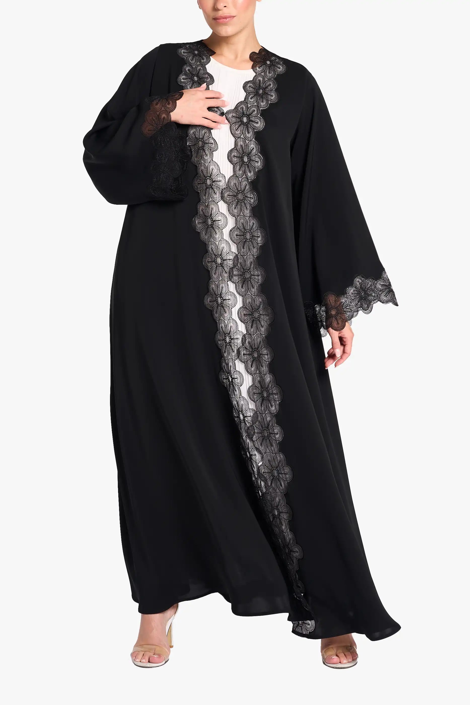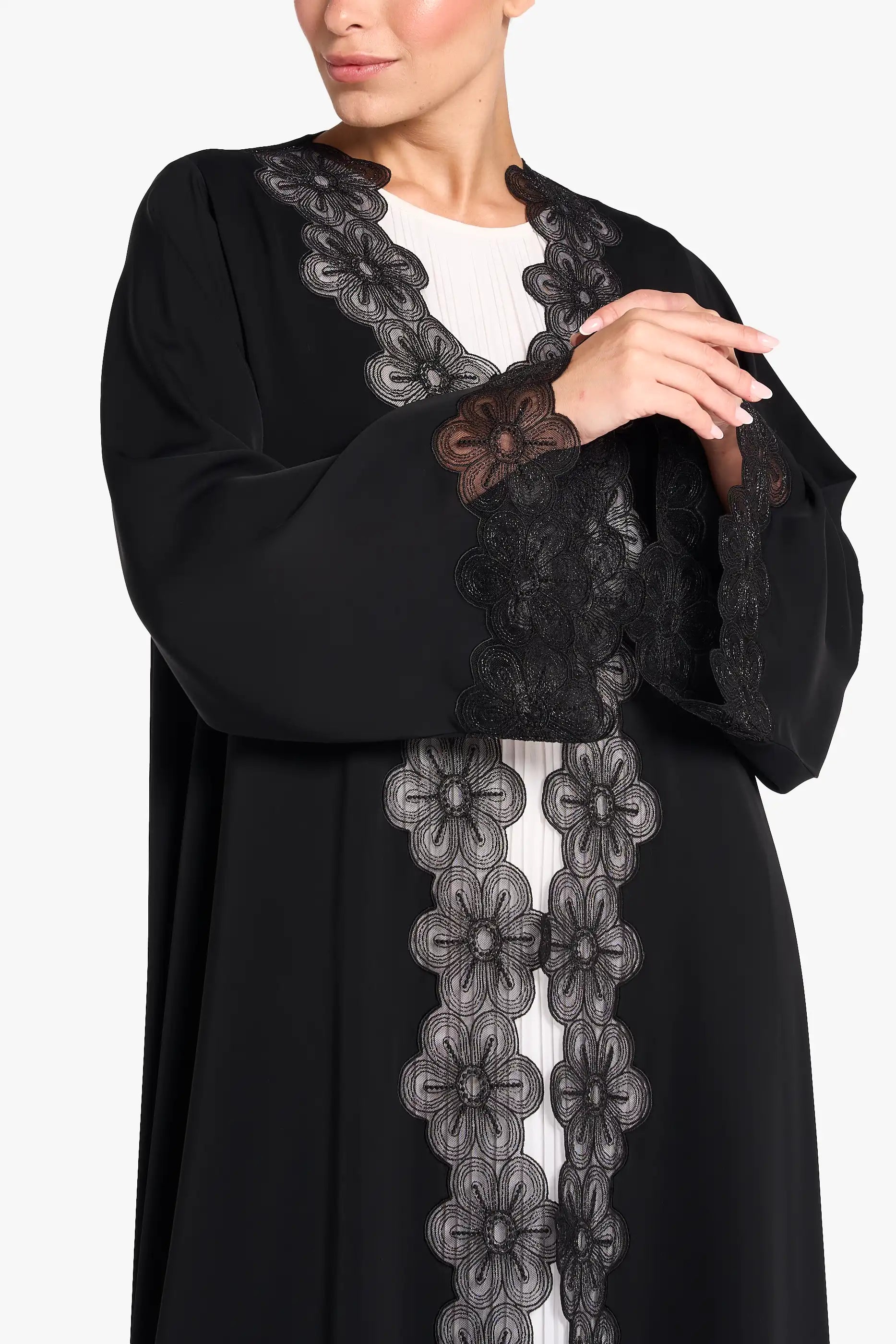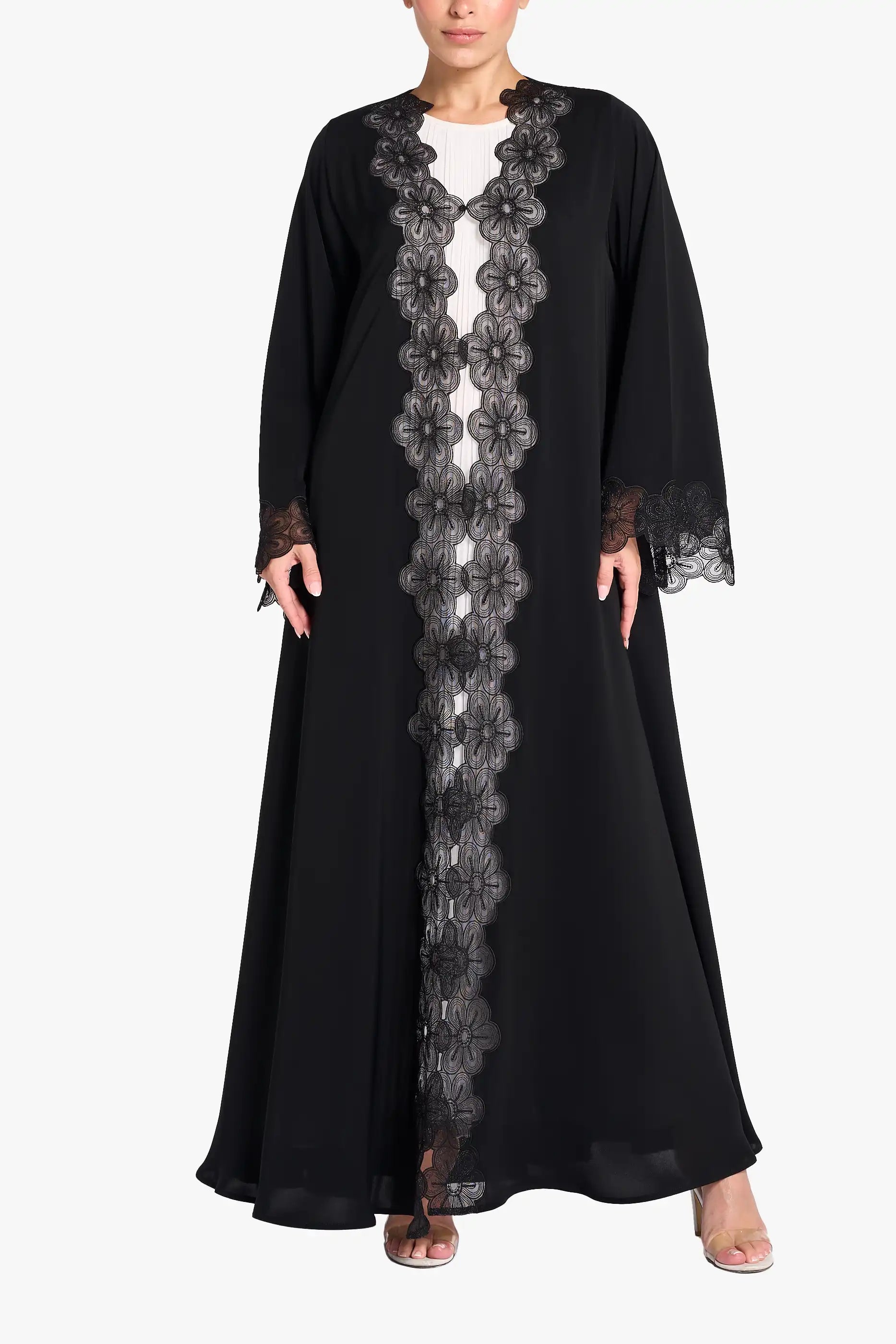 Louzan abaya carfted in nida fabric with floral dori embroidered lace design at front and cuff.