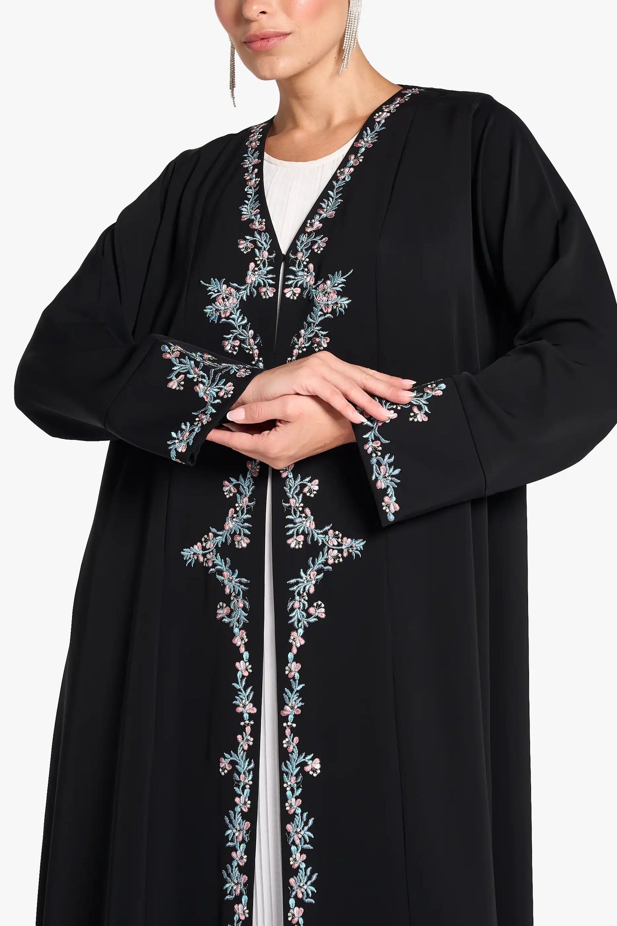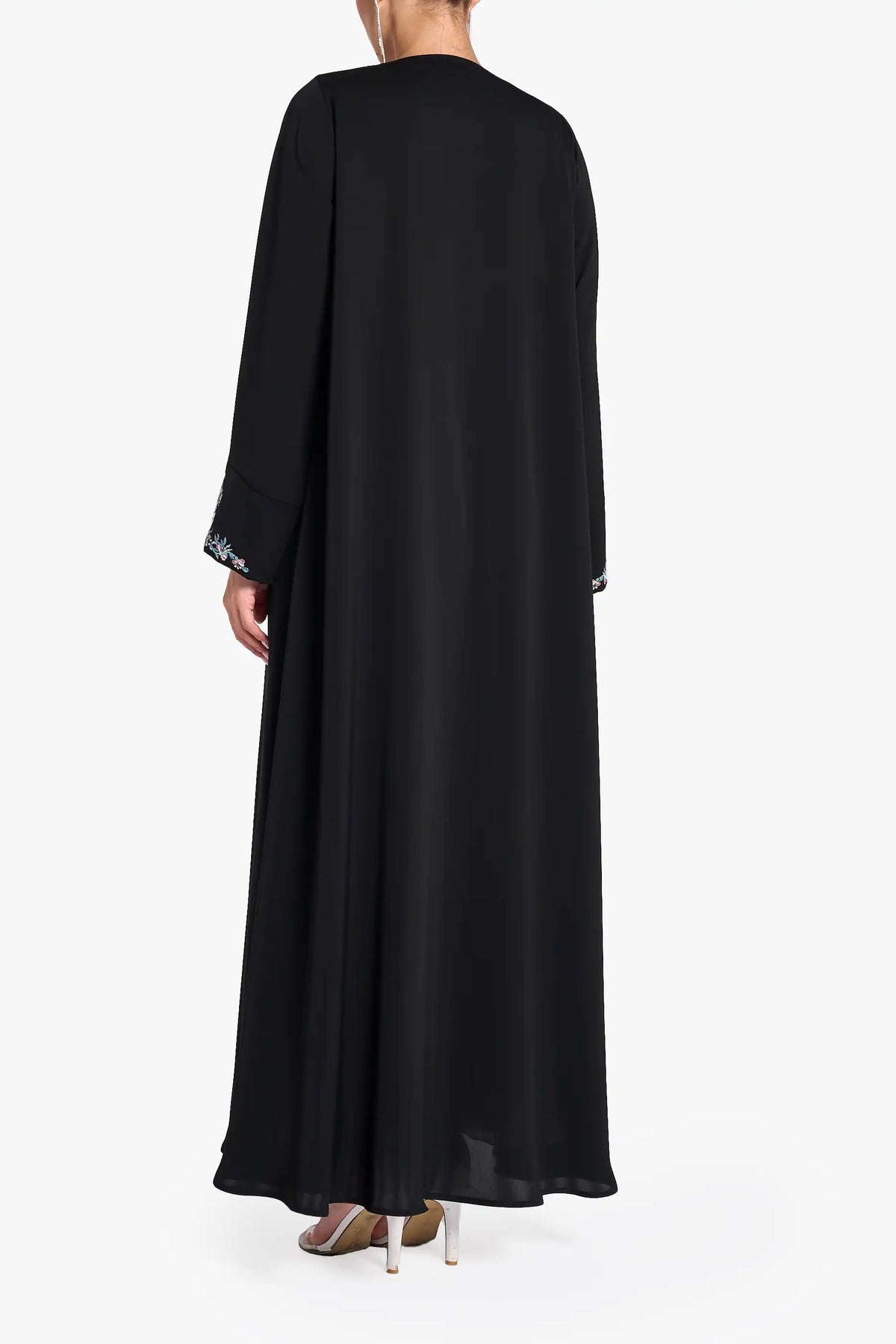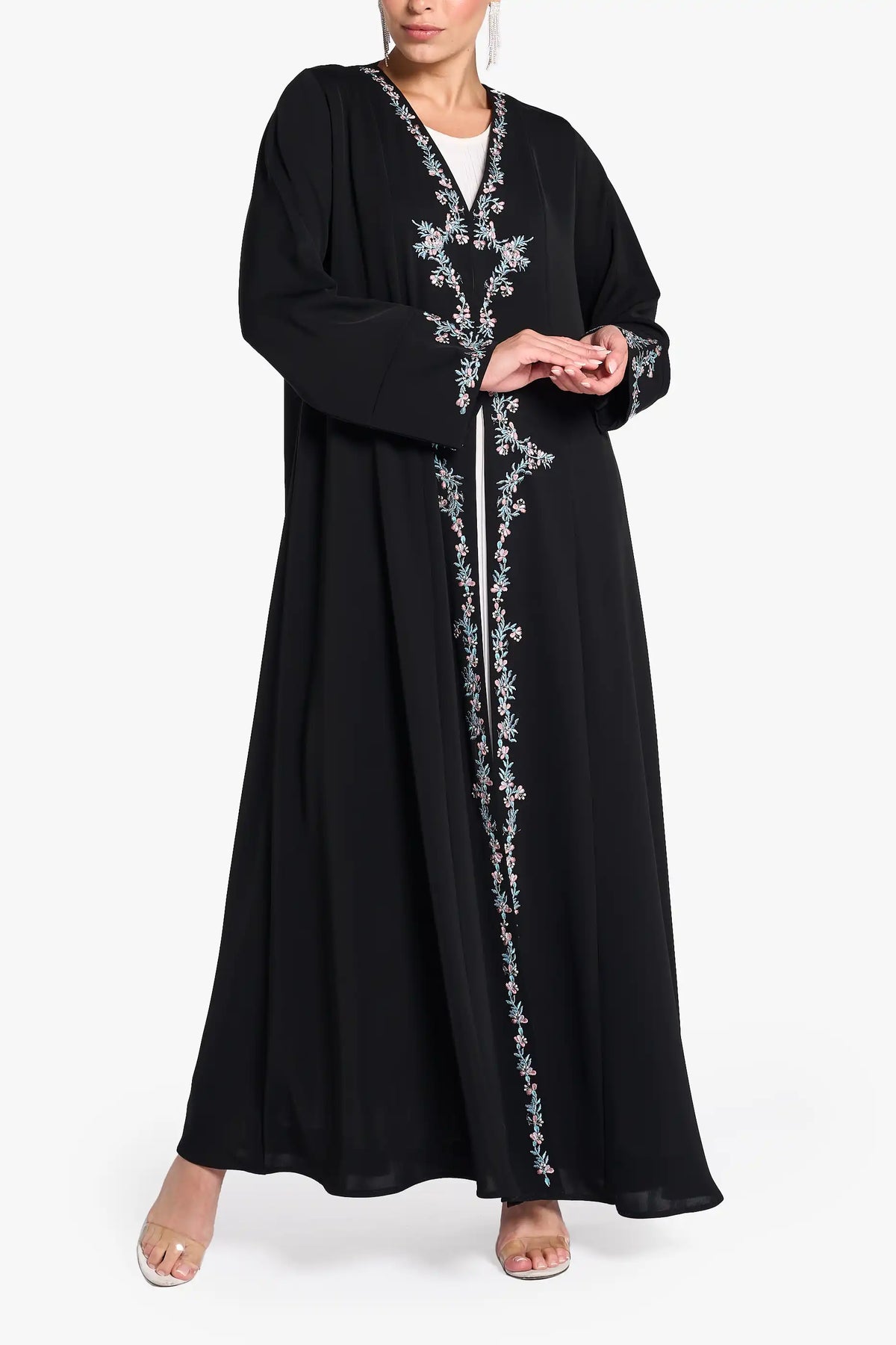 Louzan abaya crafted in nida fabric with ditsy colored floral design threand embroidery at front and cuff.