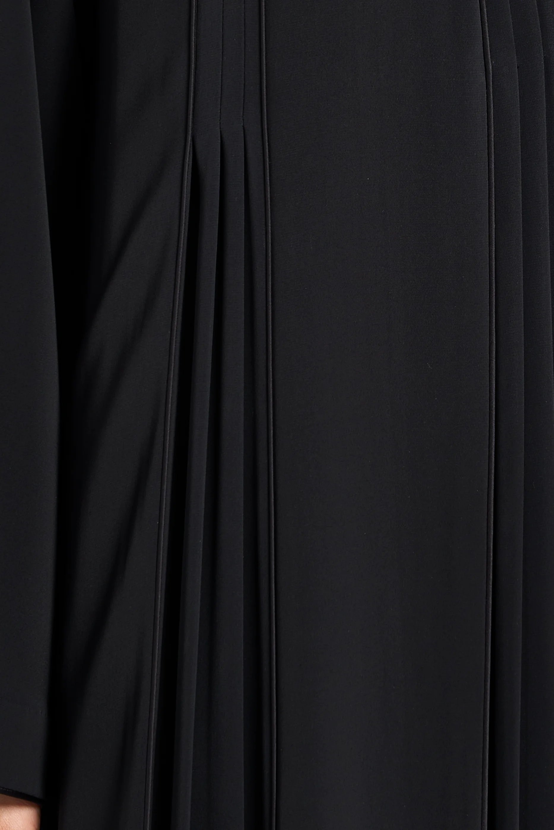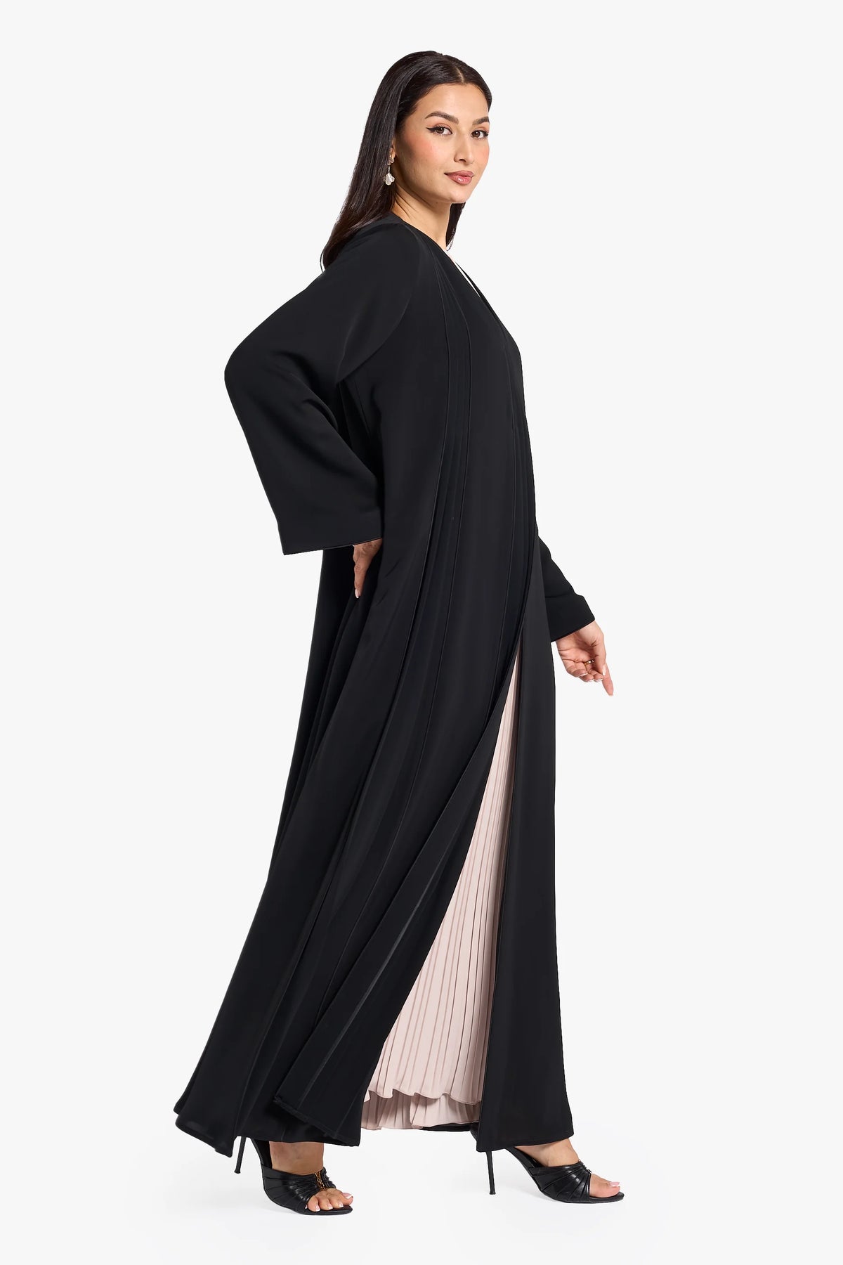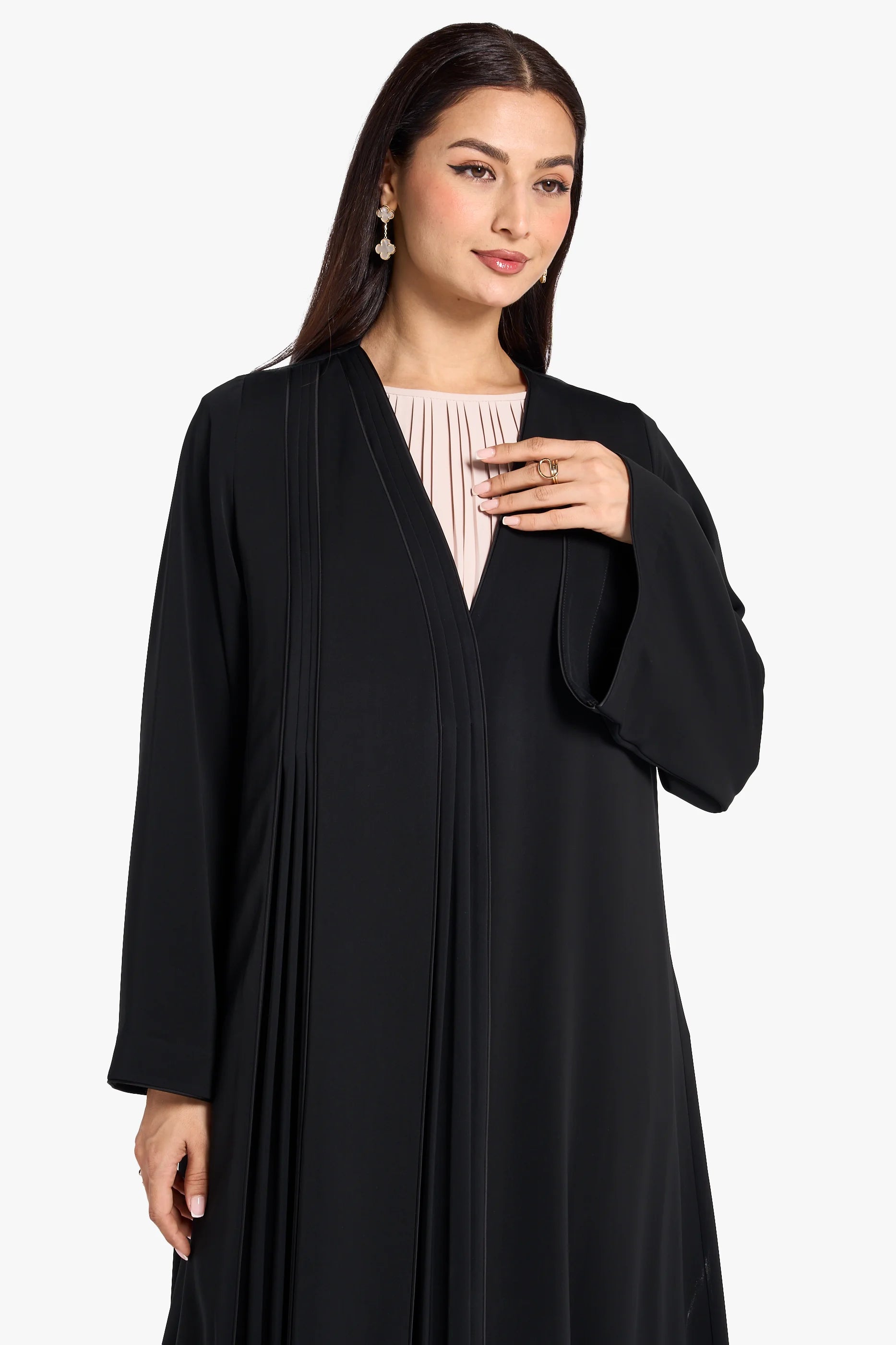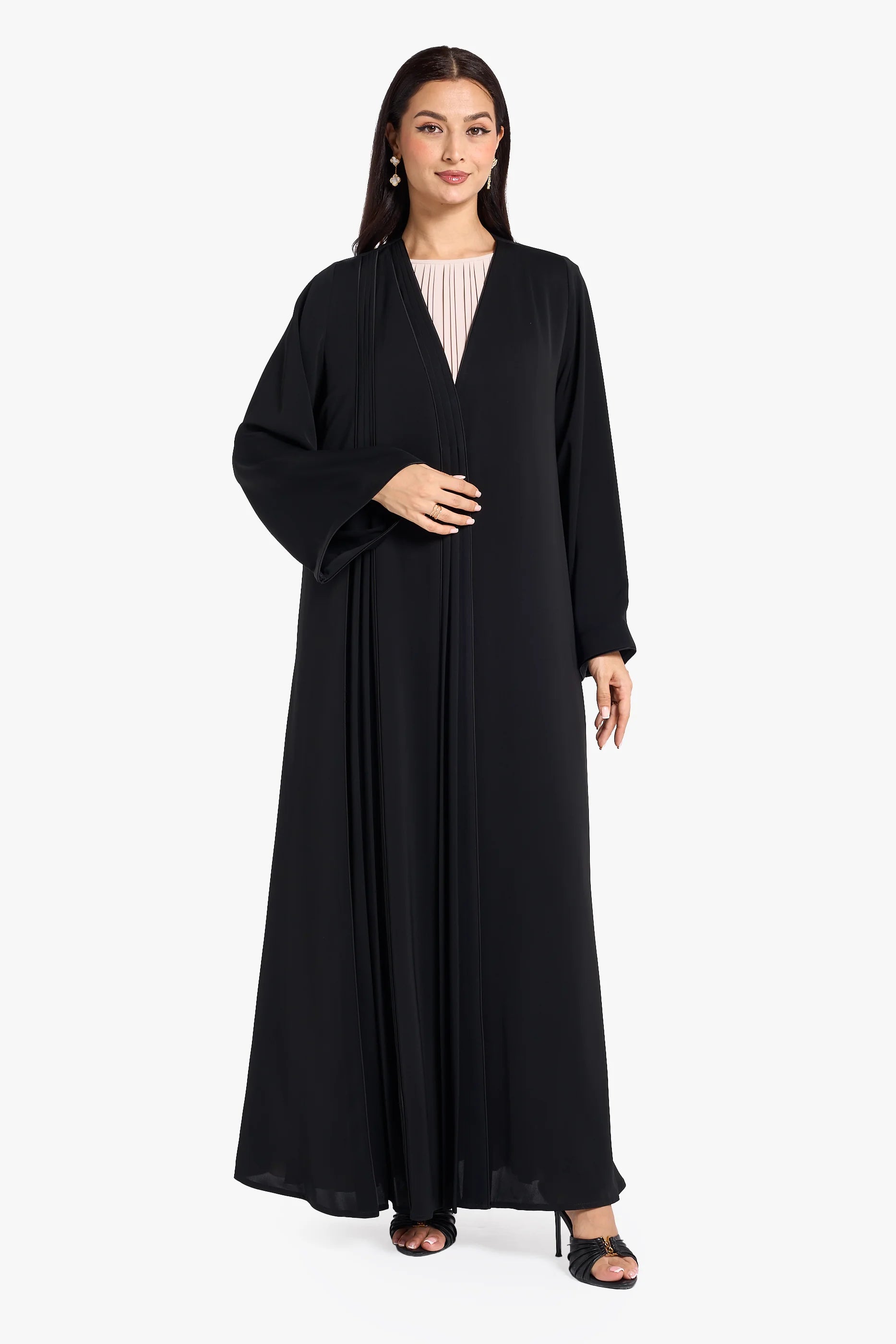 Louzan casual abaya crafted in nida fabric with refined knife pleats nd delicate piping detailing. A perfect blend of simplicity and style, ideal for everyday sophistication.