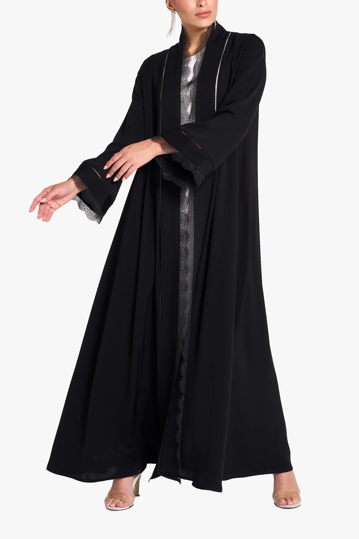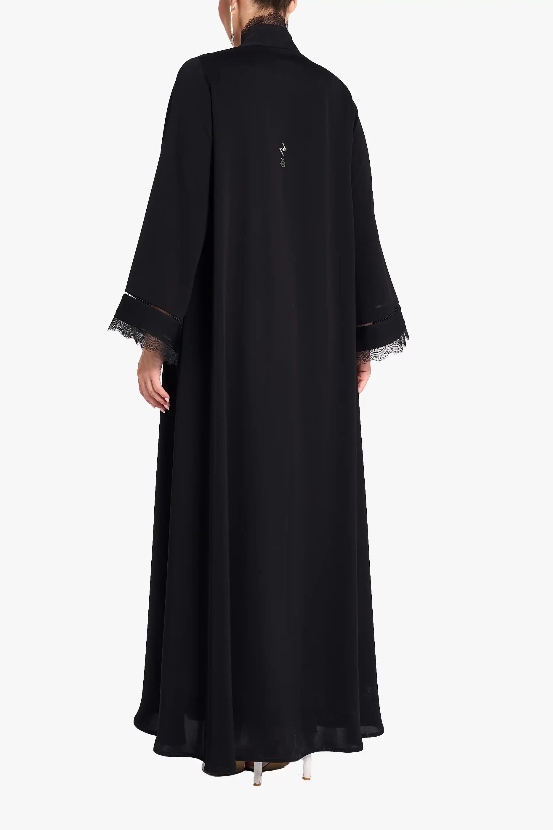 Louzan classic abaya crafted in nida fabric with lace inserts and lace detailing at front and cuff.