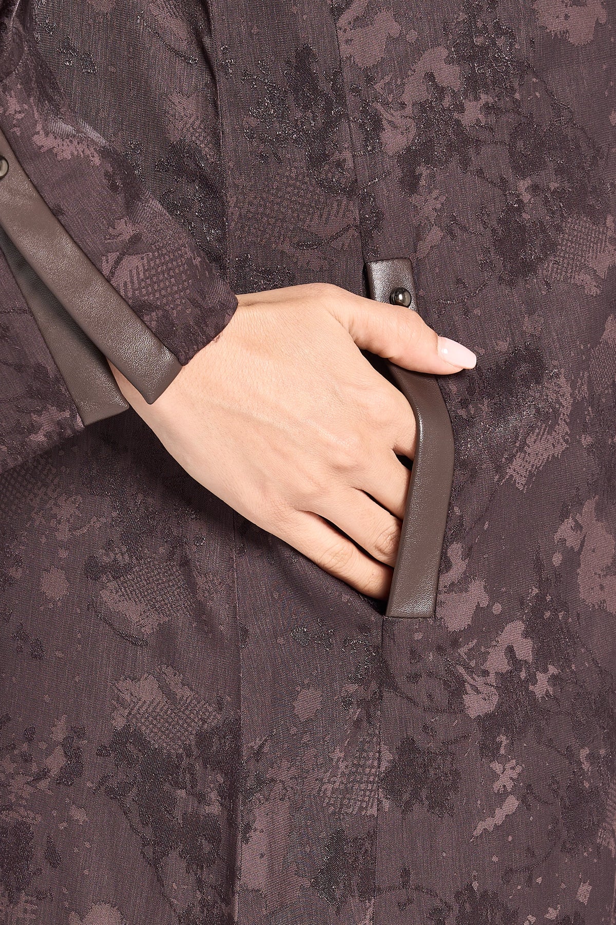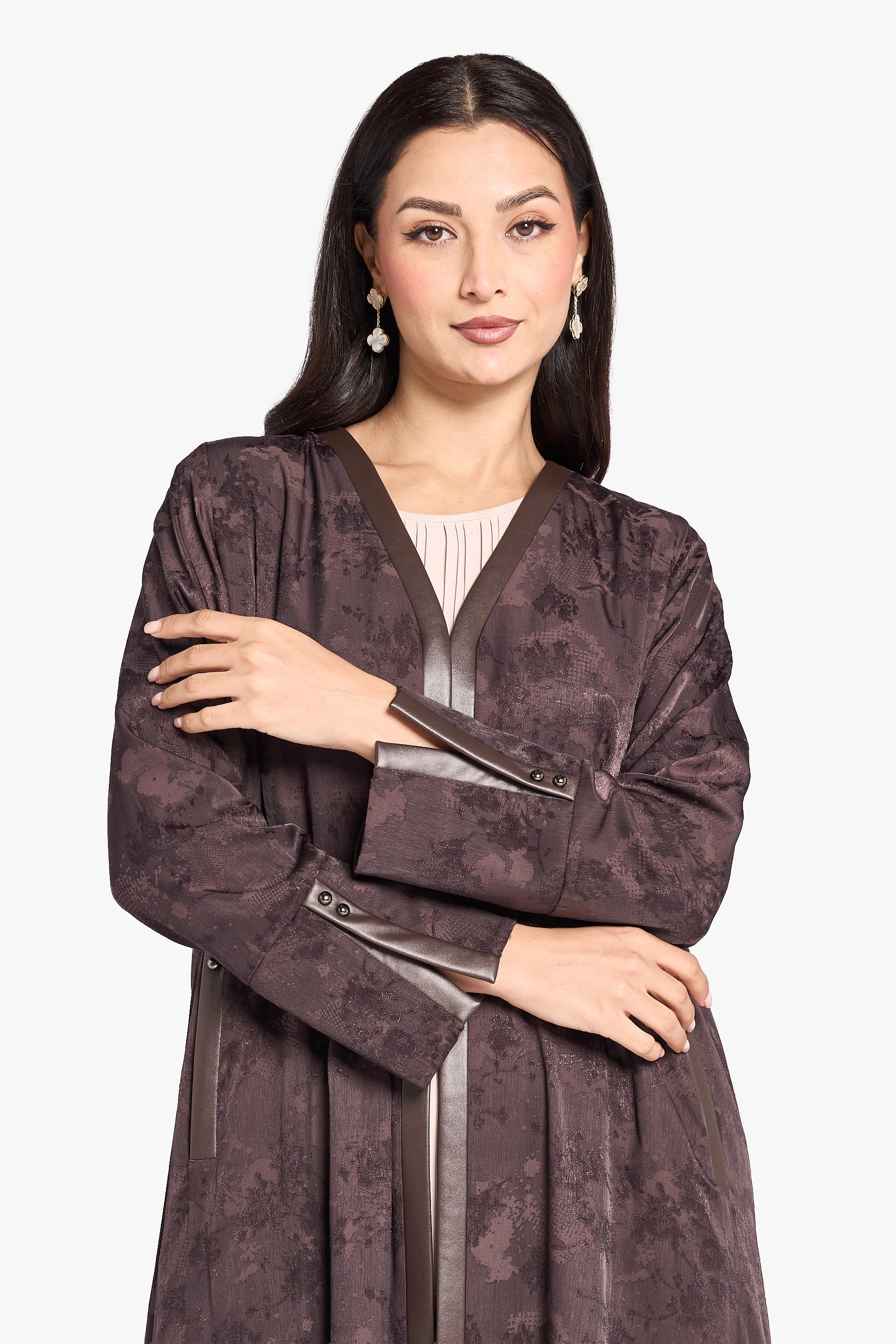 Louzan abaya crafted in soft, flowy jacquard fabric, accentuated with faux leather front and cuff placket detailing, refined with trim detailing. A perfect balance of contemporary edge and timeless elegance.