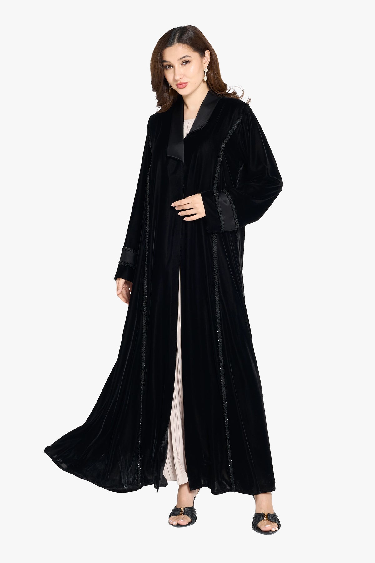 Experience refined elegance with the Louzan Abaya, expertly crafted from luxurious velvet and satin fabrics. Featuring an asymmetrical shawl collar and intricate cuff band detailing, this abaya is adorned with embellished geometric handwork that adds a sophisticated touch. Designed for those who appreciate craftsmanship and distinctive style, it offers a graceful silhouette suited for special occasions or elevated daily wear.