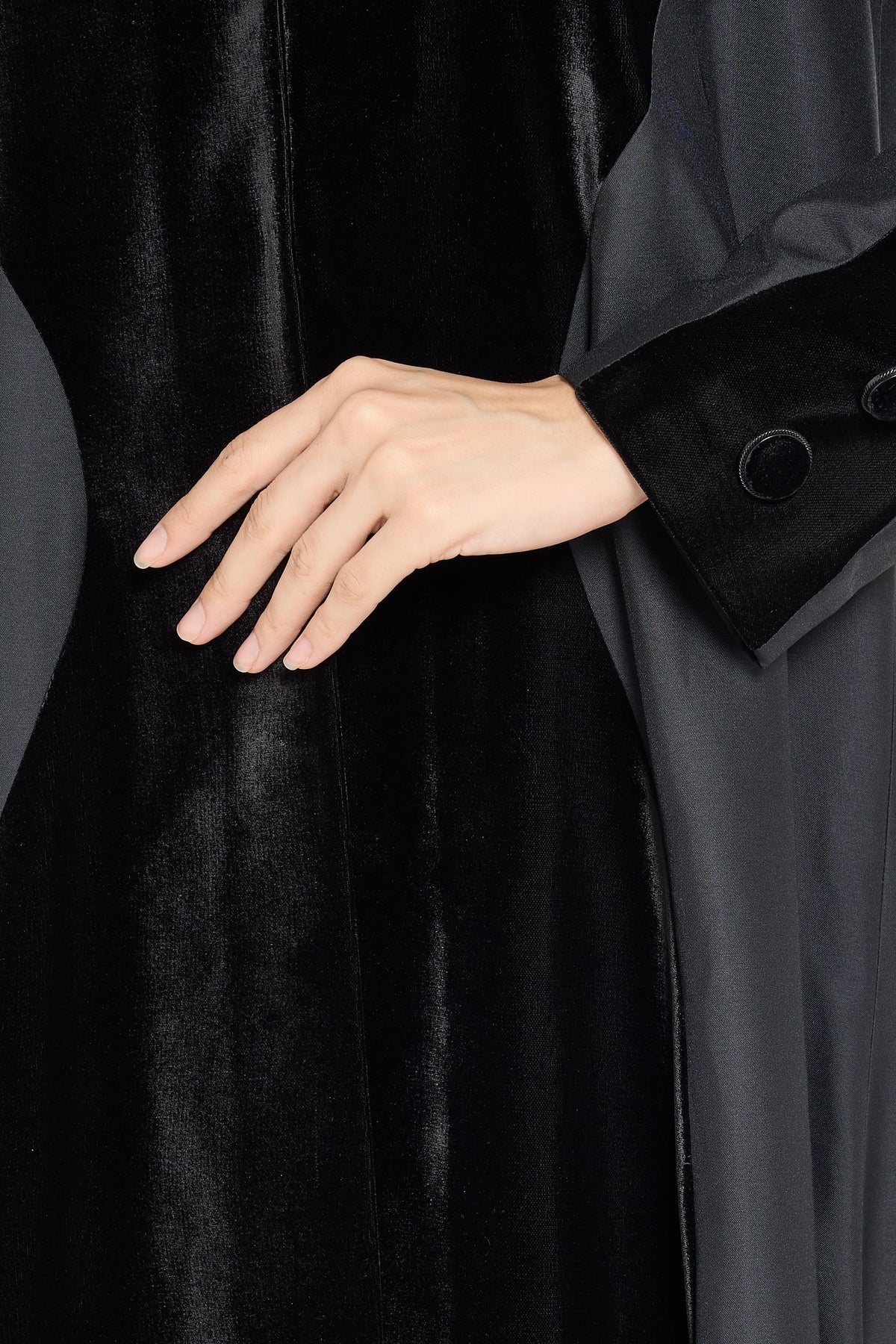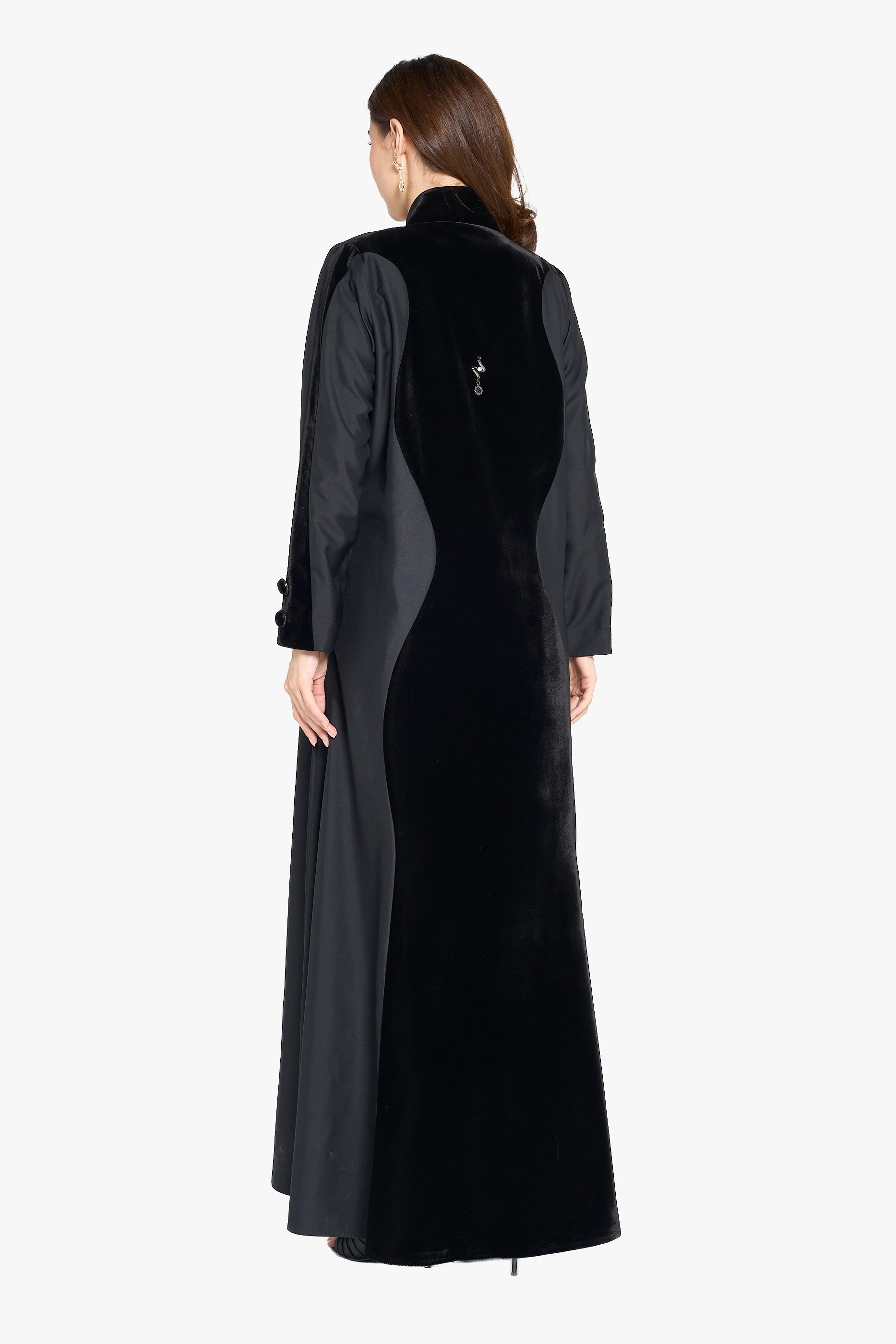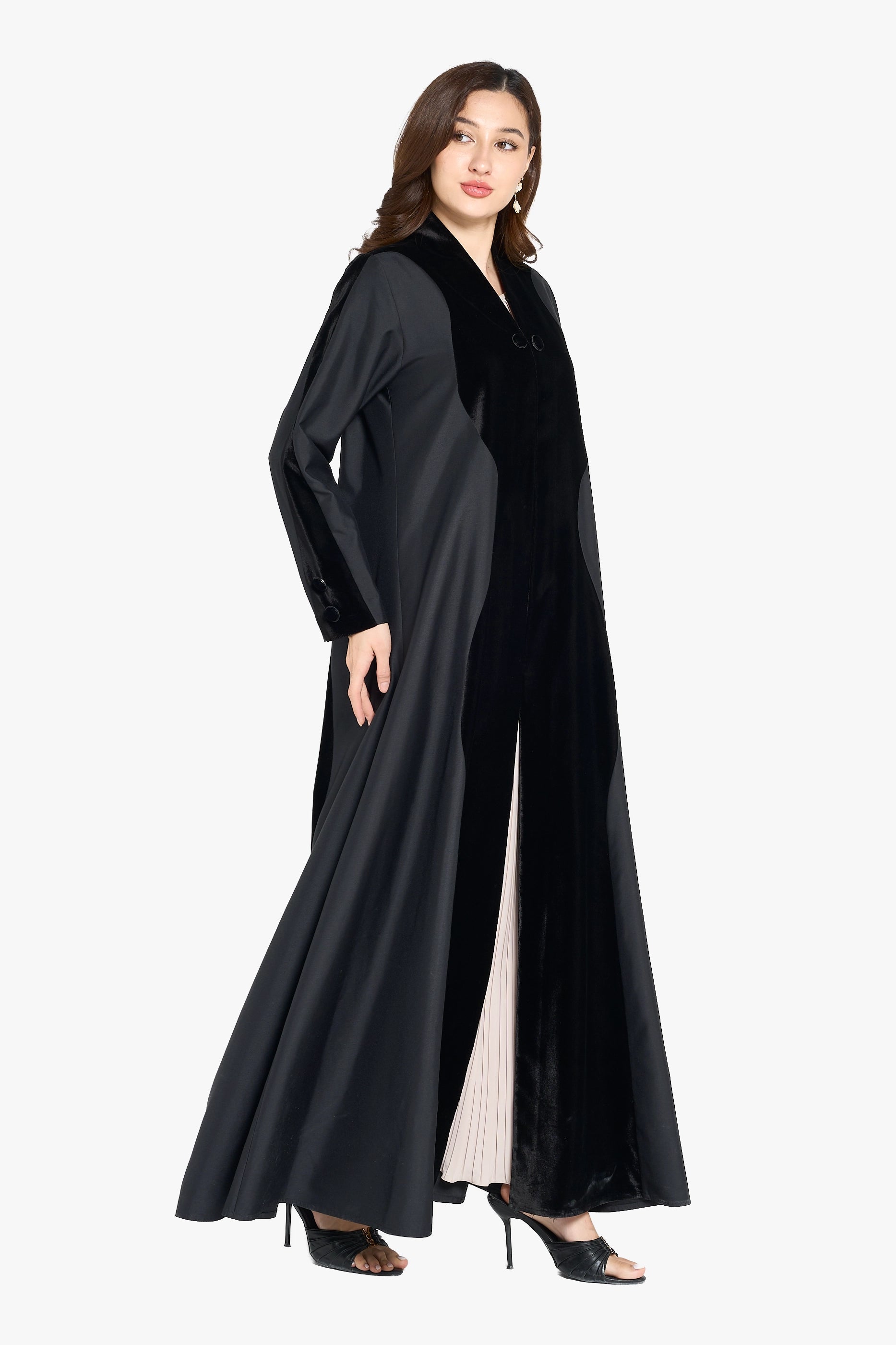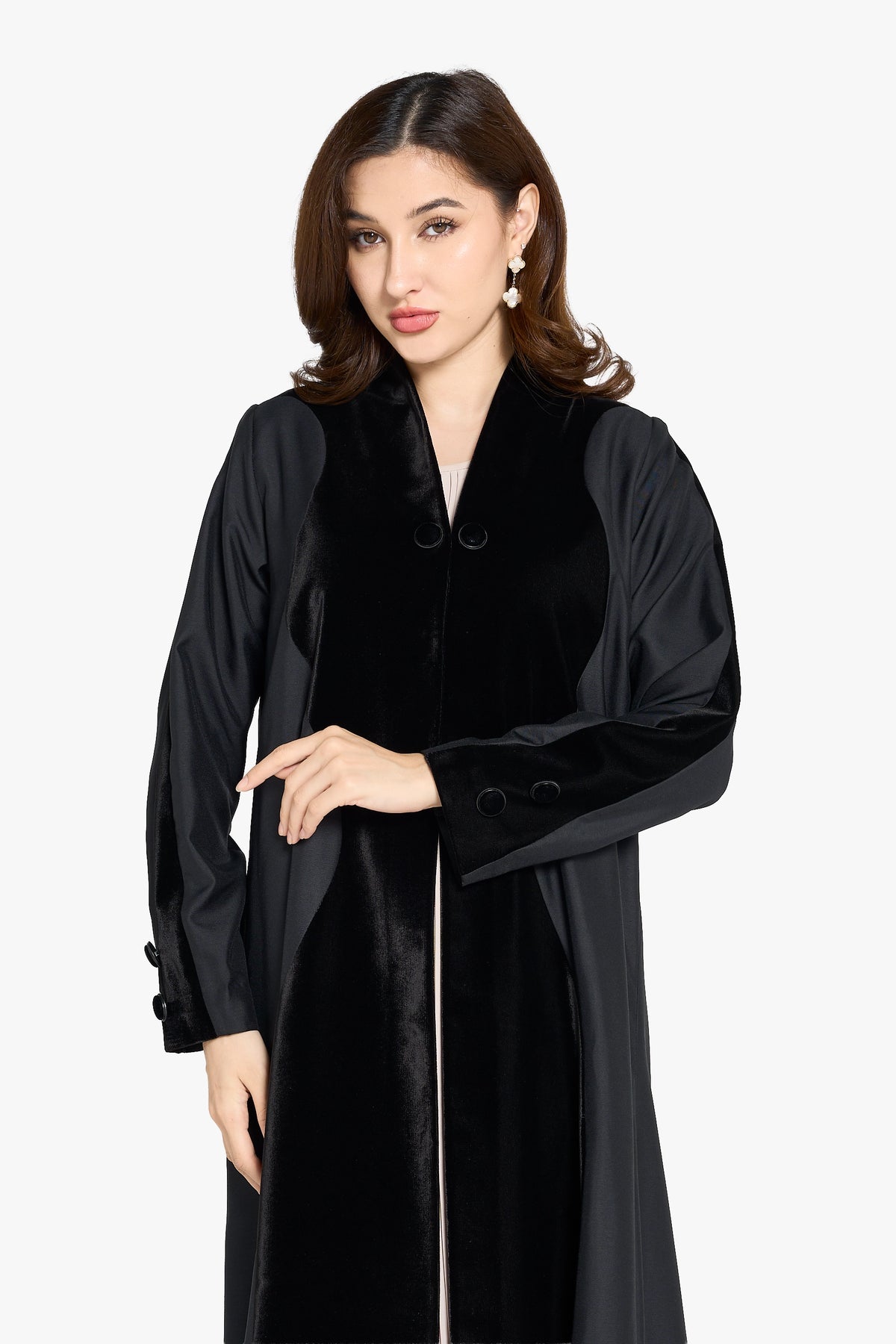 Louzan Abaya showcases exquisite craftsmanship in pure velvet, enriched with delicate soft taffeta paneling for a refined contrast. Accent velvet buttons enhance its sophisticated design, offering both elegance and comfort. Ideal for those seeking a luxurious and timeless addition to their wardrobe.