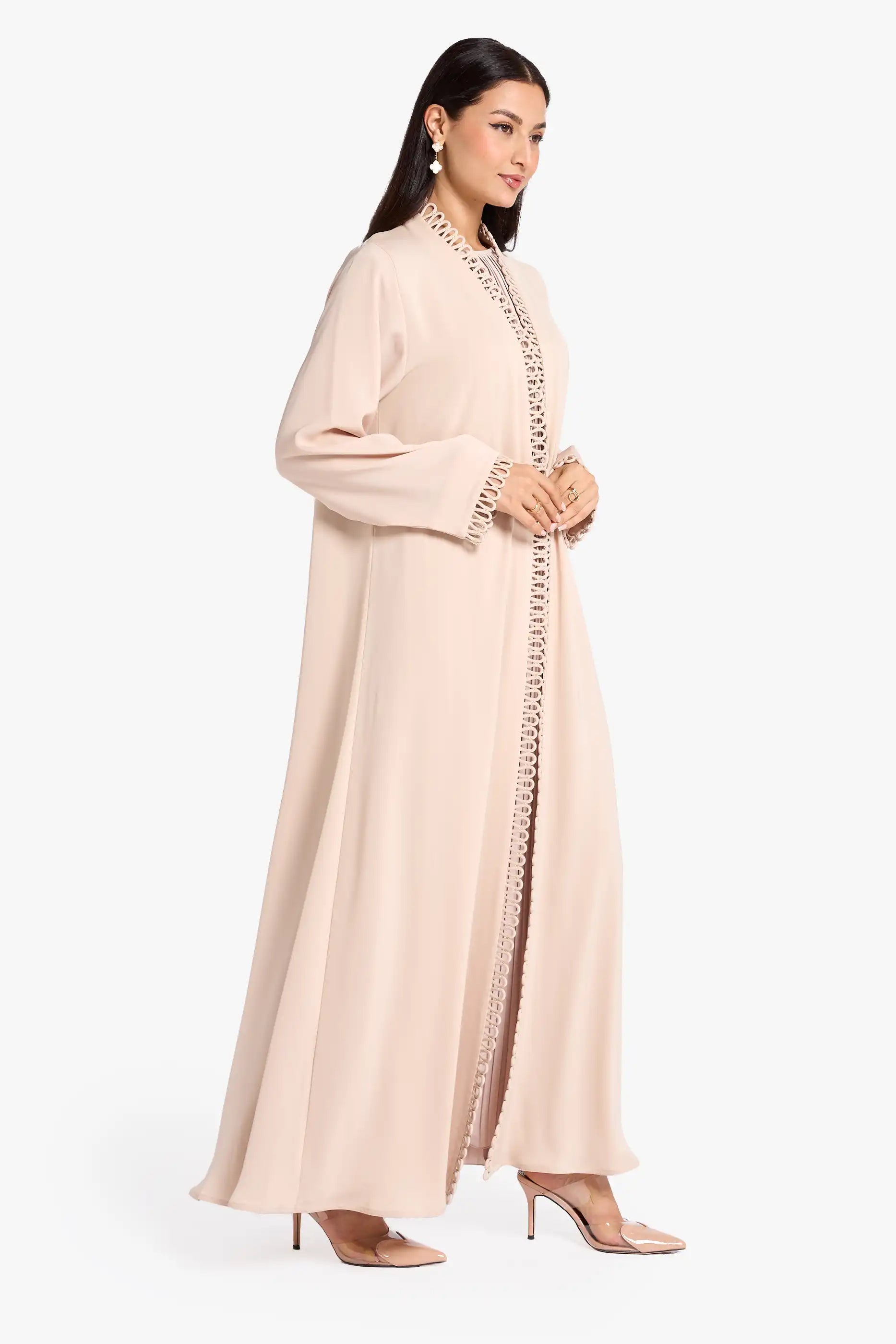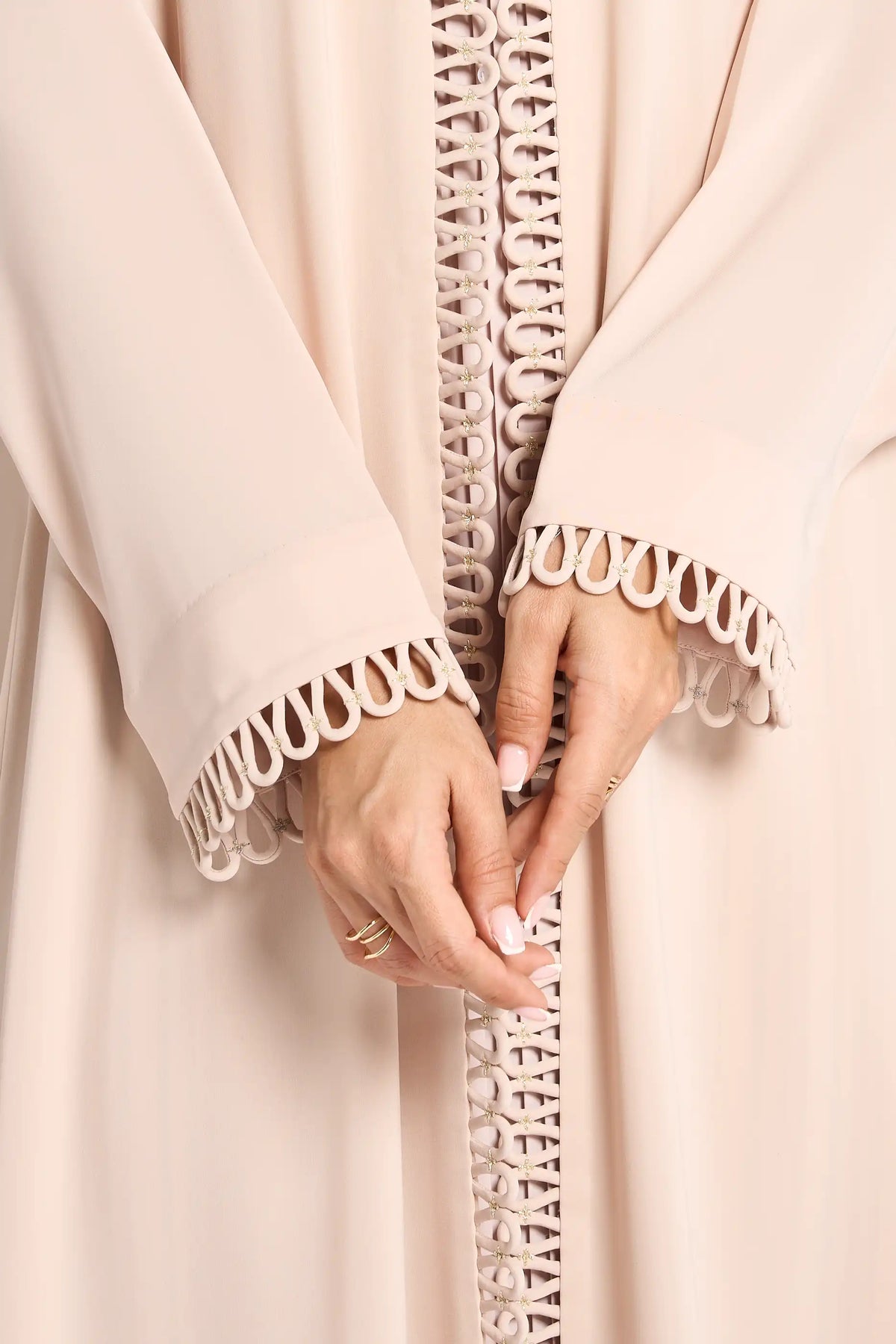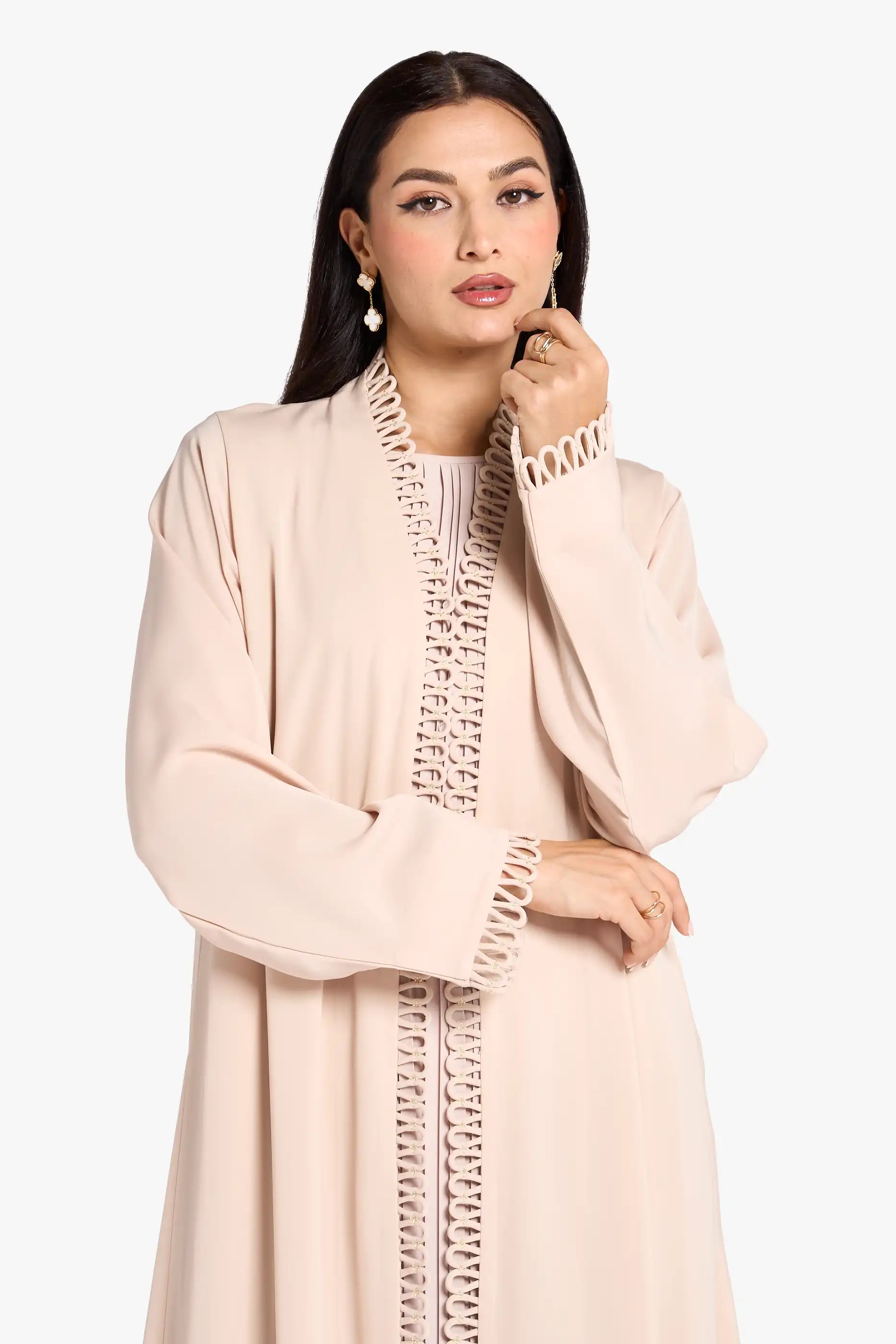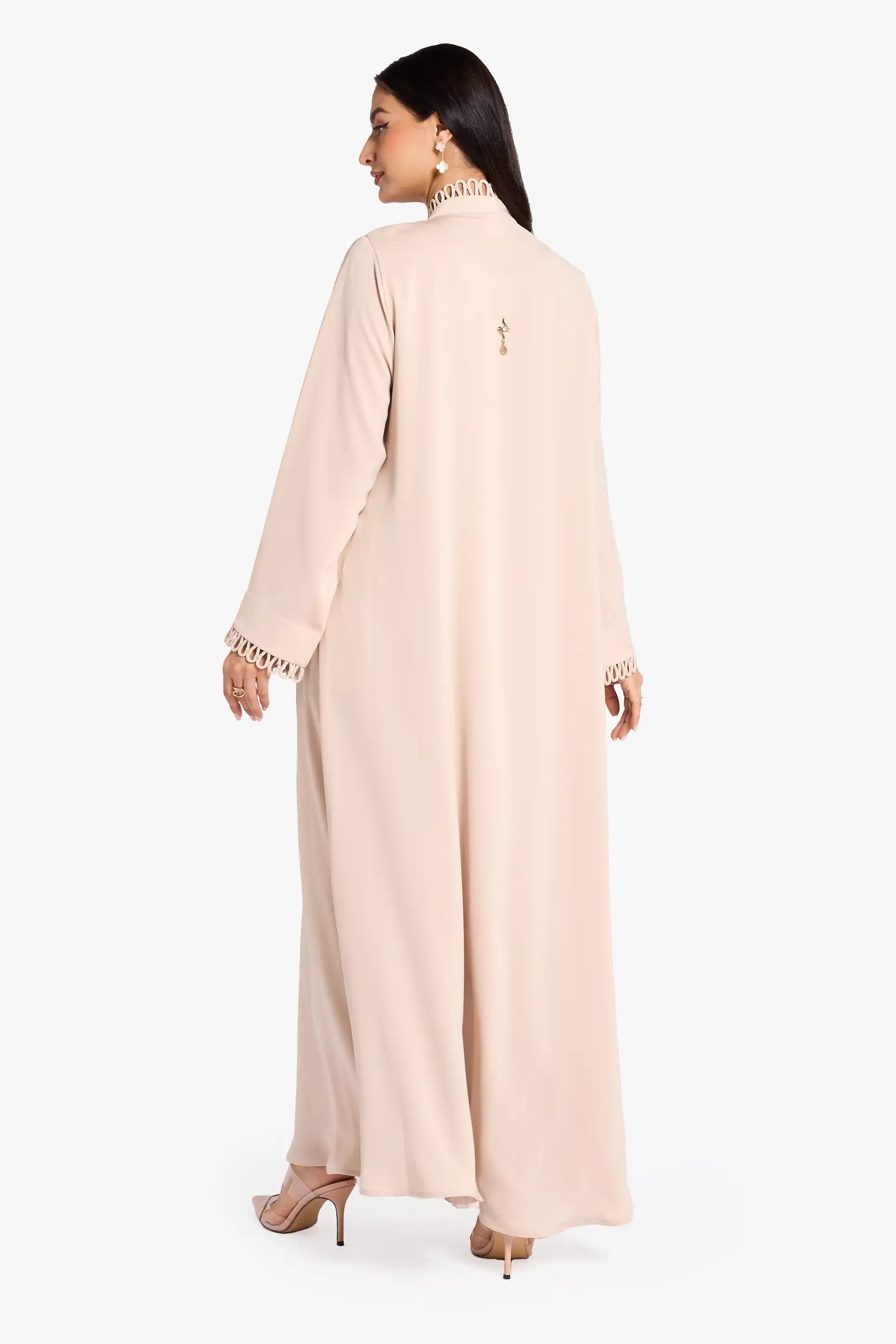 Louzan abaya crafted in nida fabric with self fabric dori loop design, delicate zari embroidery highlights add right touch of shimmer. Understated elegance for daily wear.