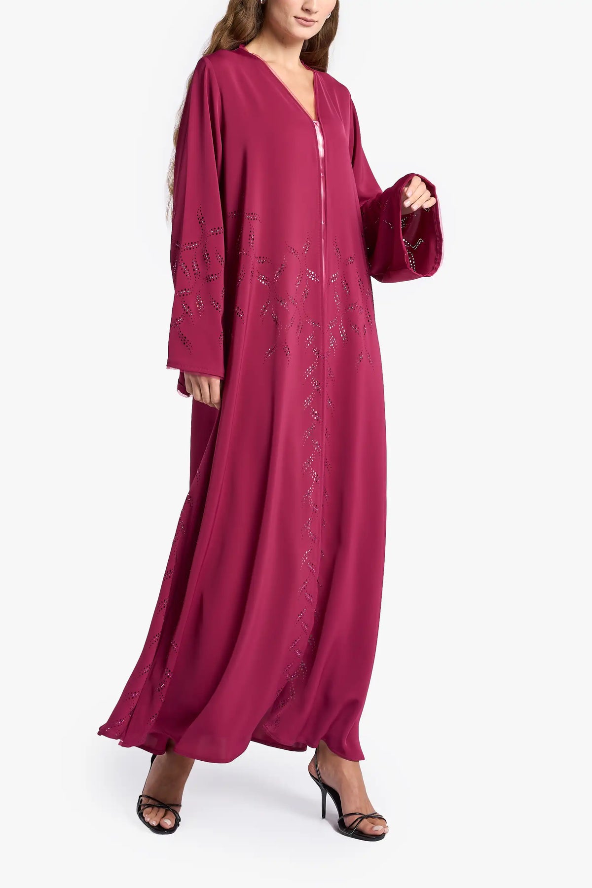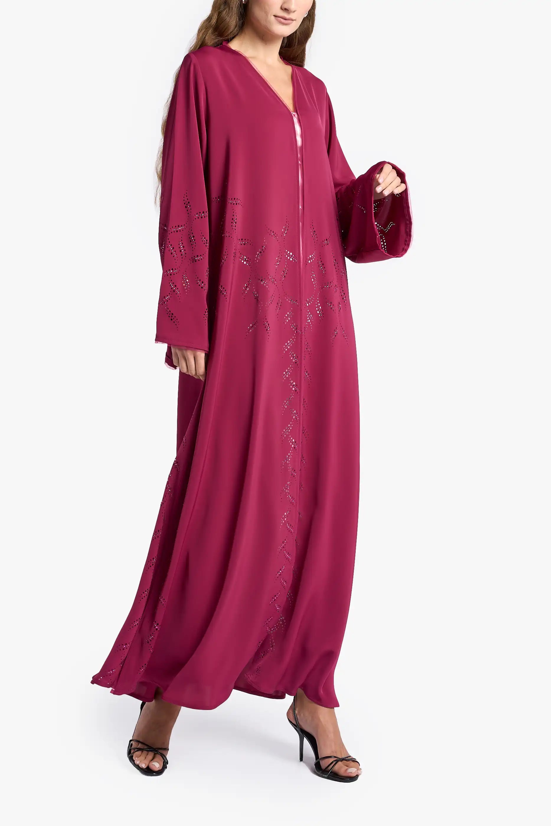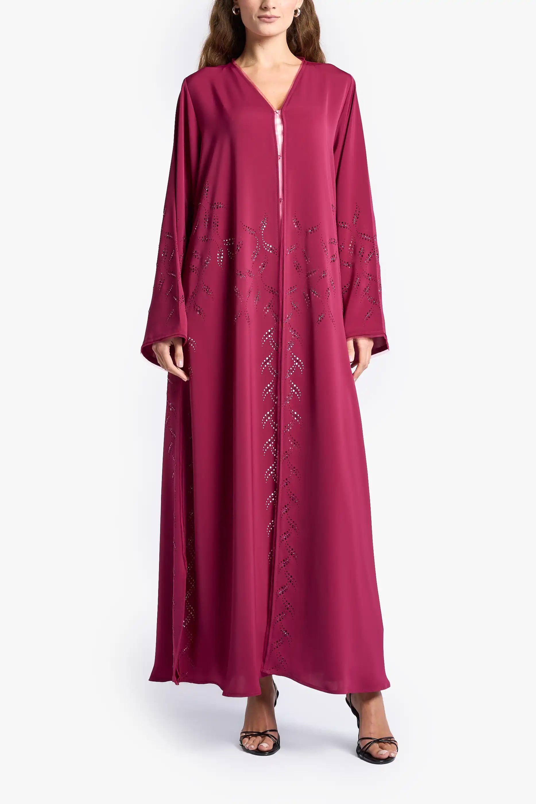 This classic Louzan abaya features a graceful shawl collar and elegant princess panels, enhanced by a shiny dori trim that adds a subtle touch of sophistication. Designed to offer both comfort and style, it’s a perfect choice for those seeking timeless elegance with refined details.