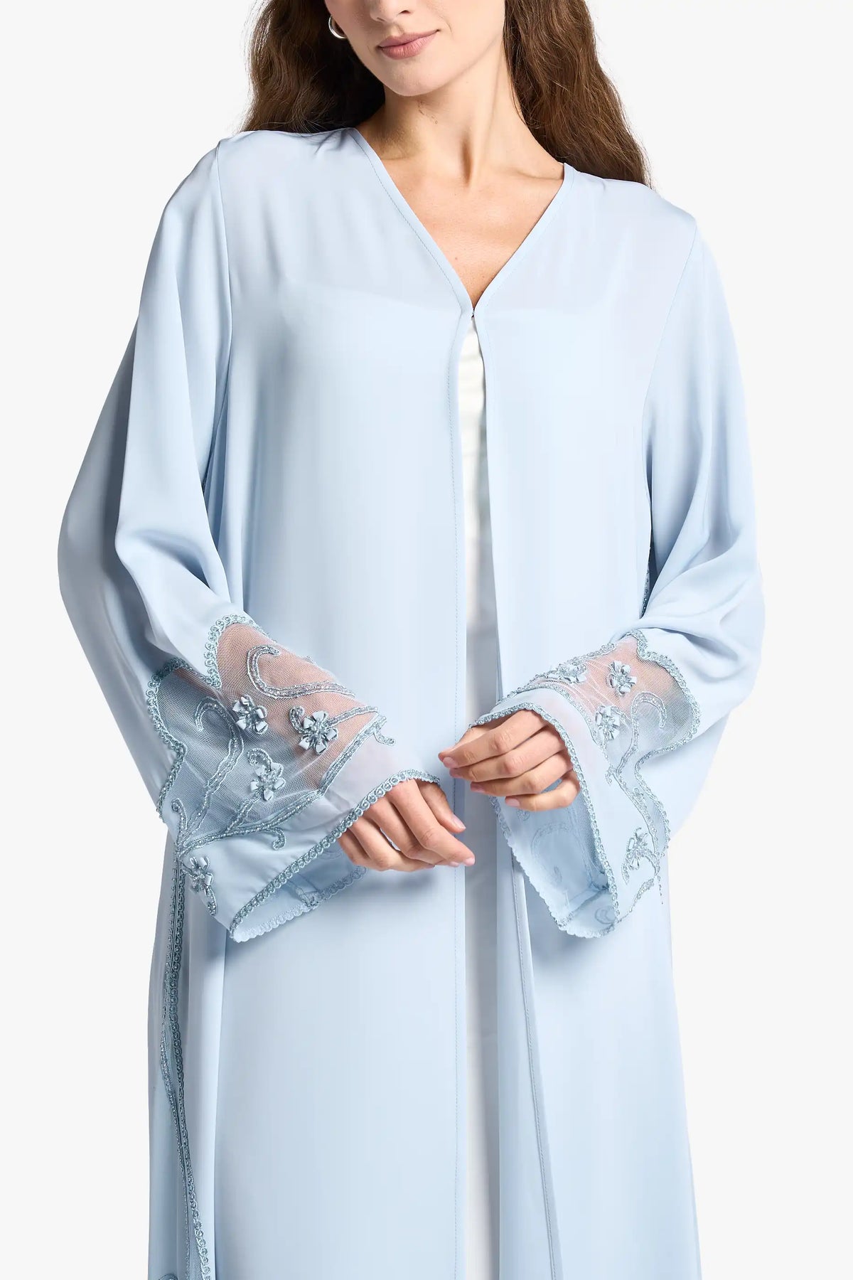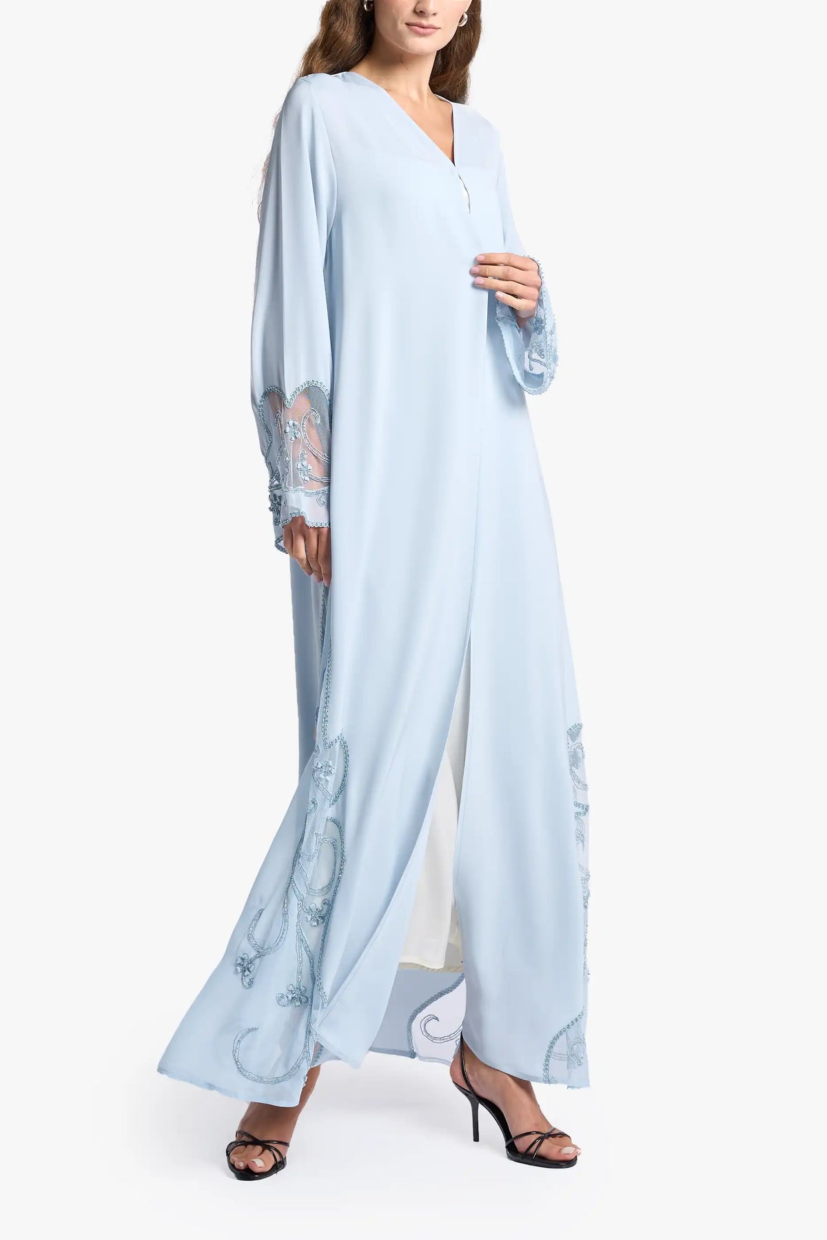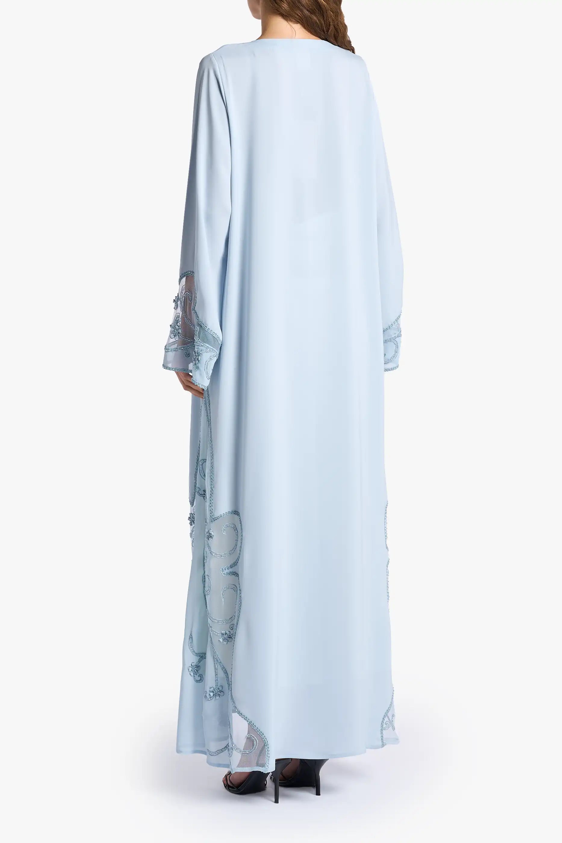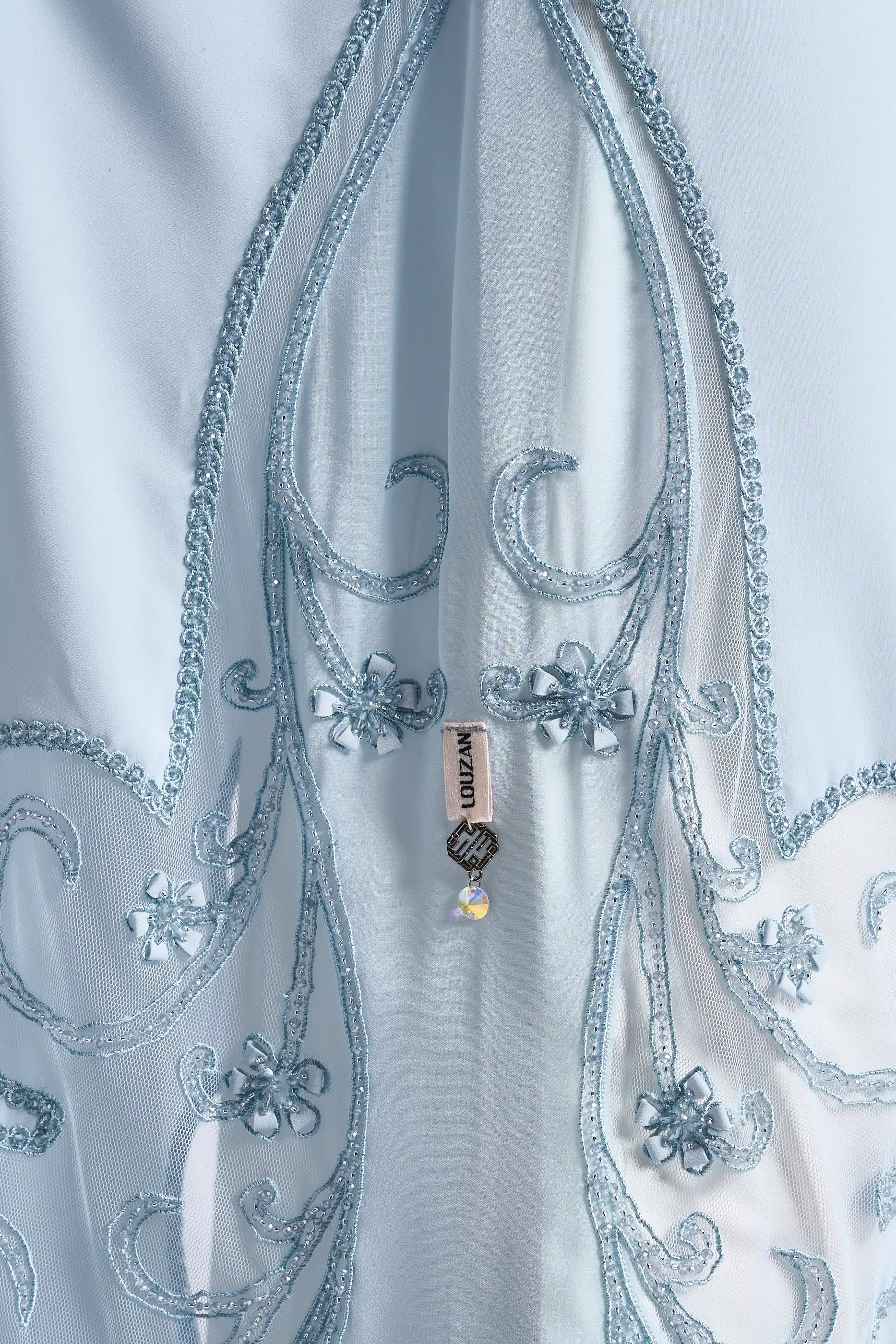 This classic Louzan abaya features a shawl collar and elegant princess panels, enhanced with a shiny dori trim for a refined touch. Designed to offer both comfort and style, it’s a versatile addition to your wardrobe that supports your graceful presence throughout the day.
