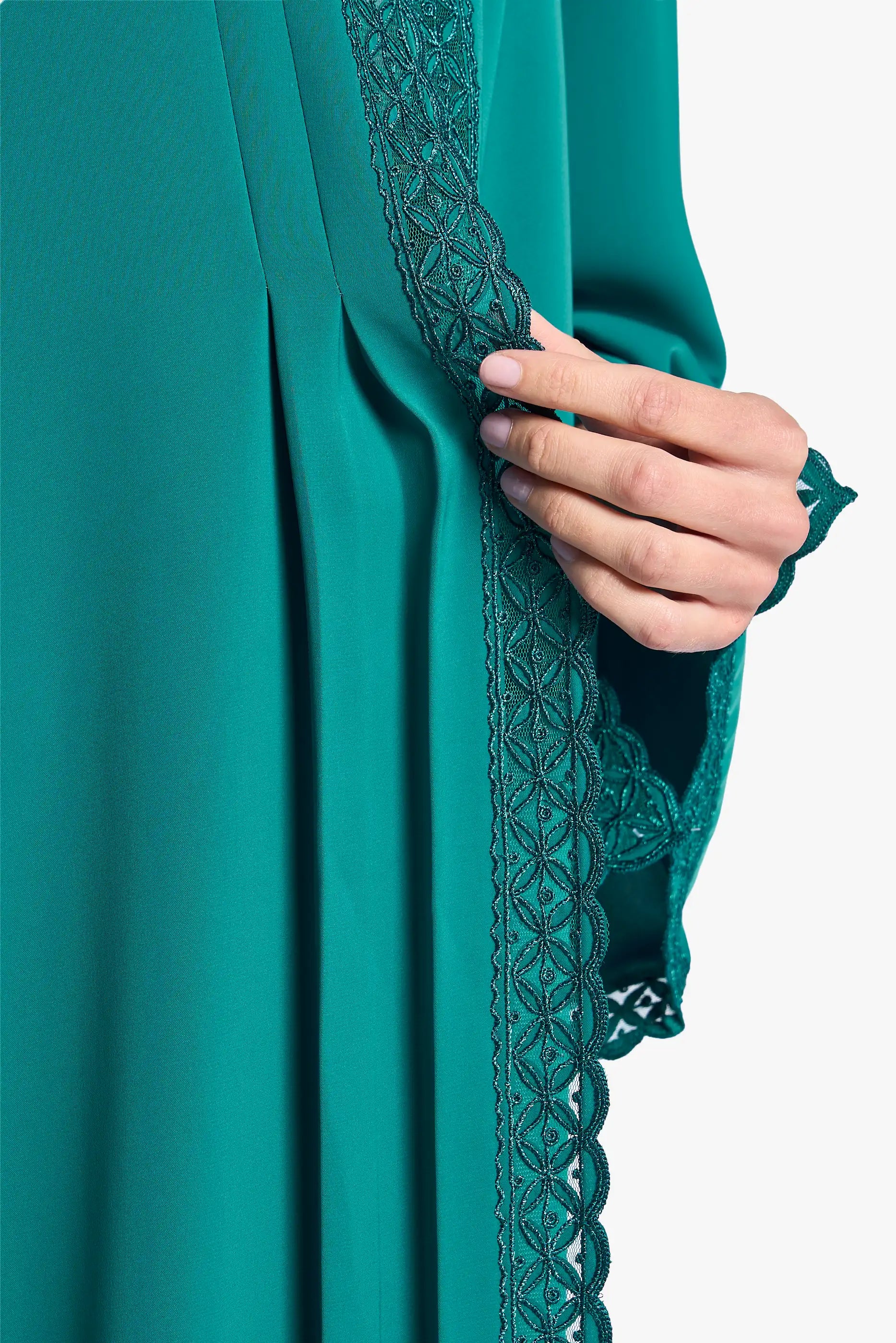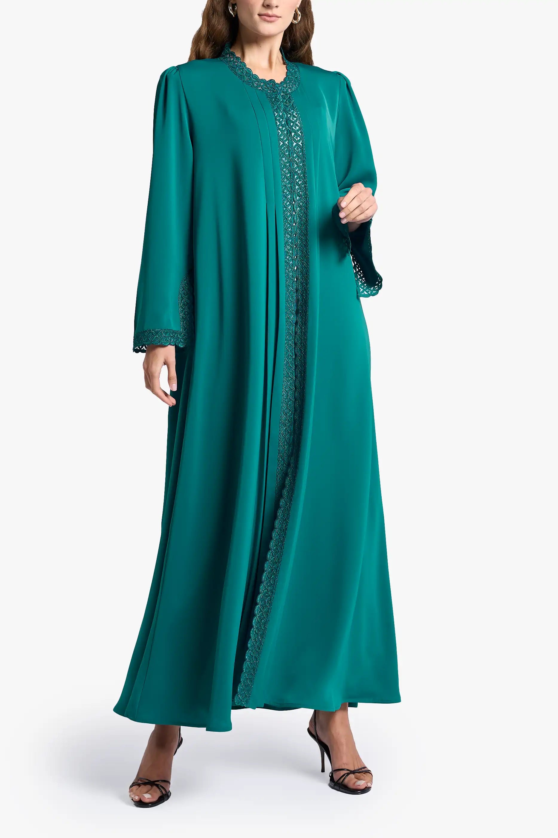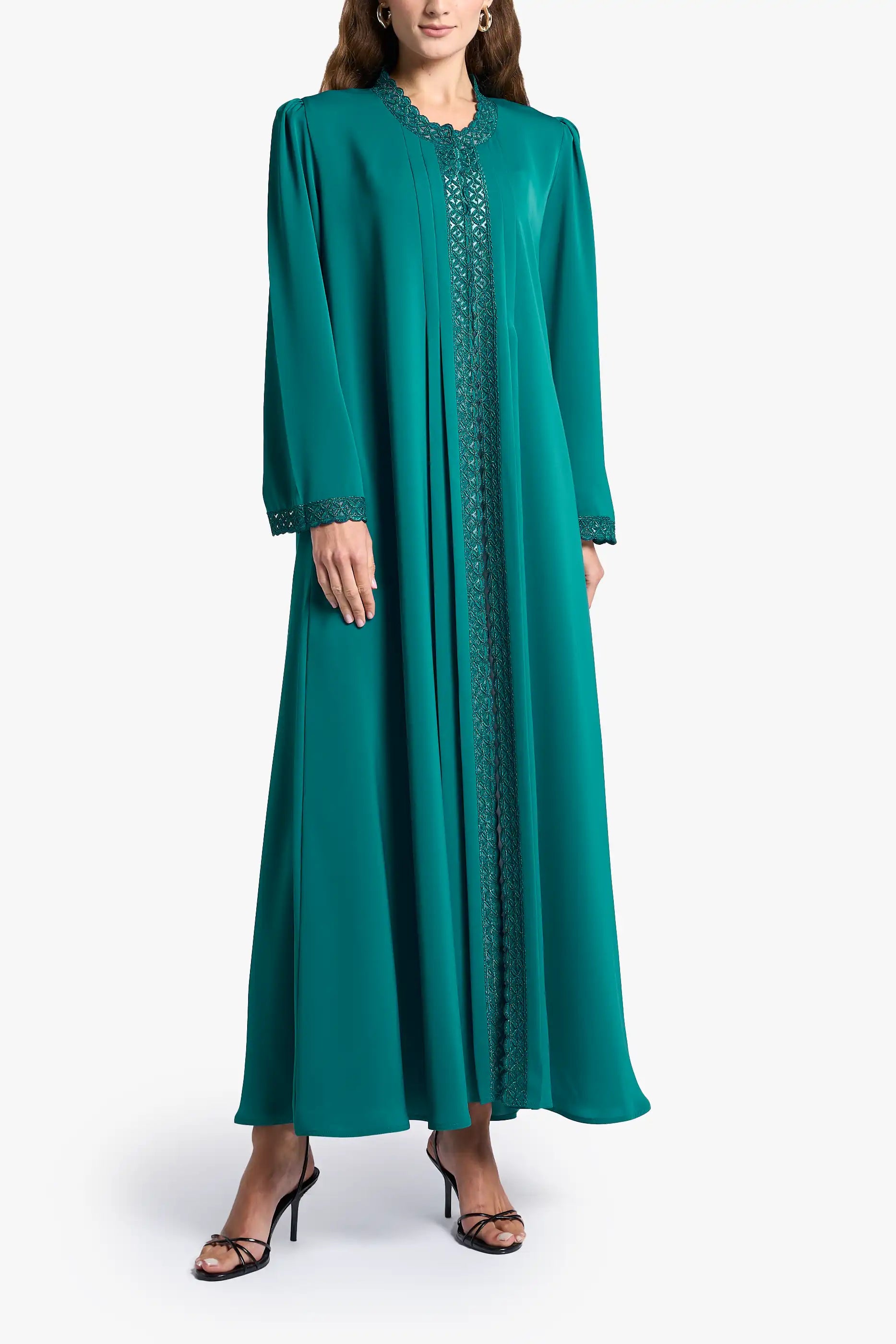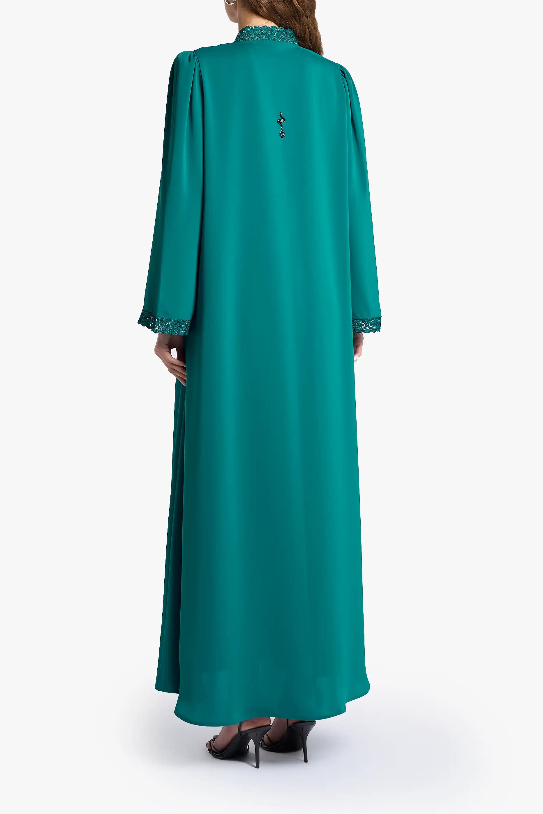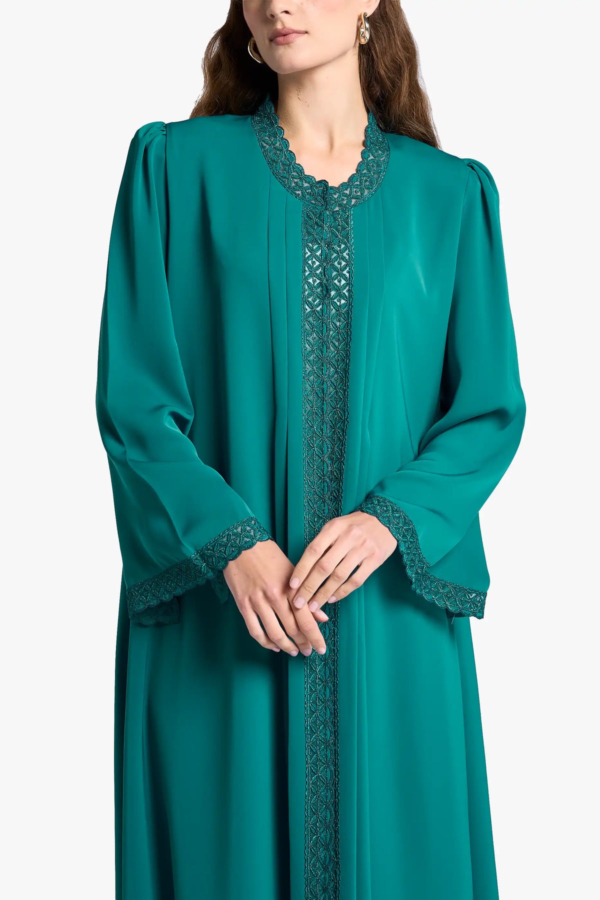 This classic Louzan abaya features a graceful shawl collar and elegant princess panels, enhanced by a shiny dori trim that adds a subtle touch of sophistication. Designed to offer both comfort and style, it’s a perfect choice for those seeking timeless elegance with a refined finish.