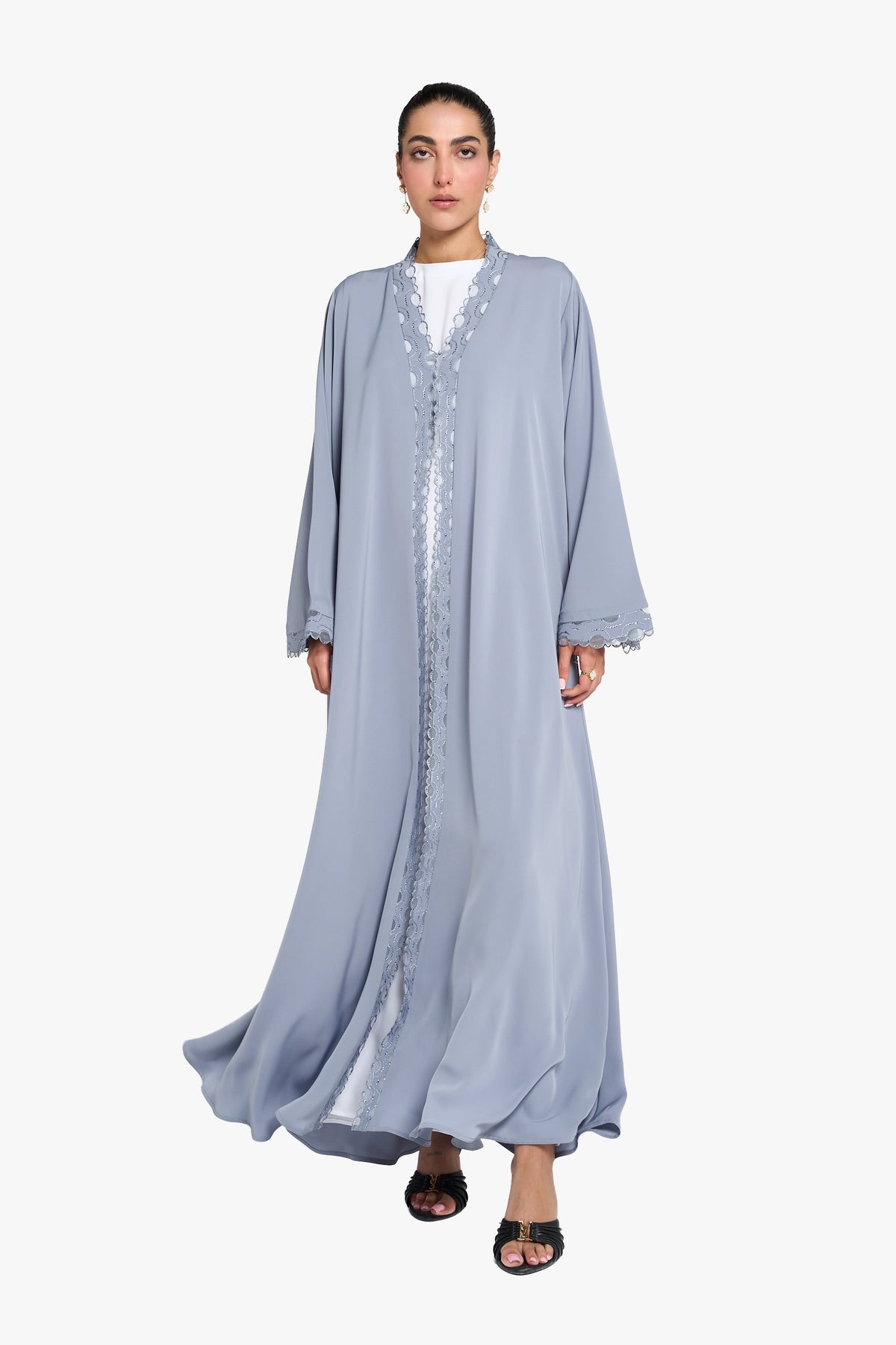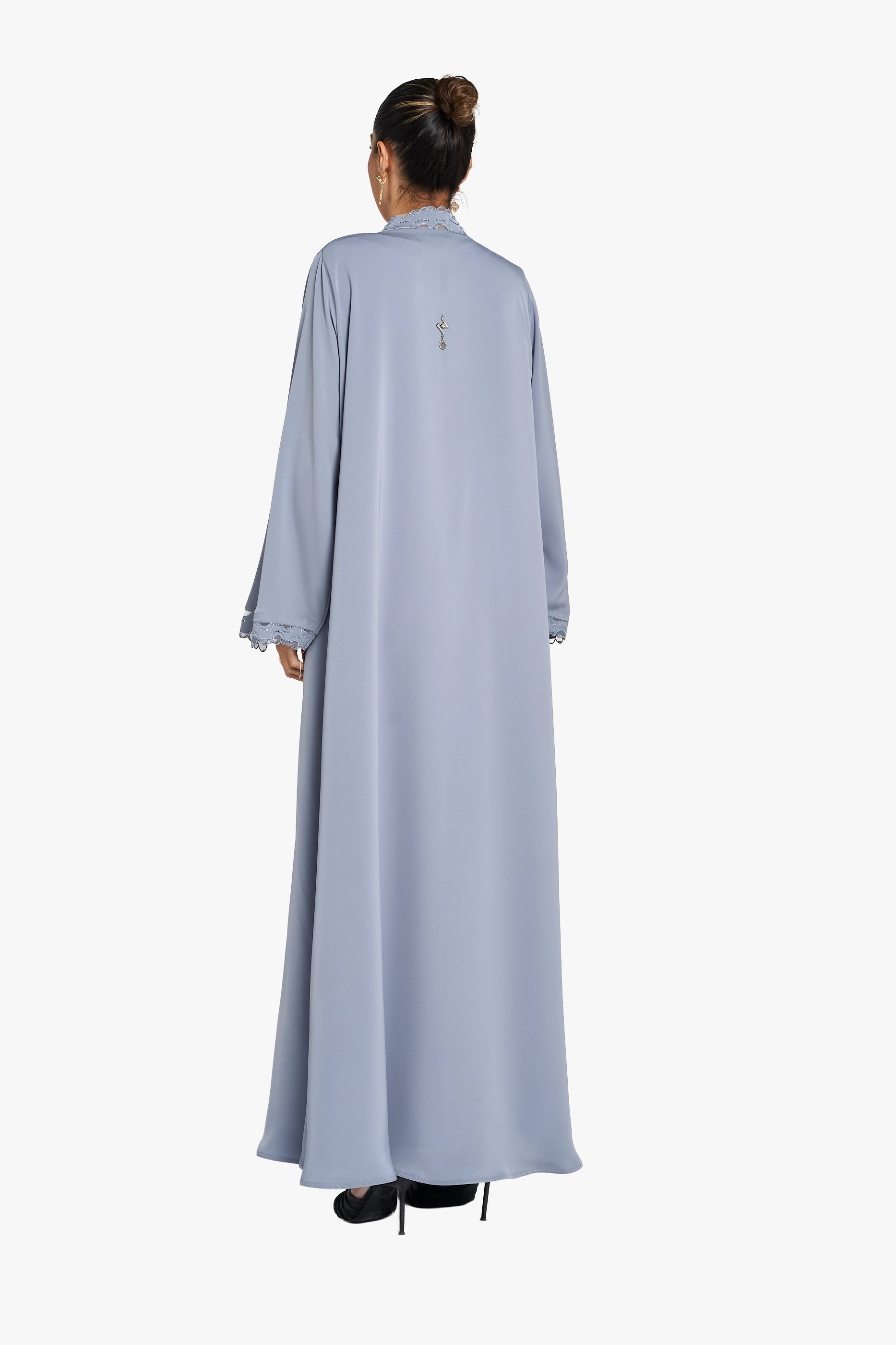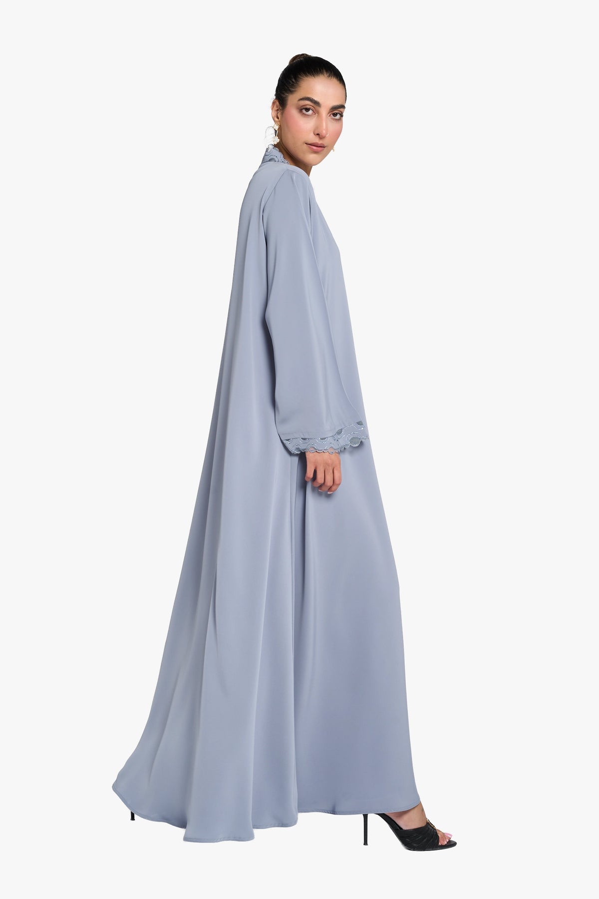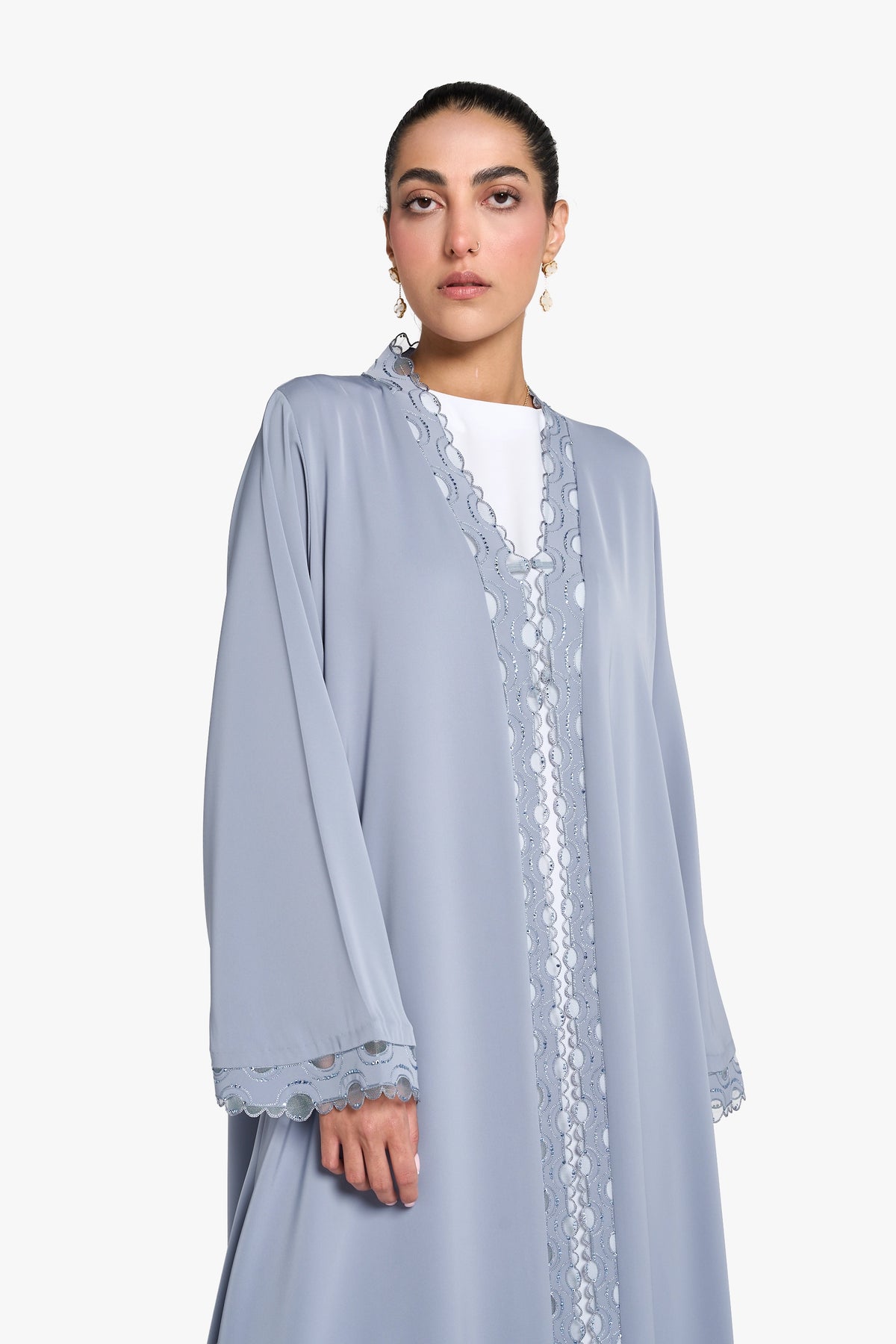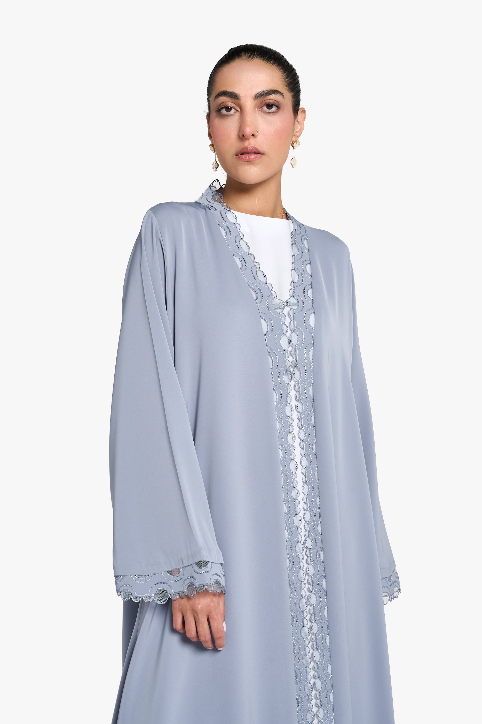 The Louzan Abaya combines the luxurious softness of nida and satin fabrics with sophisticated laser-cut circular patterns, creating a modern yet elegant silhouette. Accented with carefully placed crystal embellishments, this abaya offers subtle sparkle while maintaining a refined, expert-crafted finish perfect for distinguished occasions.