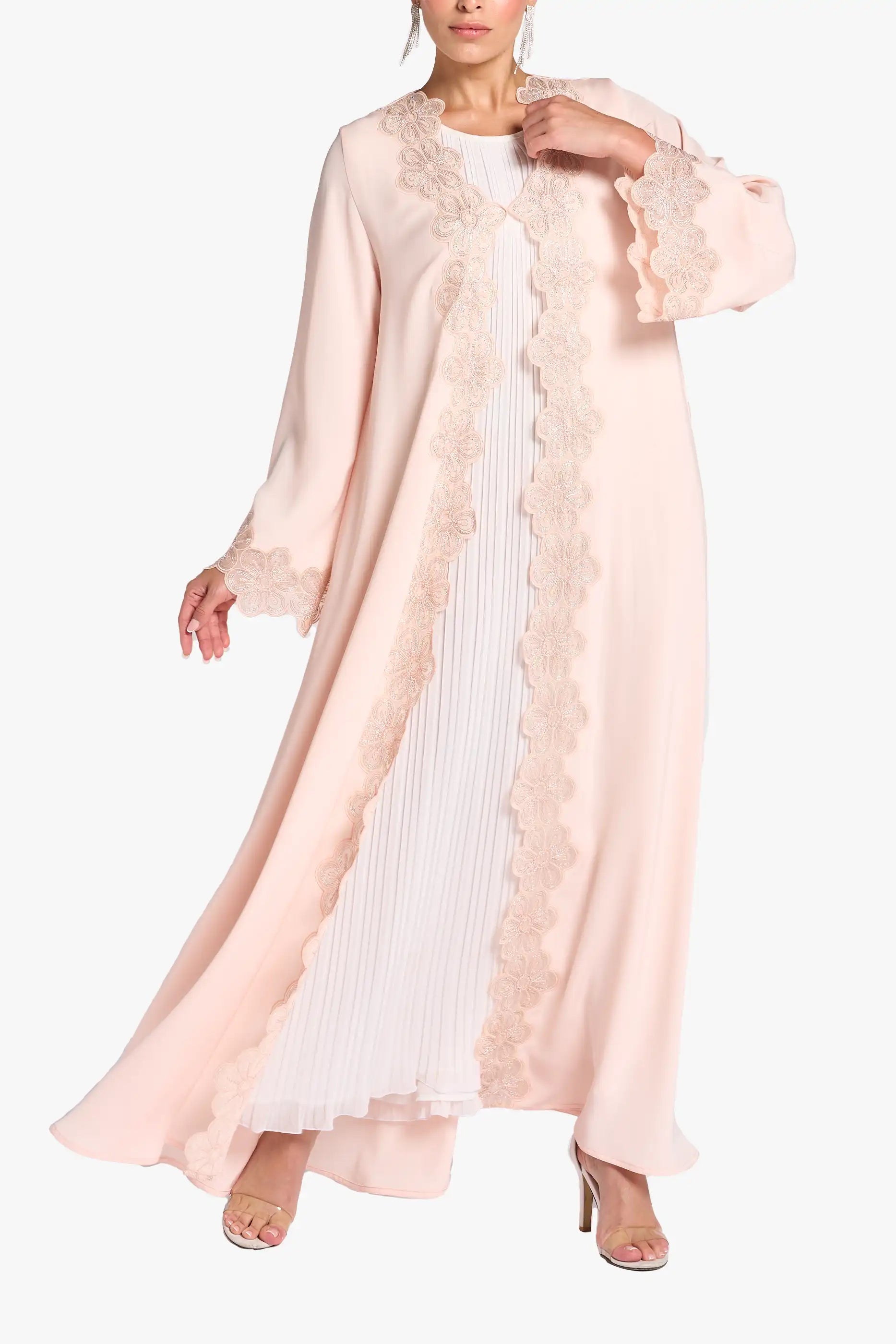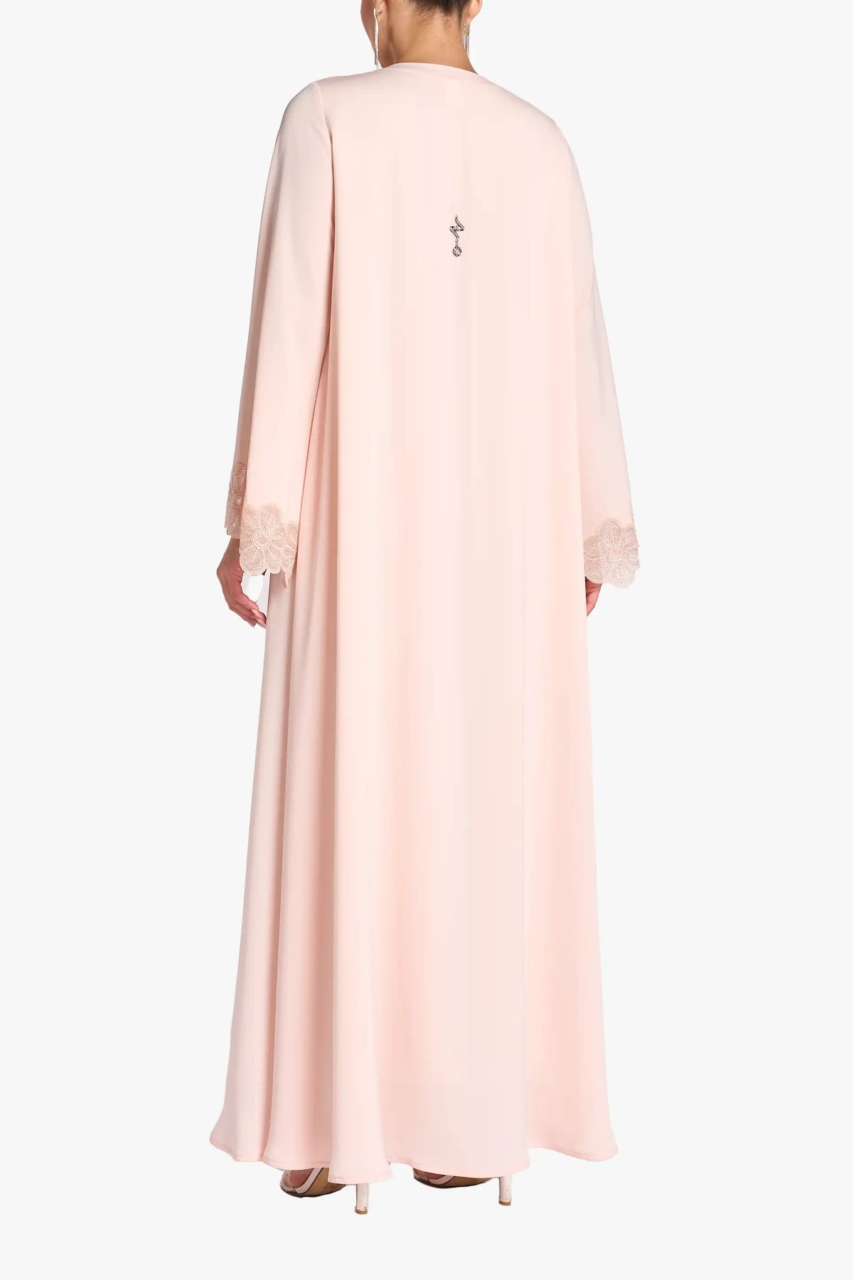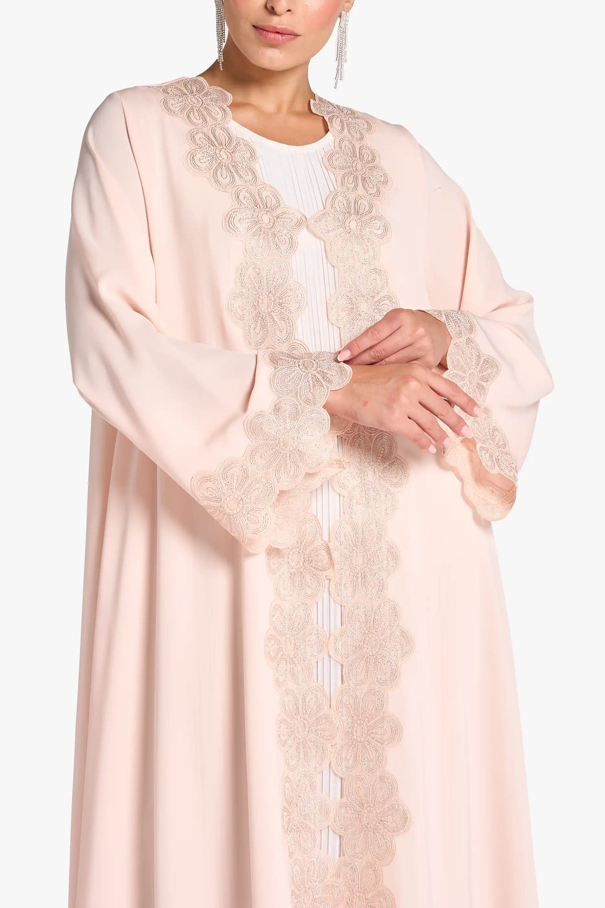 Louzan abaya carfted in nida fabric with floral dori embroidered lace design at front and cuff.