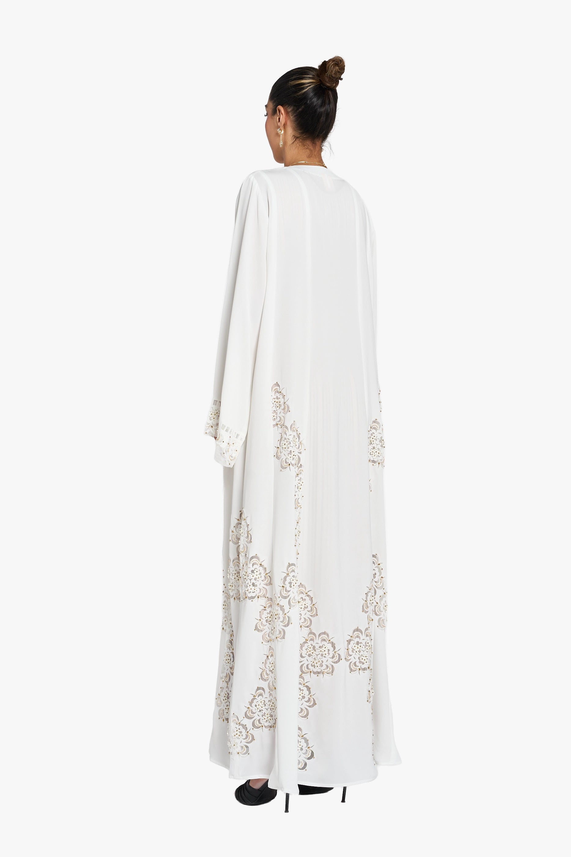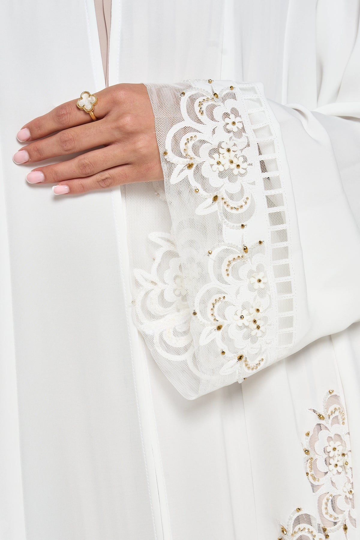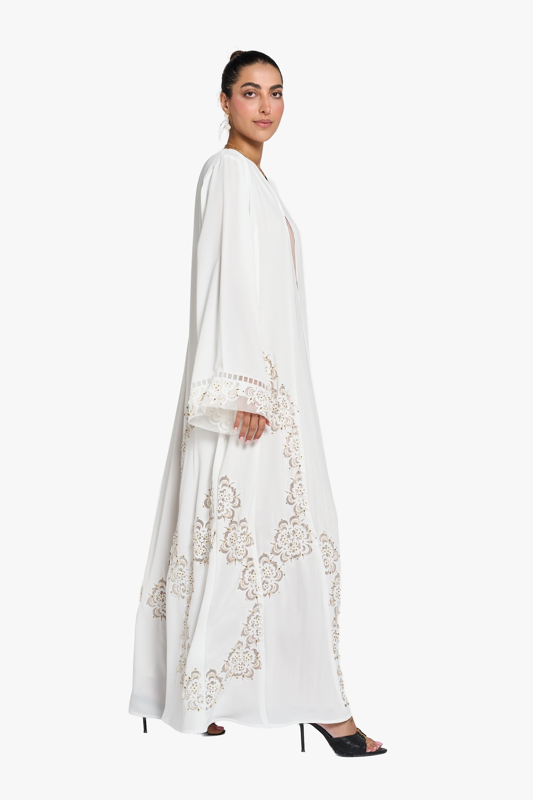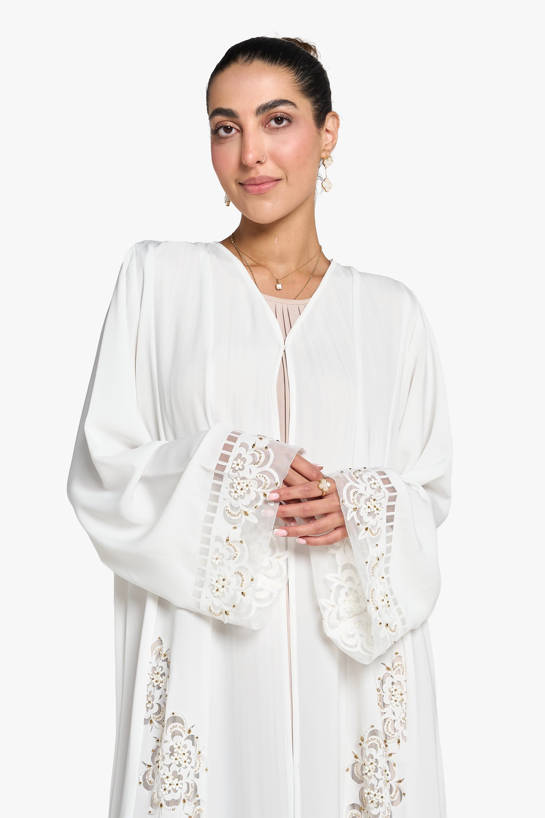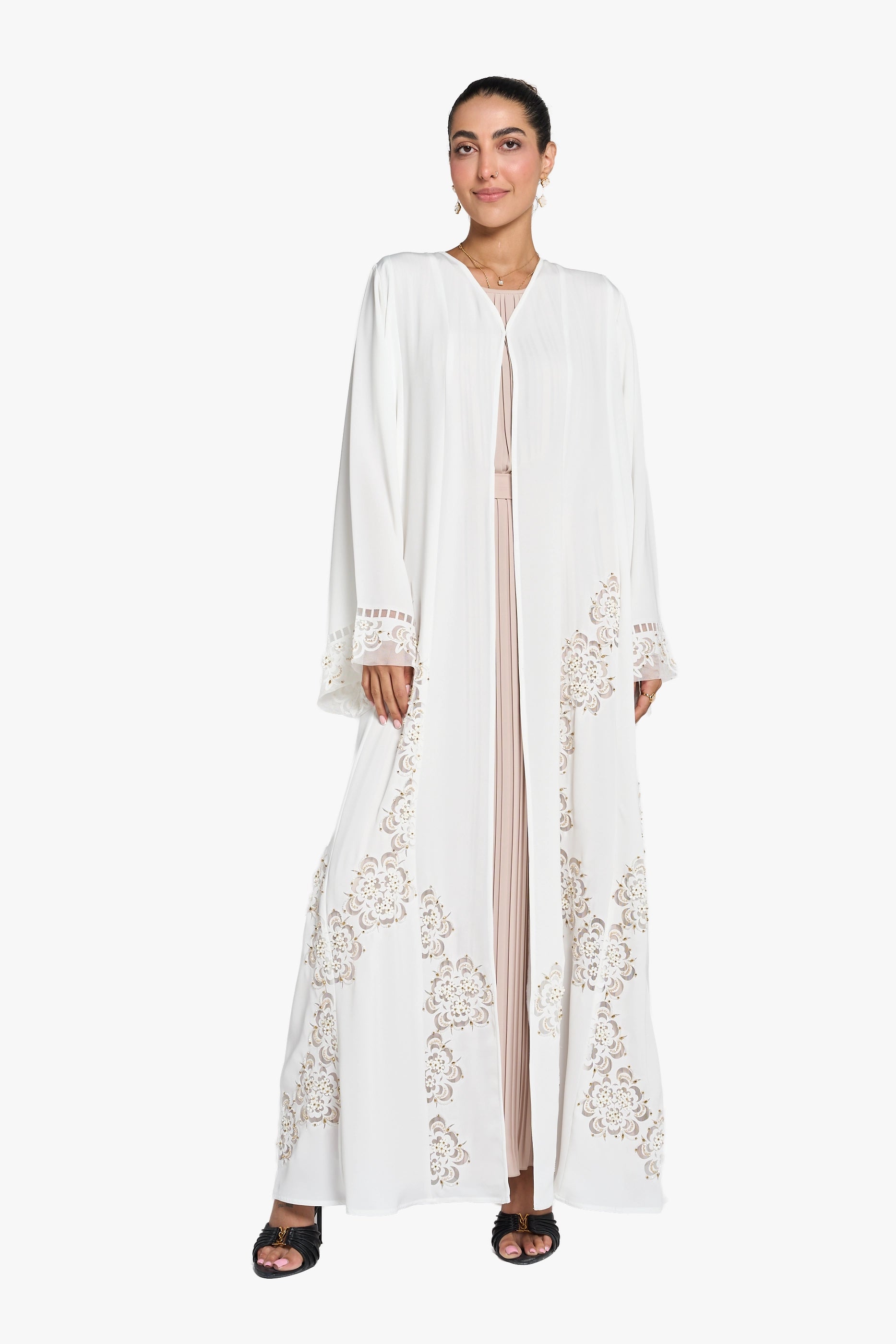 The Louzan VIP Abaya LN2324N74 combines luxurious nida fabric with a sophisticated laser-cut floral design, showcasing expert craftsmanship. Enhanced by refined dori embroidery and delicate beadwork, this abaya offers an elegant silhouette perfect for special occasions. Its exquisite detailing ensures a standout presence while maintaining comfort and grace throughout your event.