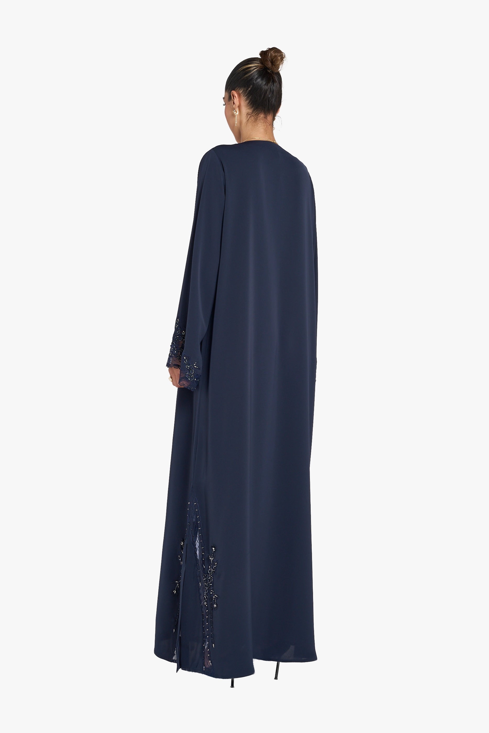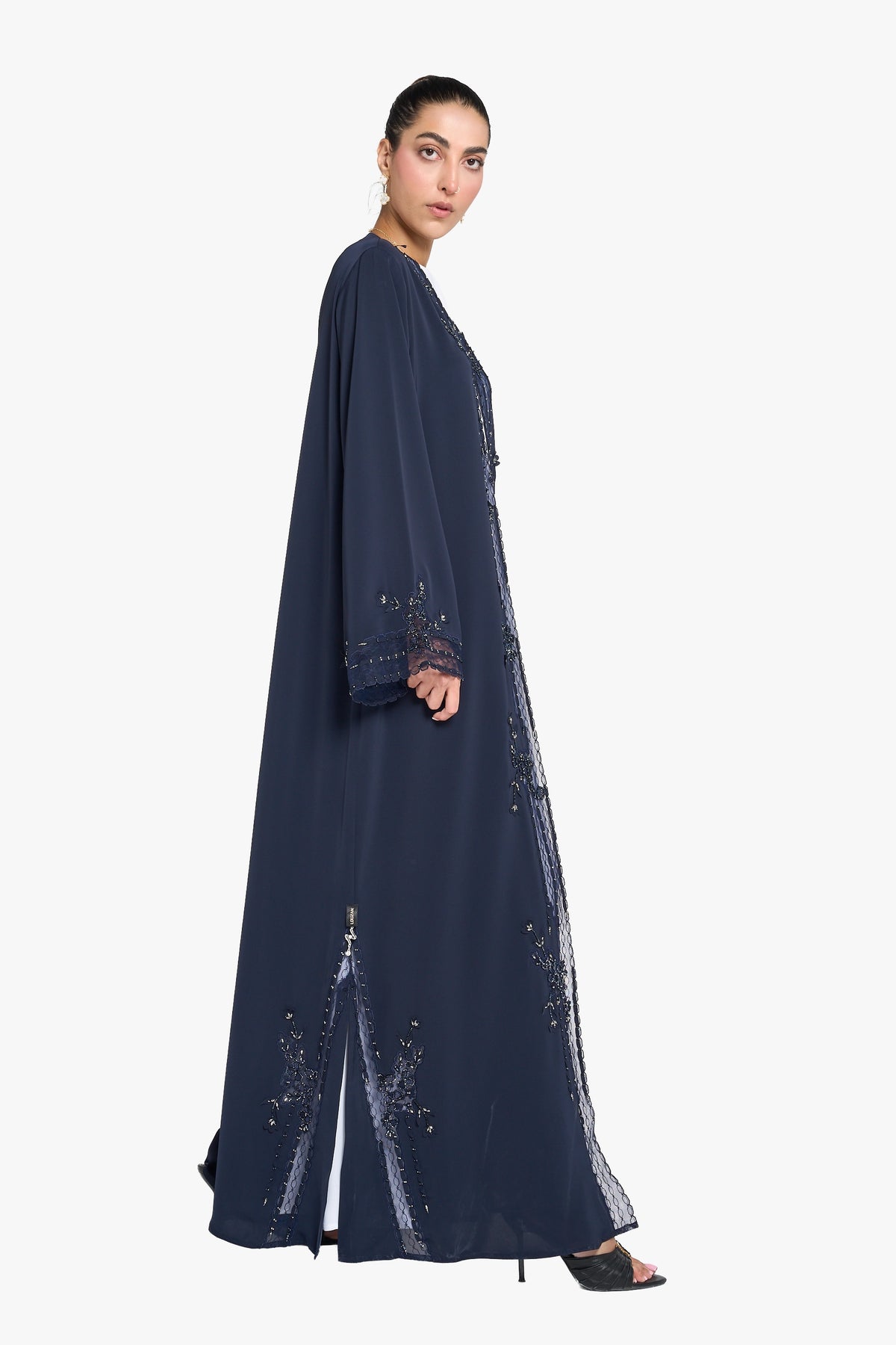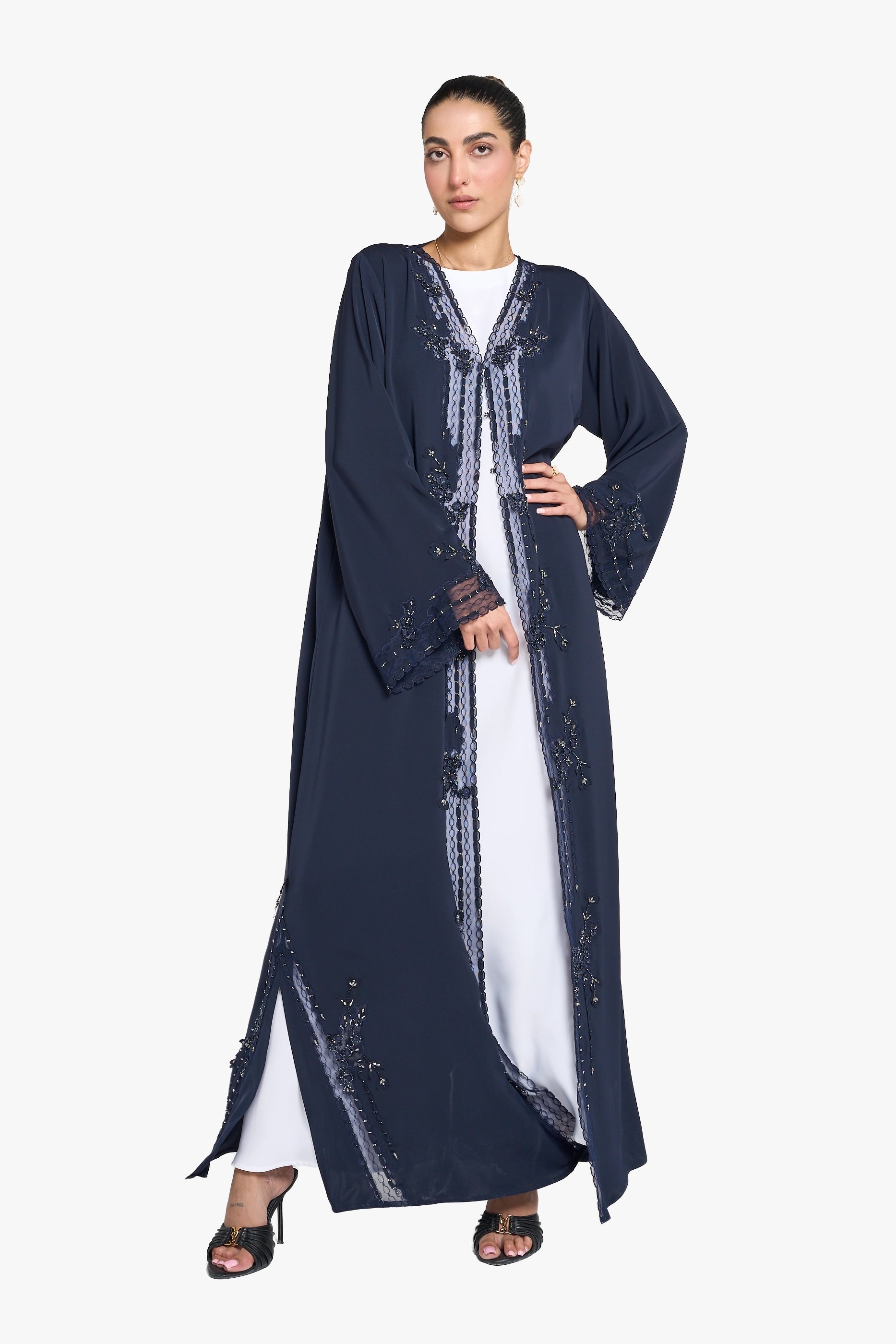 The Louzan VIP abaya, made from premium nida fabric, features intricate geometric dori embroidery complemented by delicate organza ribbons and sparkling crystal beads. This design achieves a harmonious balance of modesty and elegance while introducing a modern edge, ideal for those seeking refined sophistication with contemporary style.