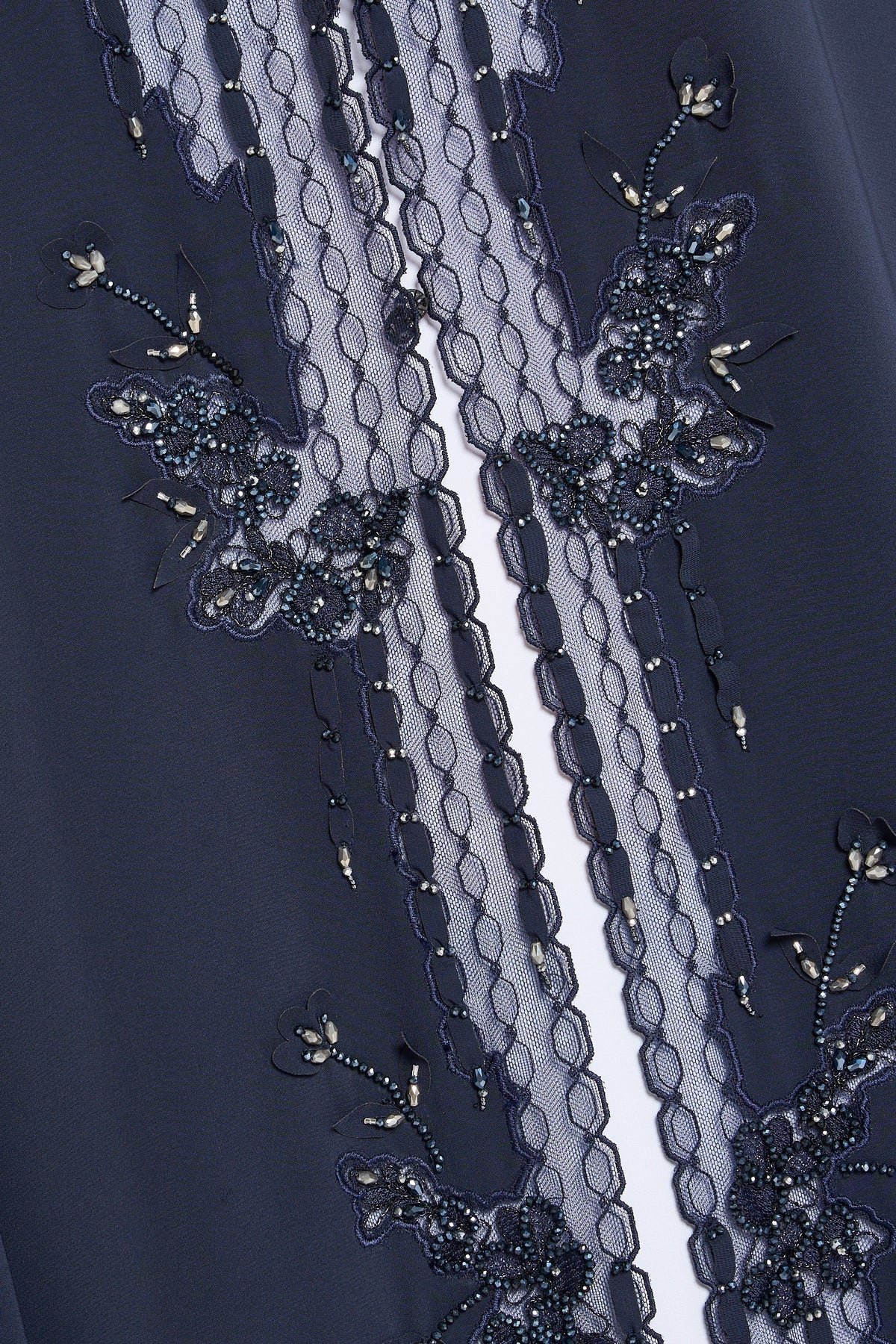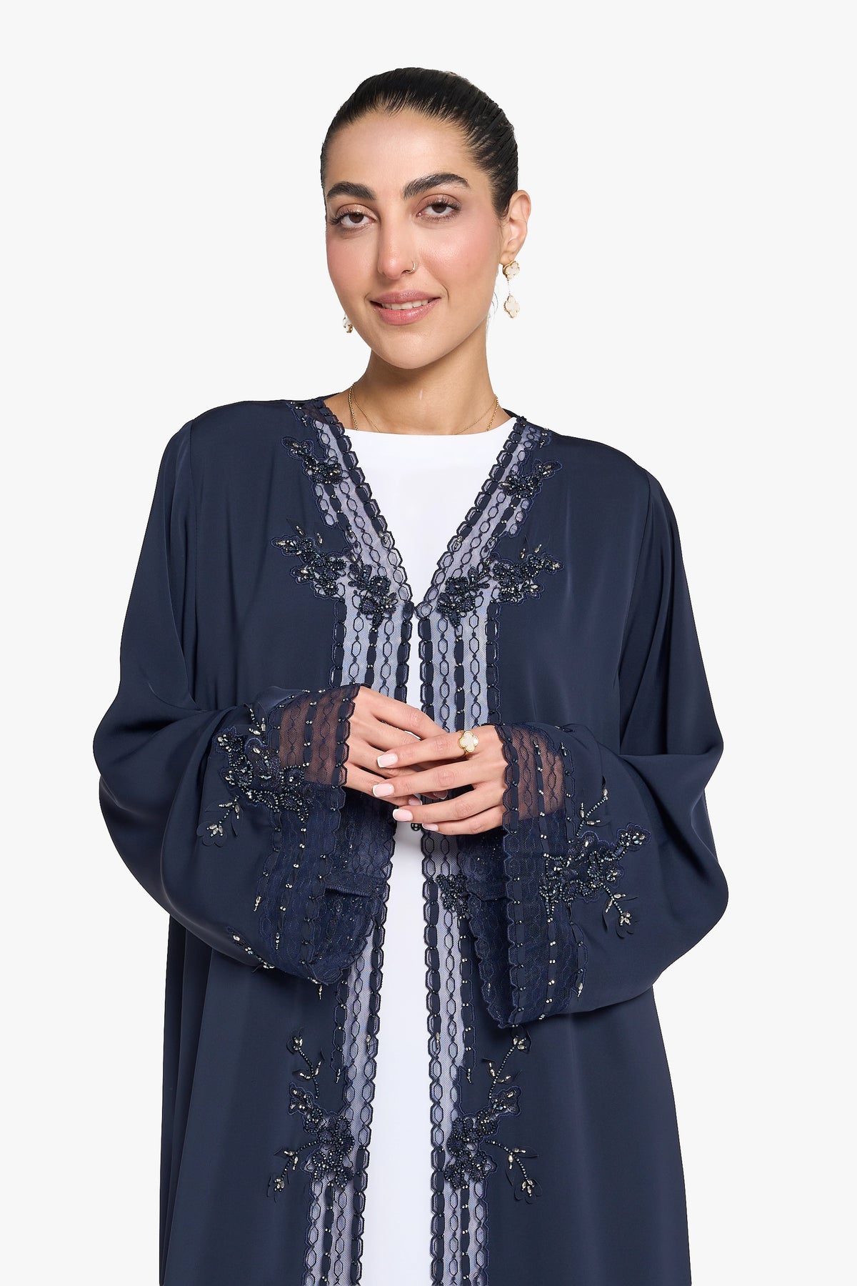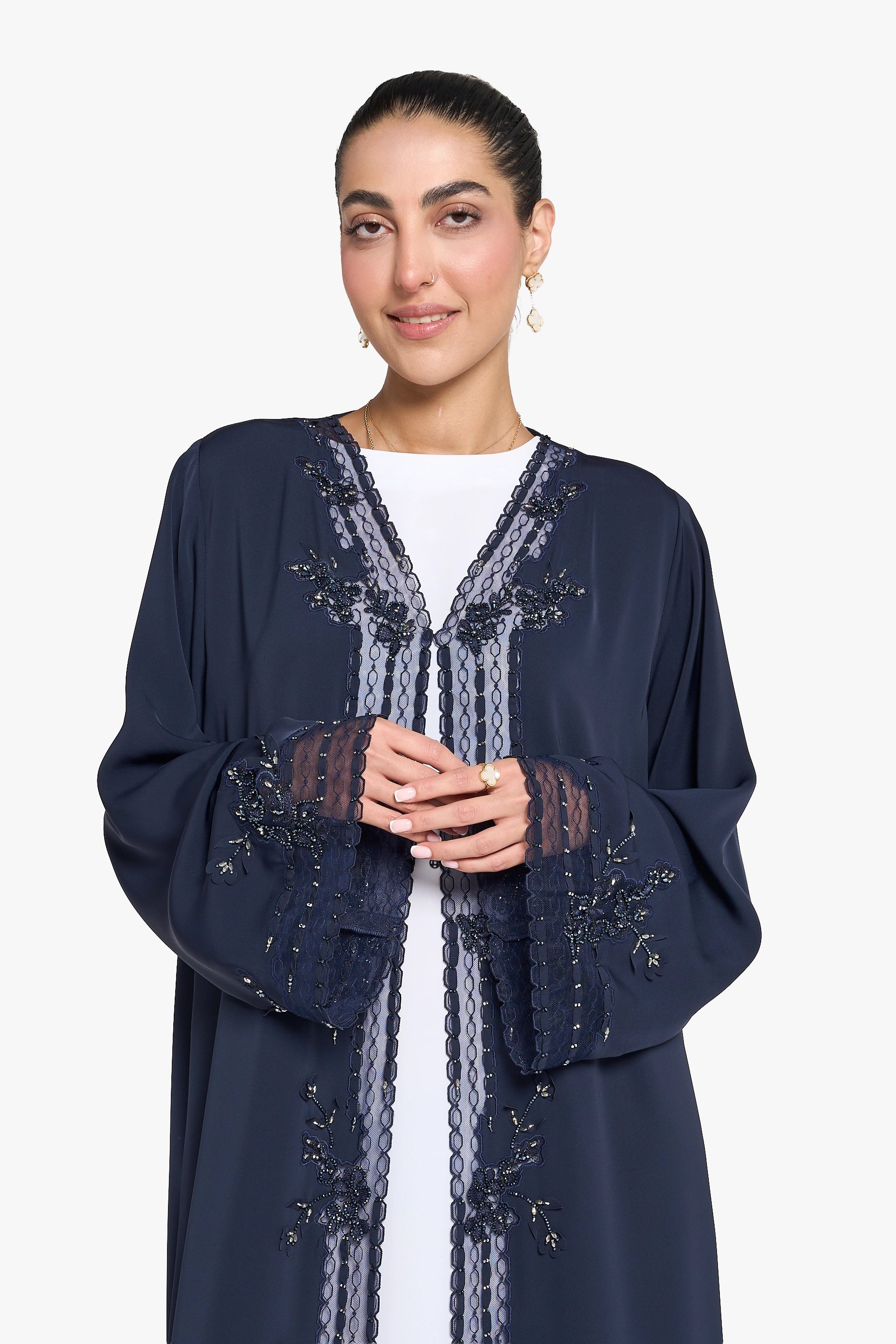 The Louzan VIP abaya, made from premium nida fabric, features intricate geometric dori embroidery complemented by delicate organza ribbons and sparkling crystal beads. This design achieves a harmonious balance of modesty and elegance while introducing a modern edge, ideal for those seeking refined sophistication with contemporary style.