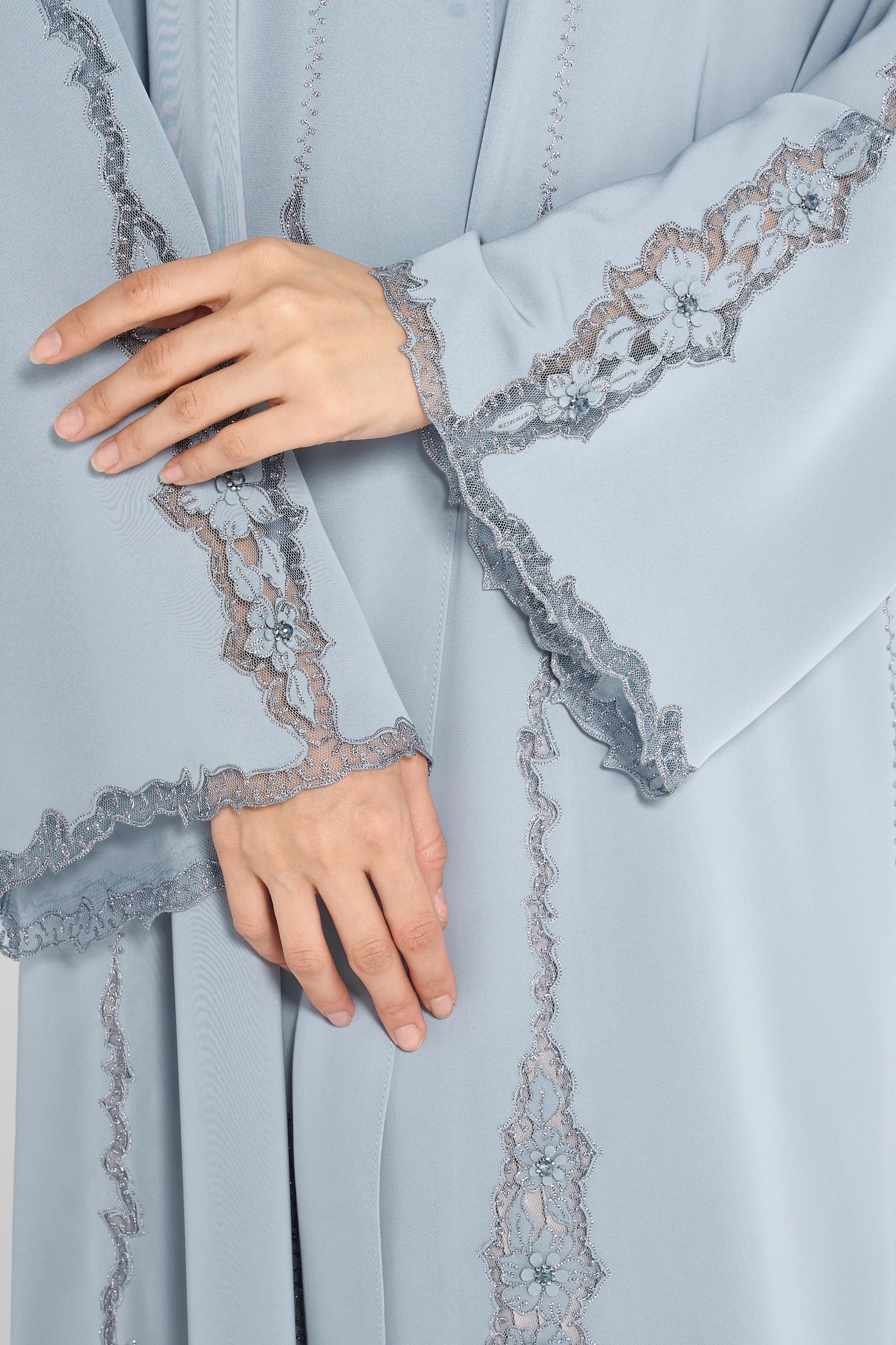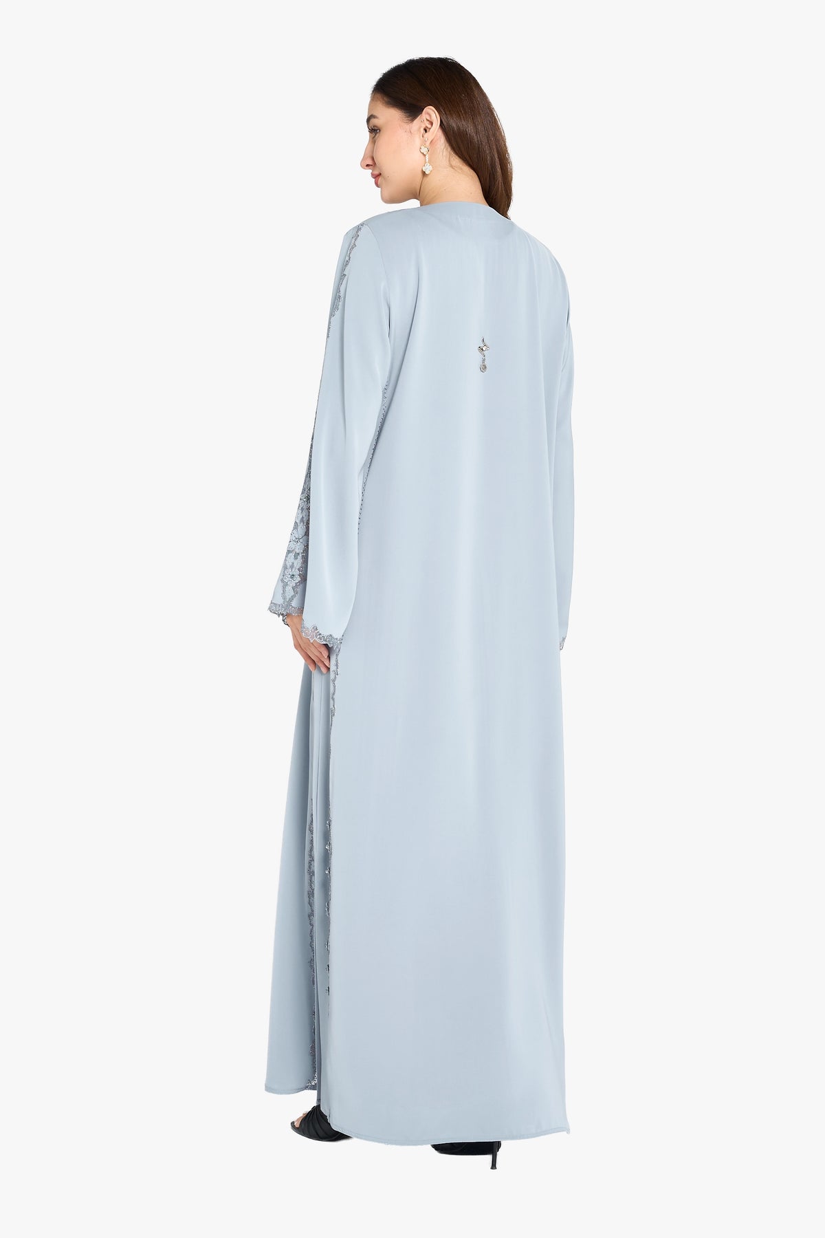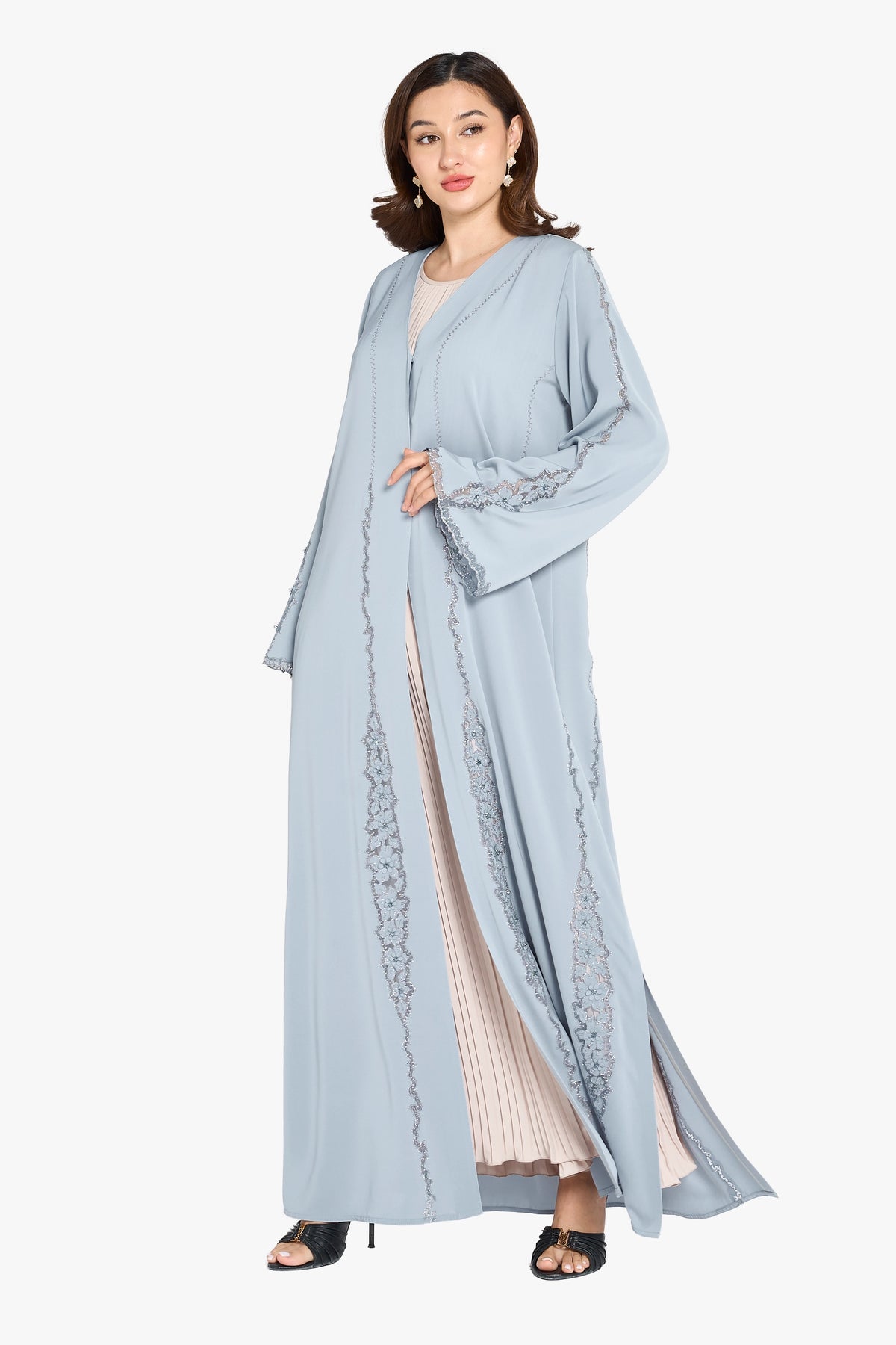Louzan abaya showcases premium colored nida fabric, enhanced by an intricate laser-cut floral design. Expertly crafted using the traditional aari embroidery technique, it is elegantly adorned with crystals and beads, offering a refined blend of sophistication and artisanal detail perfect for formal occasions.