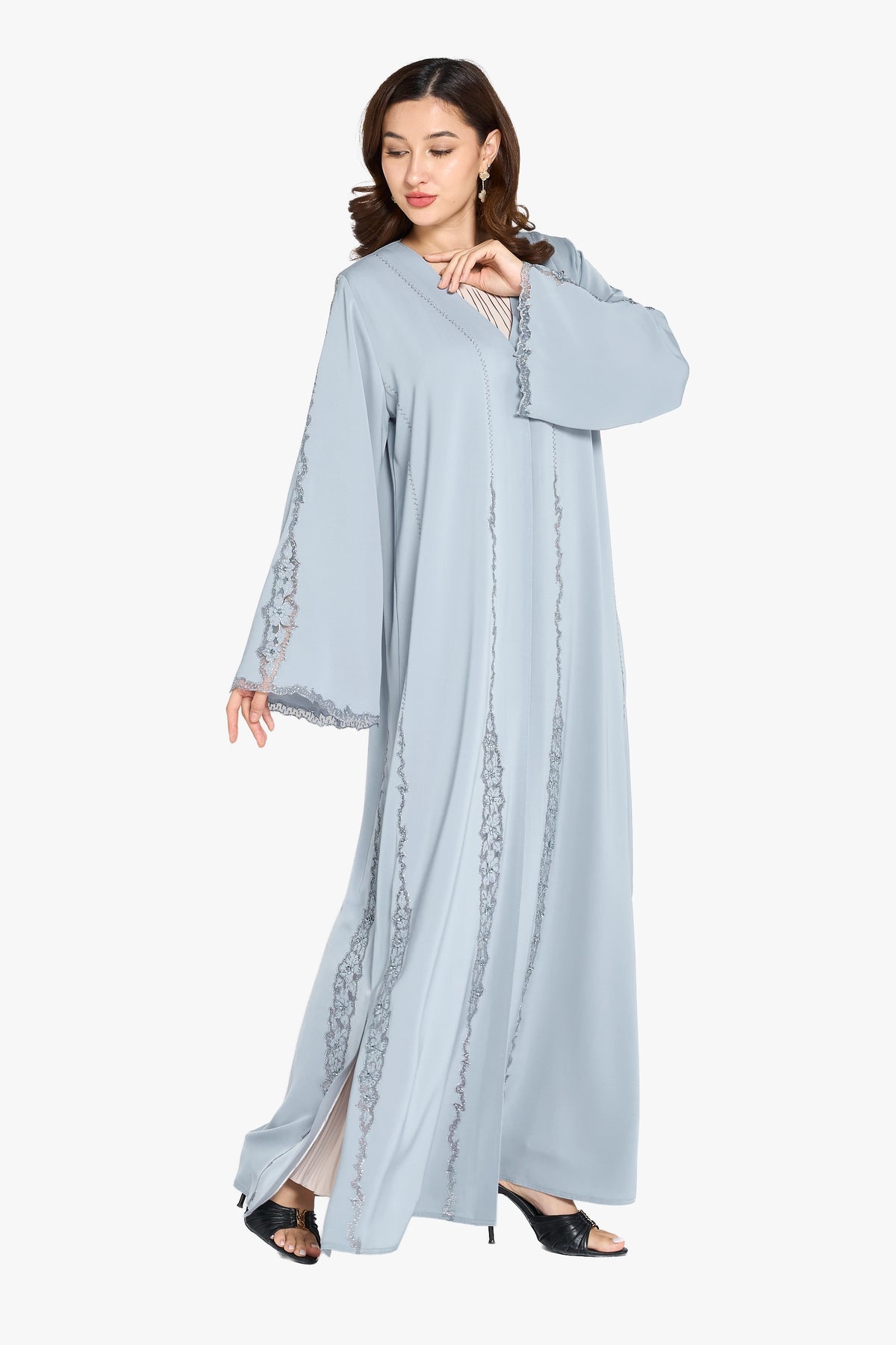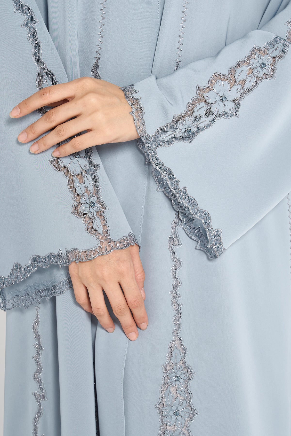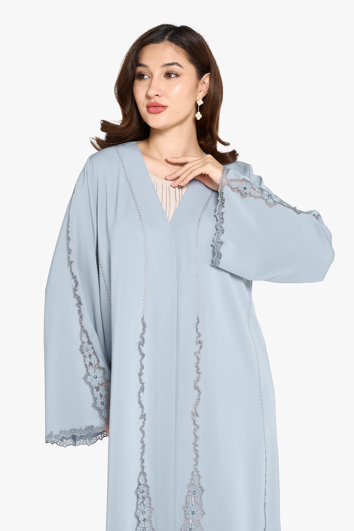 Louzan abaya showcases premium colored nida fabric, enhanced by an intricate laser-cut floral design. Expertly crafted using the traditional aari embroidery technique, it is elegantly adorned with crystals and beads, offering a refined blend of sophistication and artisanal detail perfect for formal occasions.