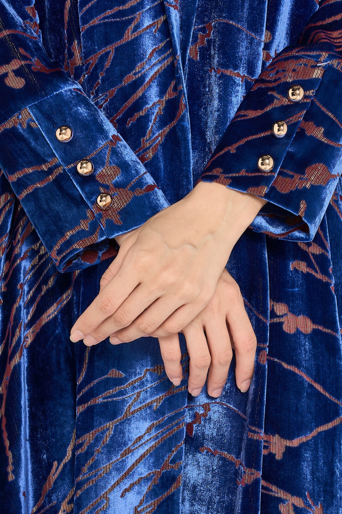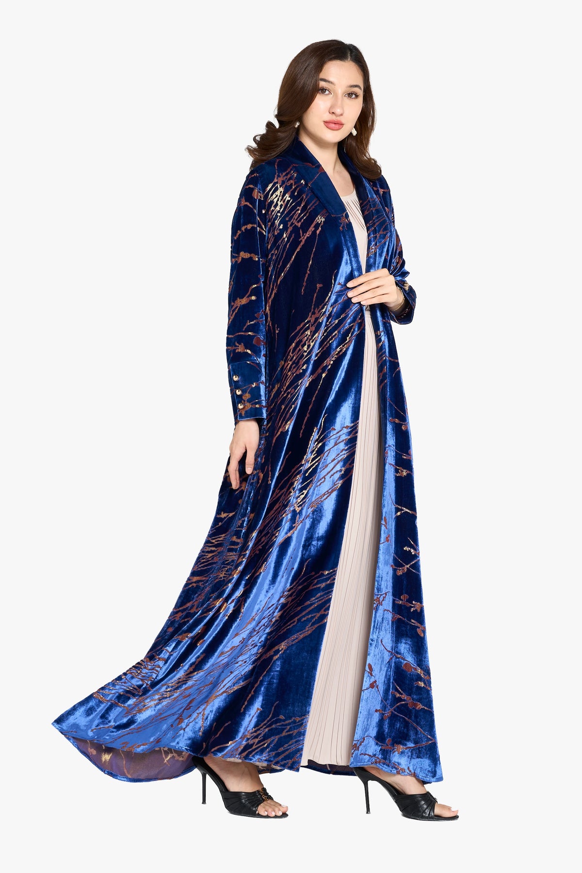 Experience refined elegance with the Louzan abaya, expertly crafted from soft pure velvet jacquard fabric. Its luxurious texture ensures comfort while the shawl collar and cuff detailing add sophisticated structure. Accented with gold metal buttons, this abaya merges timeless style with subtle opulence, perfect for elevating your wardrobe.