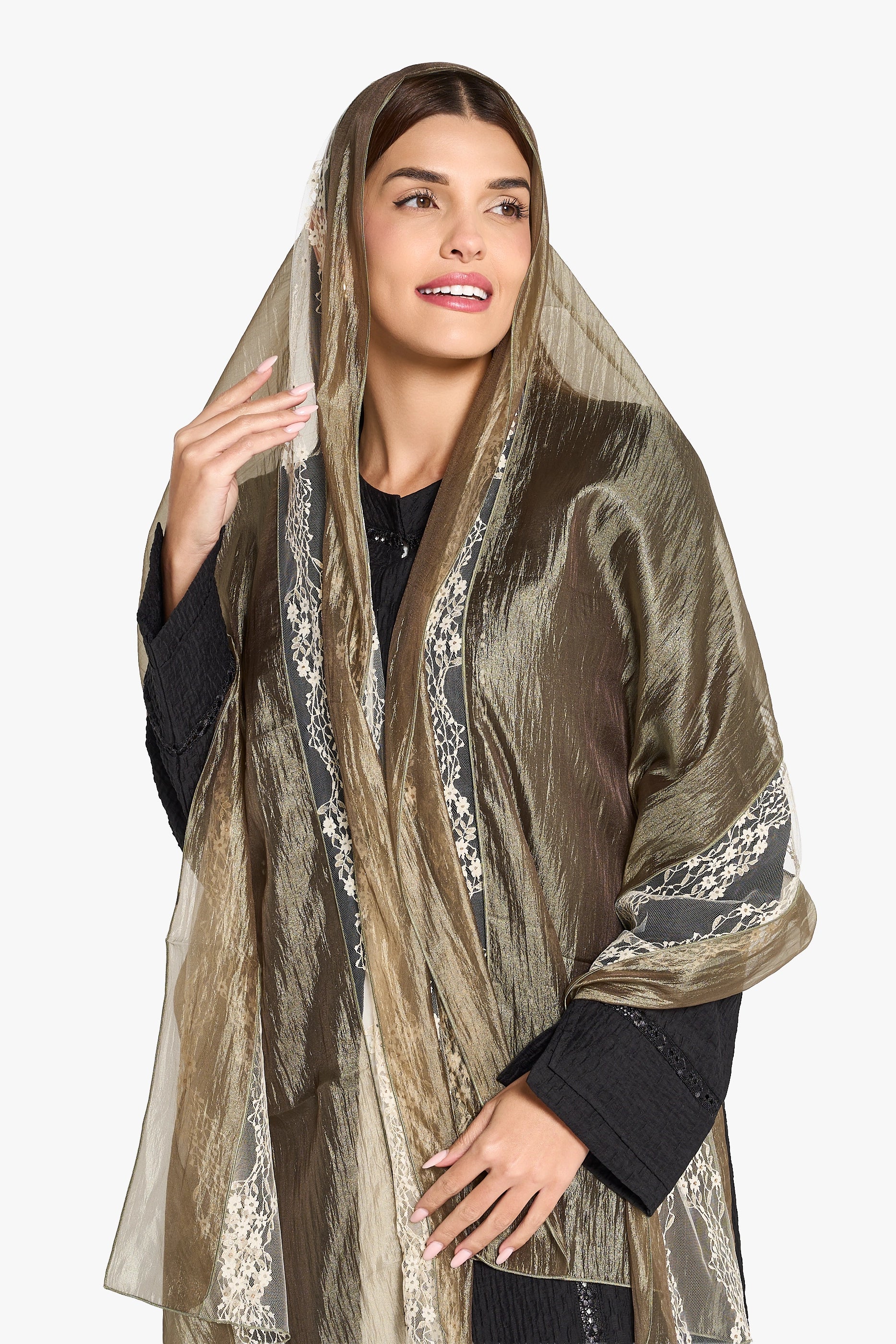 Elegant beige organza Sheila measuring 81 inches, perfect for creating graceful layered looks. This lightweight, sheer fabric drapes beautifully and works wonderfully for special occasions. Versatile enough to style with traditional or contemporary outfits.