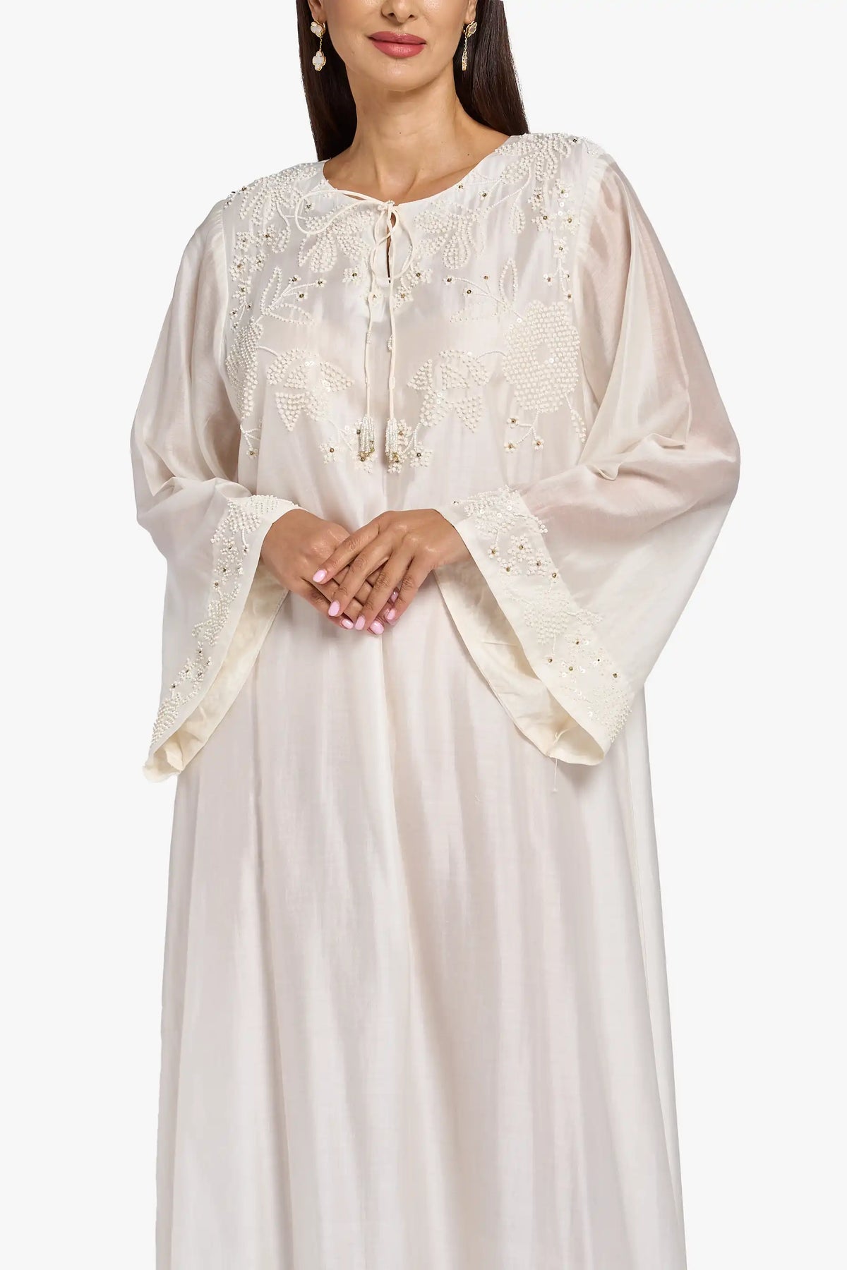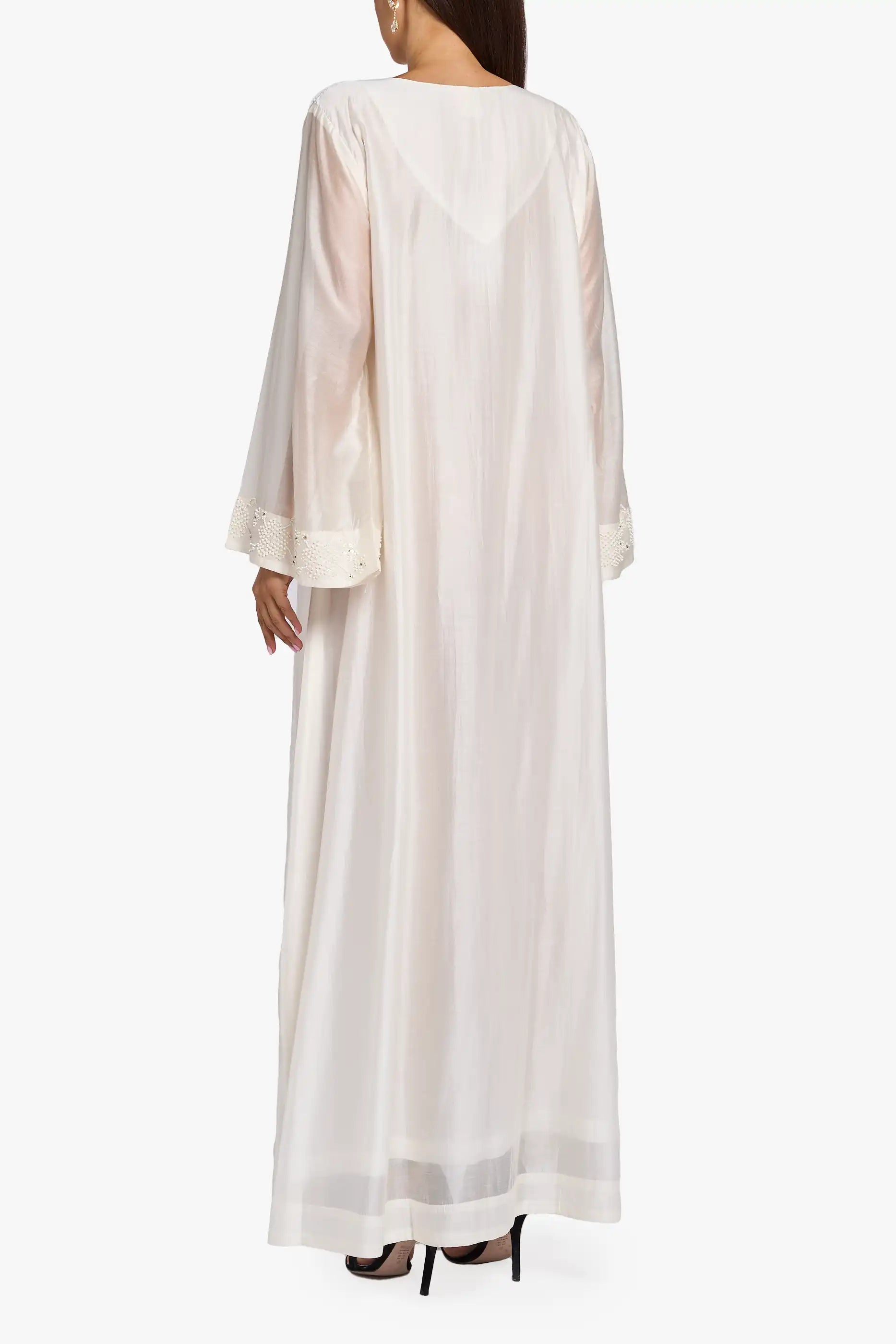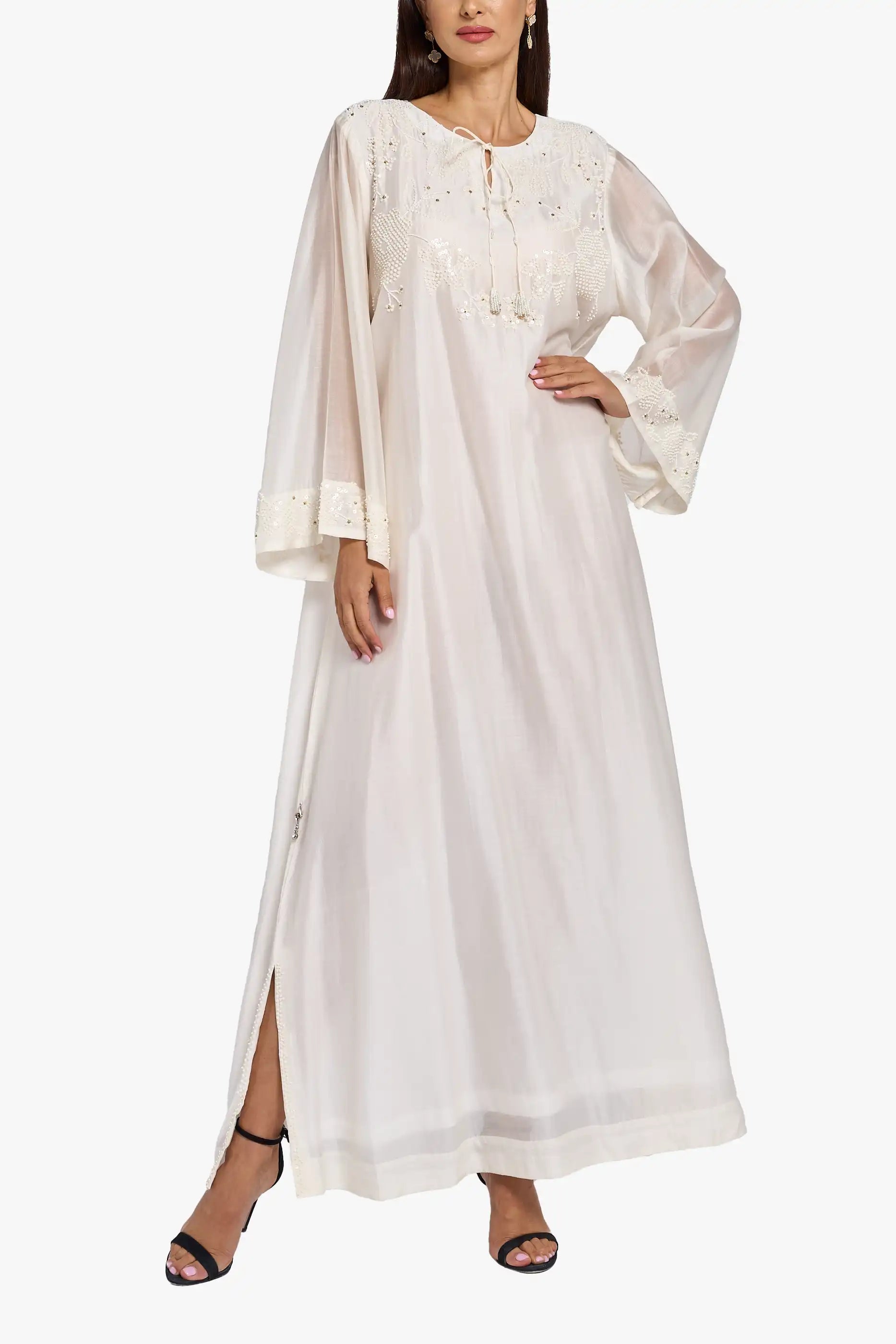 This kaftan comes in a white color. It has delicate handwork with sequins and beads on the neckline and sleeves. The design includes a side slit and a flowy, elegant look, making it perfect for special occasions.